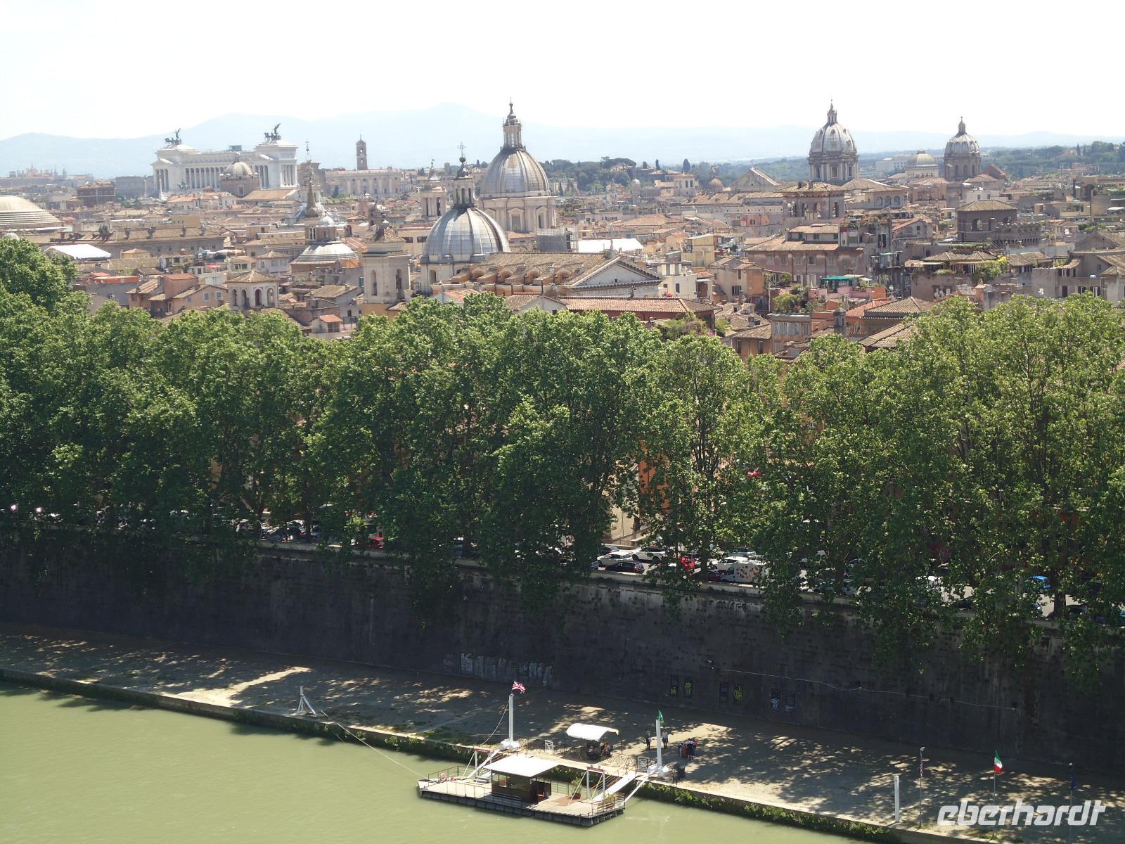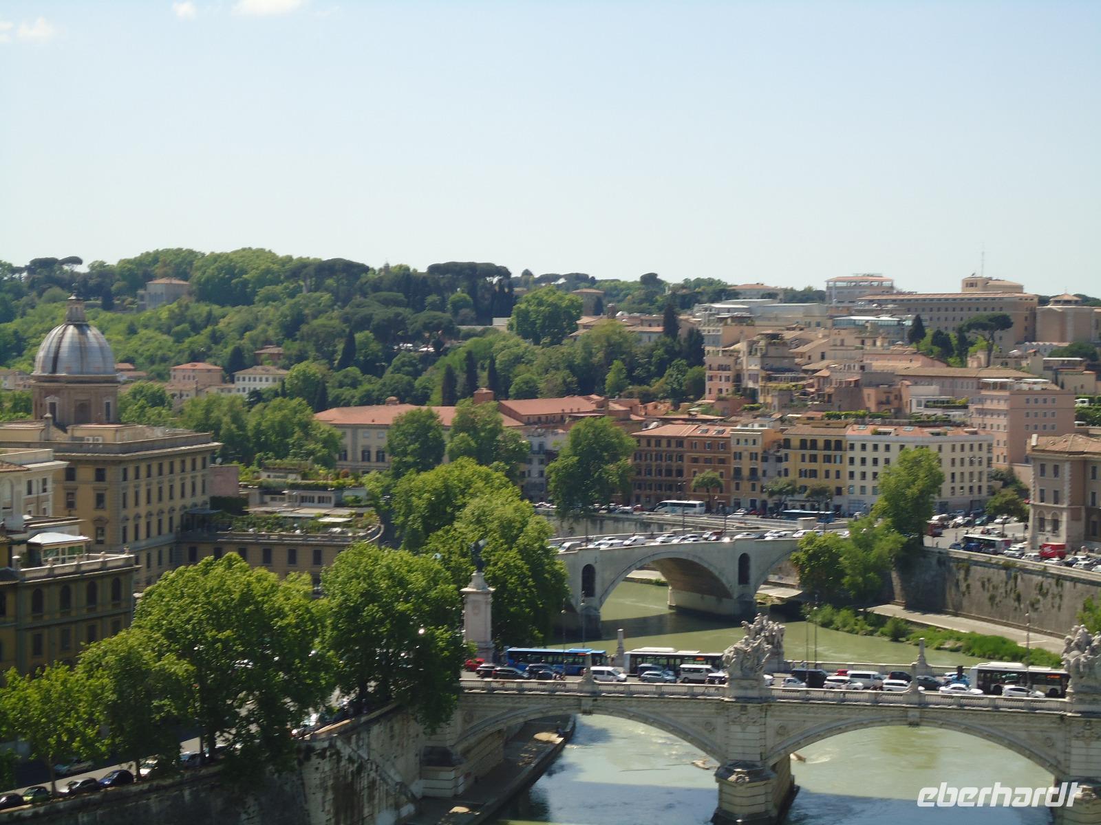 Nachdem wir uns alle wieder zusammengefunden haben, spazieren wir entlang des Passetto di Borgo, den im 13. Jahrhundert errichteten Fluchtweg der Päpste zwischen Vatikan und Engelsburg, hinüber zum Castel Sant' Angelo, dem ehemaligen Mausoleum des Kaisers Hadrian. Das Hadrianeum erhielt den heutigen Namen nach dem Engel, der Papst Gregor 590 über dem Mausoleum erschienen ist und in dem er das Schwert in die Scheide steckte, soll er das Ende der gerade wütenden Pest angekündigt haben. Die Bronzenachbildung dieses Angelo ist auf der Spitze des Mausoleums weithin sichtbar. Von der Plattform unterhalb des Engels wiederum hat man einen wunderschönen Blick auf Mamma Roma und den Petersdom. Wir nutzen ihn für die ein oder andere Fotoaufnahme. Danach möchten wir uns in der Cafeteria einfach nur noch fallen lassen, einen Espresso und die schöne Aussicht genießen bzw. eine Kleinigkeit essen. Da wir aber nicht die einzigen sind, die diesen Wunsch hegen, müssen wir leider weiterziehen.