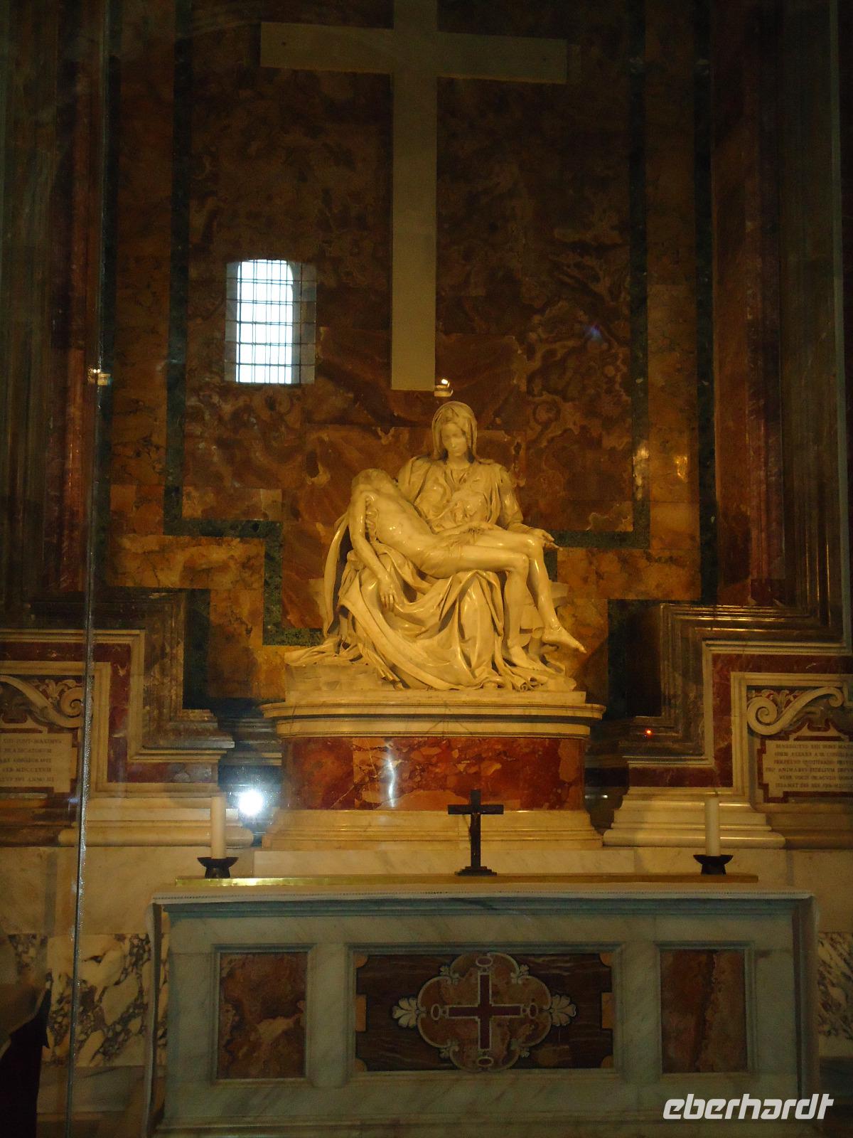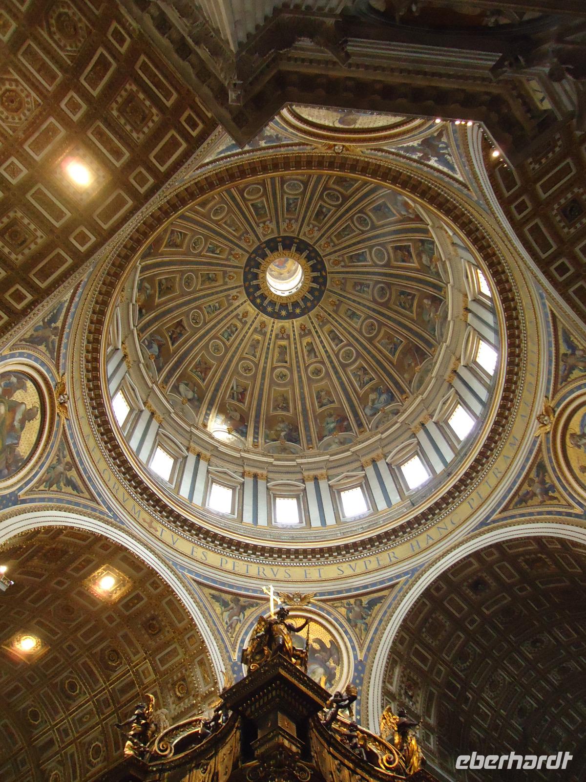 Gleich rechts erblicken wir im Schutze von Panzerglas Michelangelos ergreifende „Pieta". Danach laufen wir vorbei an den Gräbern der im Jahre 2014 heilig gesprochenen Päpste, Johannes Paul II. und Johannes XXIII., weiter vorbei an der Bronzestatue des hl. Petrus und dem Papstaltar mit dem Baldachin von Bernini (für ihn wurden die Bronzeplatten v. Pantheon eingeschmolzen). Wir bestaunen die Größe der Kuppel und sind einfach nur verzaubert und hingerissen von der Bauleistung und der Schönheit dieser Kirche (1506 wurde sie begonnen, nach 120 Jahren, also 1626, von Papst Urban VIII. eingeweiht).