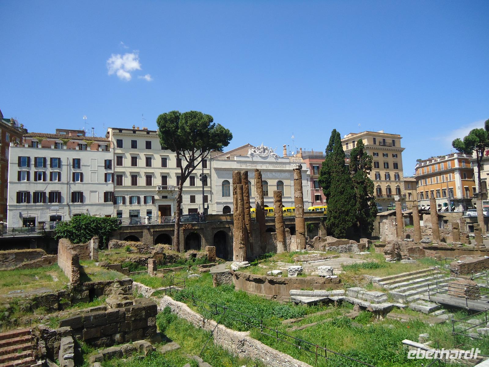 Über die Piazza del Campidoglio (von Michelangelo gestaltet), in deren Mitte der Kaiser Marc Aurel (Kopie) reitet, weiter über die ebenfalls von Michelangelo entworfene Rampentreppe (Scala Cordonata) erreichen wir die Piazza Venezia. Wir lassen den Platz, der von dem neoklassizistischen Nationaldenkmal „Monumento Nazionale Vittorio Emanuele II. (heute im Volksmund nur kurz „Schreibmaschine"oder „ Hochzeitstorte" genannt) ebenso beherrscht wird wie von dem Verkehrschaos, das von allen Seiten auf ihn zuschießt, „rechts liegen" und schlängeln uns weiter durch das Gewirr von Straßen, Gassen und Gässchen. Schließlich erreichen wir die AREA SACRA ARGENTINA. Hier befinden sich die Überreste der ältesten Tempel Roms (ca. 400 v. Chr.).