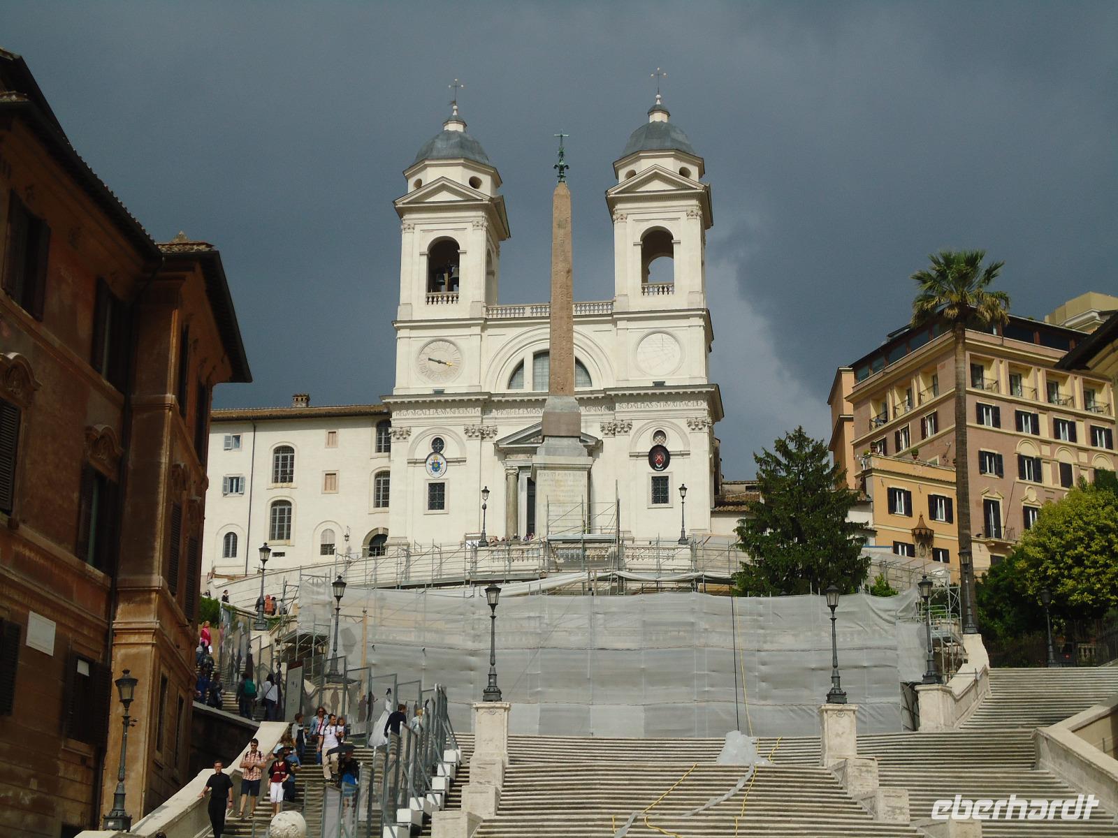 Nach einer kleinen Fotopause, die dann doch noch für ein „gelato" oder einen Blick in die Schaufenster der umliegenden Geschäfte reicht, spazieren wir weiter in Richtung Spanische Treppe. Hier endet für heute unsere Führung mit Sylvia. Natürlich erzählt sie uns noch, dass die Treppe eigentlich nach der am oberen Ende befindlichen Kirche genannt wurde und Scalinata delle Trinità d. Monti heißt und nur bei uns Deutschen „Spanische Treppe" (in Anlehnung an die angrenzende Piazza di Spagna) genannt wird. Gebaut wurde sie seinerzeit im Auftrag der Franzosen. Es ist eine Treppe, die weltweit bekannt ist (bezaubernd im April/Mai, wenn die Azaleenkübel aufgestellt werden), wo sich die Menschen aller Kontinente treffen und verstehen. 138 Stufen zum Flirten - Lesen - Leute gucken - oder einfach zum Ausruhen. Wir müssen uns heute allerdings ein anderes Plätzchen suchen, denn die Treppe unterliegt gerade einer „kosmetischen OP".