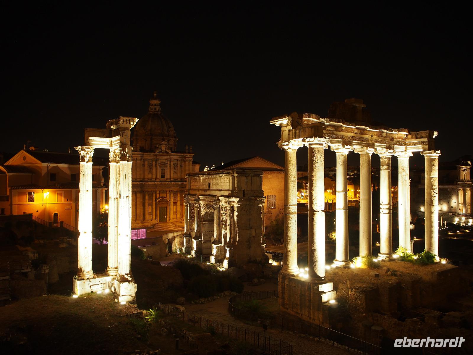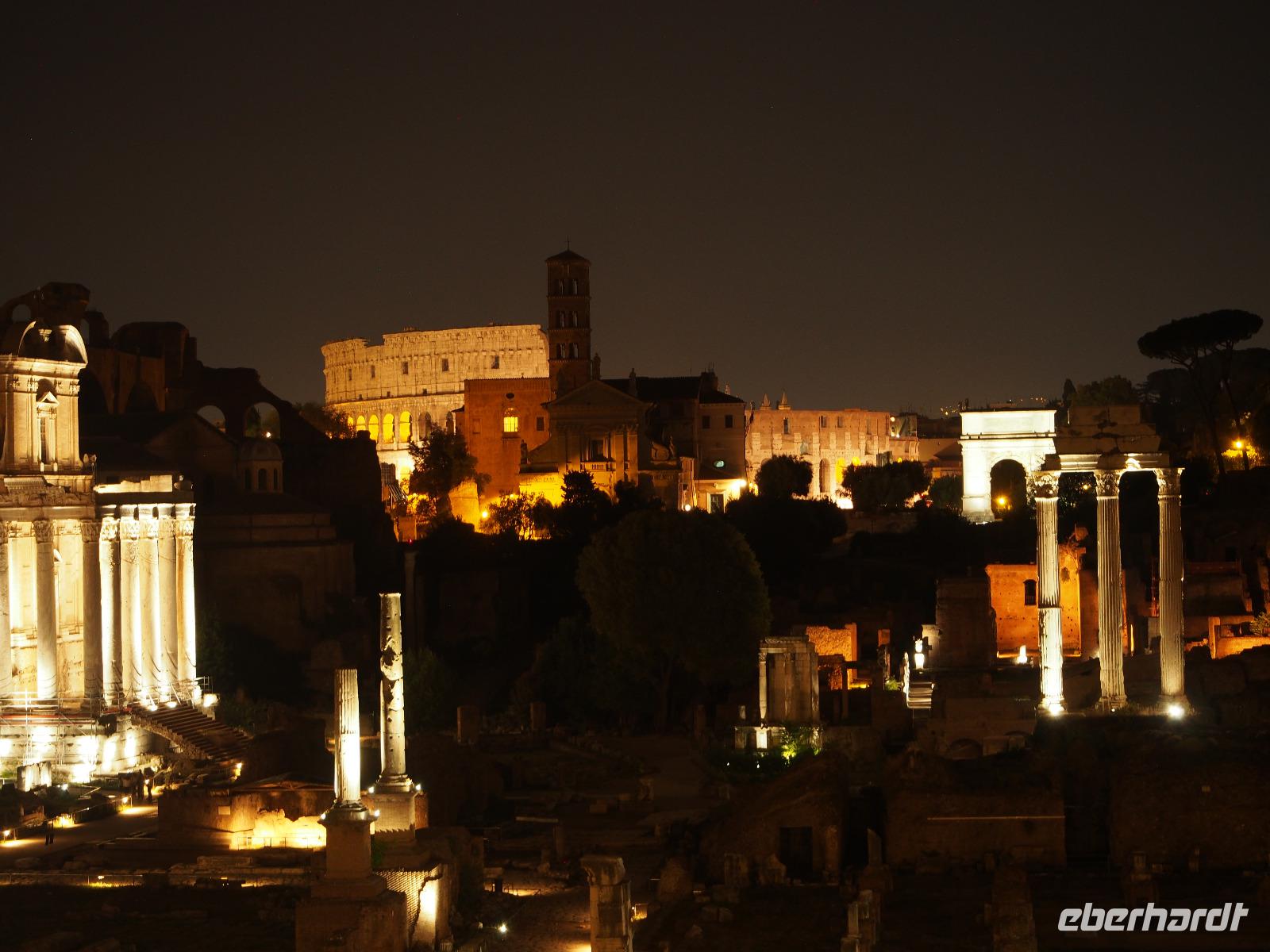 Am frühen Abend trafen wir uns alle im Hotel um mit dem Bus in den Stadtteil Trastevere zu fahren und dort unseren letzten gemeinsamen Abend bei einem gemütlichen Essen in einer traditionellen Osteria zu begehen. In geselliger Runde ließen wir die Eindrücke der letzten Tage Revue passieren. Die große Überraschung erfolgte, als Sylvia schließlich noch einmal zu uns stieß, um uns mit auf eine gemeinsame nächtliche Busrundfahrt durch ihre Wahlheimat zu nehmen. Besonders der Ausstieg am Kapitol und der wunderschöne Blick, der sich uns von dort auf die beleuchteten Ruinen des Forum Romanum bot, löste bei allen große Begeisterung aus. Vorbei am Regierungspalast, dem Quirinal, der Hauptkirche Santa Maria Maggiore und dem Kolosseum, ging es schließlich wieder zurück Richtung Hotel.