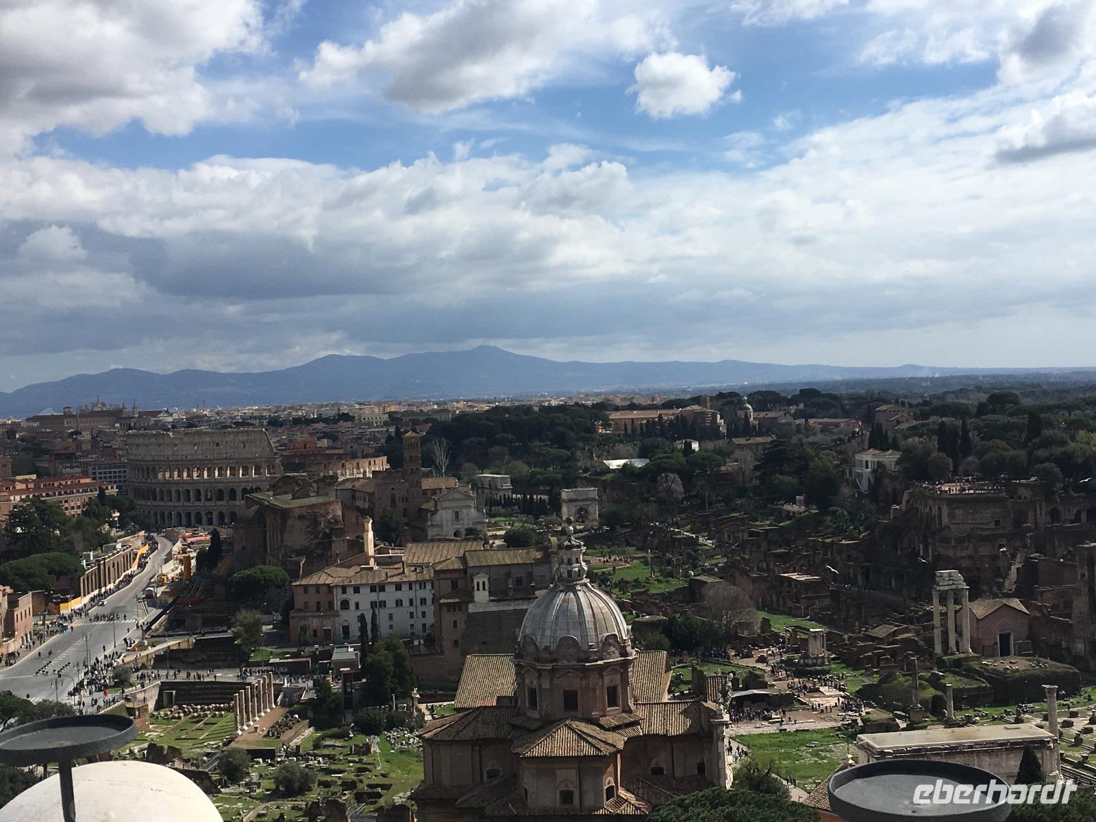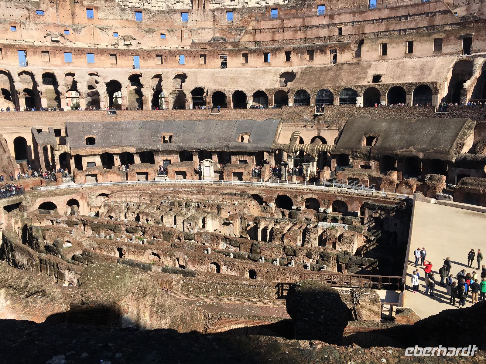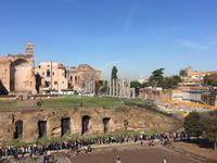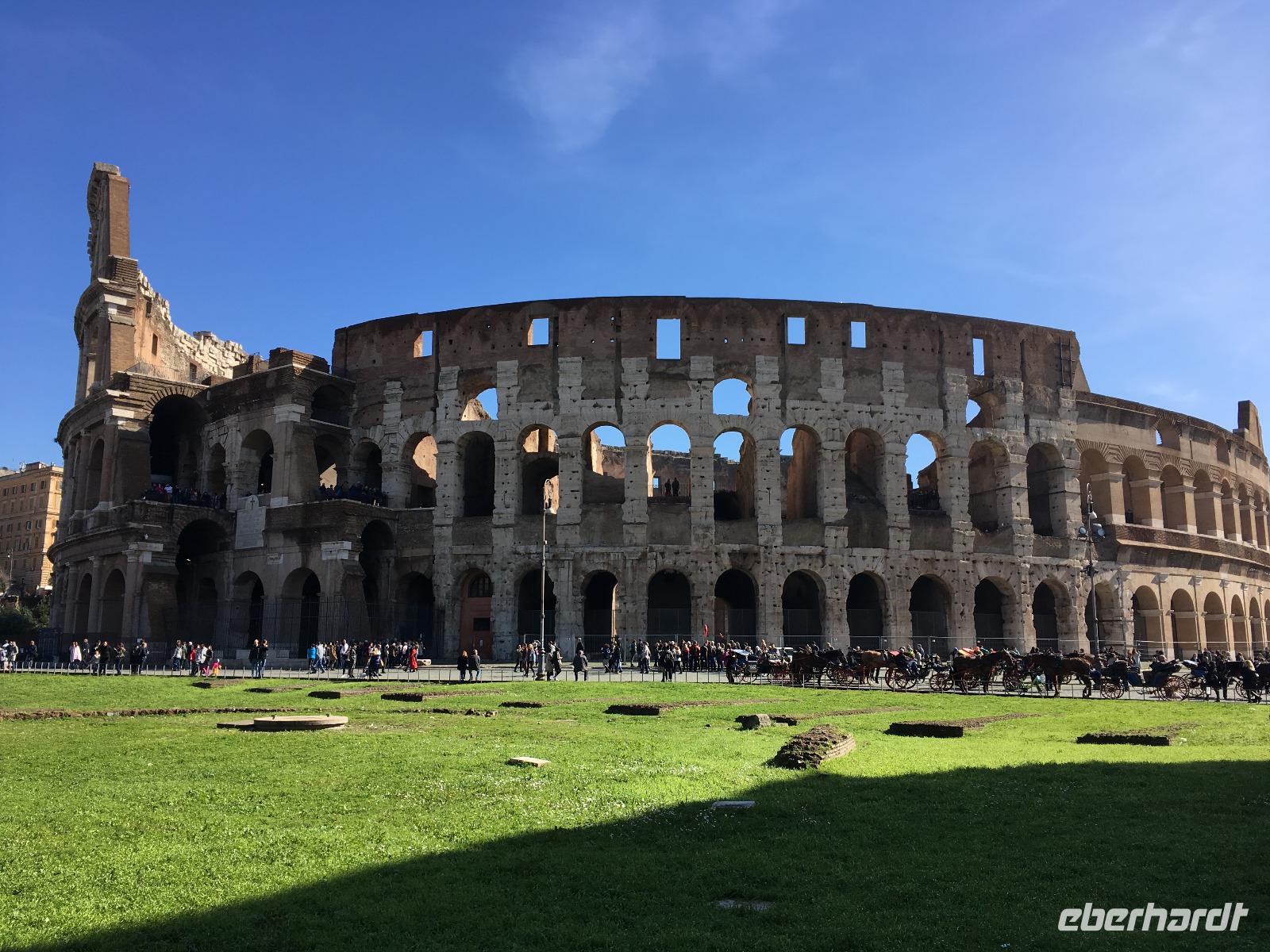 Der heutige Tag begann mit einer kurzfristigen Zeitenänderung am Morgen, da für heute der letzte Tag des öffentlichen Streiks aller Nahverkehrsmittel in Rom geplant war. Nichts desto trotz haben wir es geschafft, die letzten Bahnen- reingepresst wie die Ölsardinen - zum Colosseum zu erreichen. Dort nahm uns die Reiseleiterin Silvia für die nächsten drei Tage in Empfang. Wir starteten heute sonnig und mit blauem Himmel in den Tag. Zunächst stand die Innenbesichtigung des Colosseum, dem größten Amphitheater des antiken Roms auf dem Programm. Das heutige Wahrzeichen der Stadt wurde bereits zwischen 72 und 80 n. Chr. als Austragungsort für brutale Veranstaltungen zur Belustigung und Unterhaltung der Mitglieder des Kaiserhauses und der Bevölkerung zu freiem Eintritt genutzt. Das noch gut erhaltene Panorama des Innenraums lässt uns erahnen, wie diese Feierlichkeiten damals ausgetragen wurden. Ein Spaziergang von wenigen Minuten führte uns in das Forum Romanum, wo man die Ruinen des alten Rom bestaunen kann. Durch Silvias visuellen Erläuterungen und Darstellungen aus Ihrem Buch, versetzten wir uns leicht in die damalige Zeit. Von diesem Forum aus wurden alle wirtschaftlichen, politischen, kulturellen und religiösen Belange gelebt. Die Ruinen liegen inmitten der drei Stadthügel Palatin, Kapitol und Esquilin. Nach dem ersten Teil des antiken Roms legten wir eine wohltuende Mittagspause hinter dem Colosseum ein. Im Anschluss ging es weiter zu Fuß zu den Caracall-Thermen, den antiken Badeanlagen mit gut erhaltenen Mosaikböden. Da unsere Füße allmählich immer müder wurden einigten wir uns darauf das Programm nicht, wie ursprünglich geplant an der Tiber Insel enden zu lassen, sondern an dem berühmten Circus Maximus. Dort fanden auf einer Länge von 600 Metern öffentliche Wagenrennen auf Staatskosten und zur Unterhaltung der Bevölkerung statt. Die Fahrt zum Hotel konnte zum Glück wieder mit der Metro bestritten werden, da die Streiks früher als geplant endeten.