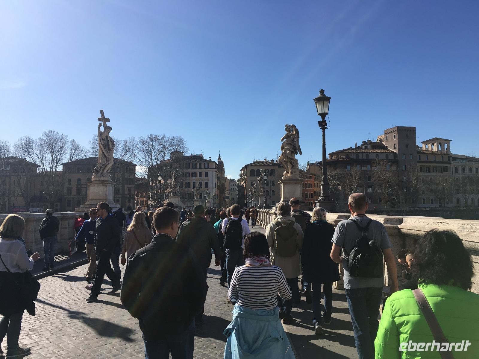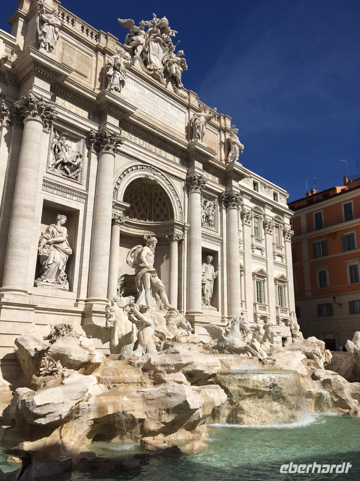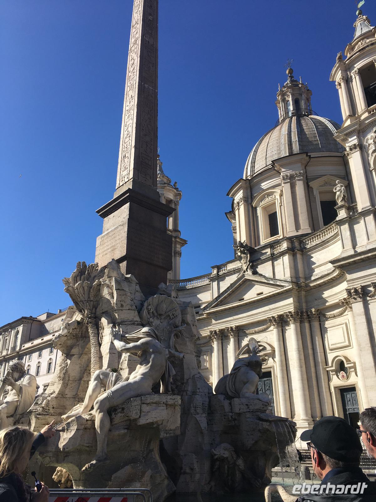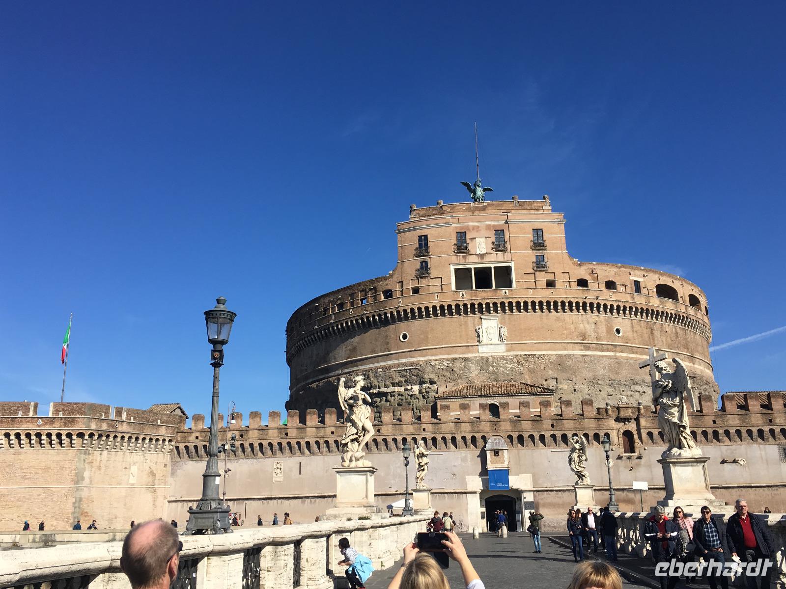 Heute durften alle Gäste ein wenig ausschlafen! Mit dem Bus fuhren wir zur Engelsburg, an welcher Silvia allerdings auf der anderen Seite wartete. Doch uns störte das nicht sonderlich, da wir die Sonnenstrahlen am Morgen genossen. Die Führung der Innenstadt ging über die Engelsbrücke mit einem tollen Blick auf den Petersdom in Richtung Piazza Navona, der Platz mit dem berühmten Brunnen der vier Flüsse. Doch wir blieben nicht lange unentdeckt! Am Straßenrand nahmen wir Luftküsse von einem Charlie Chaplin Double entgegen. Nur wenige Meter entfernt kehrten wir in das katholische Pantheon ein. Silvia fragte uns, ob es wohl durch das Loch im Dach rein regnet oder nicht. Die Fragestellung müsste eigentlich darauf hinauslaufen das es nicht rein regnet, aber natürlich tut es das, es ist ja schließlich eine freie Öffnung. Den Piazza Venezia rechts liegen gelassen schlenderten wir zum berühmten Trevi-Brunnen. Die Sonne spiegelte sich im glasklaren Wasser und Reisebegleiterin Laura spendierte im Namen von Eberhardt Travel ein typisch italienisches Gelatie. Als letzter Besichtigungspunkt stand die spanische Treppe nur ein paar Meter vom Brunnen im Mittelpunkt. Diese hat Ihren Namen viel mehr von der spanischen Botschaft links von Ihr und wurde 1732 herabführend von der Kirche Santa Trinitá die Monti zum Piazza di Spagna erbaut. Von dort aus konnte man individuell die Stadt weiter erkunden. Viele Gäste schlenderten entlang der Via del Corso zu dem Nationaldenkmal am Piazza Venezia. Nach den zahlreichen Treppen und der kurzen Fahrt mit dem Lift hatte man einen atemberaubenden Blick auf die Stadt am Tiber von weit oben. Jeder kehrte am Nachmittag beziehungsweise Abend auf eigene Faust zum Hotel zurück.