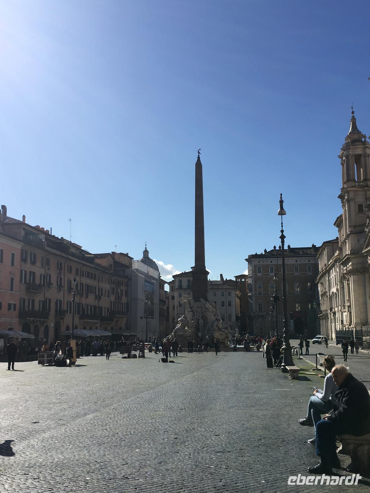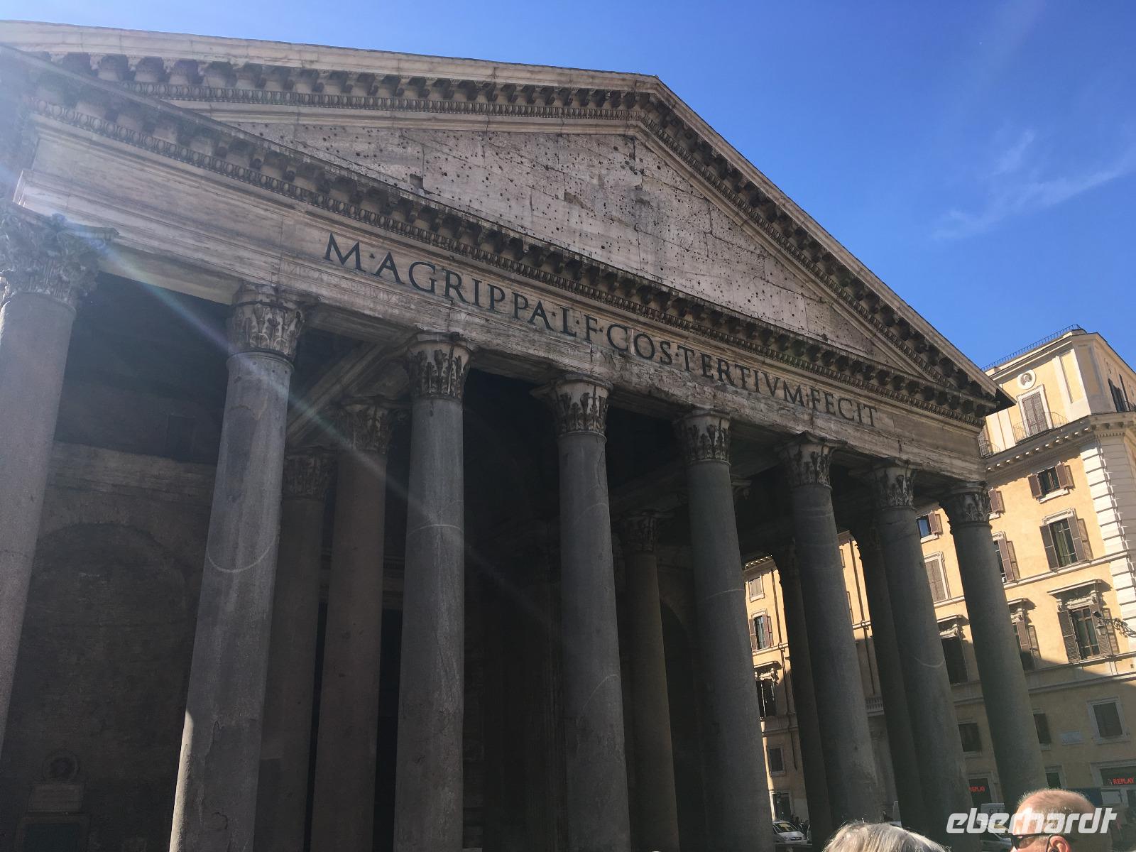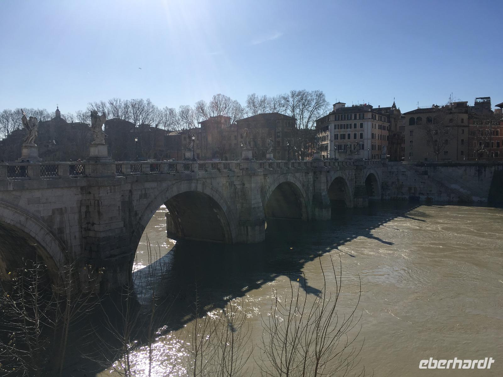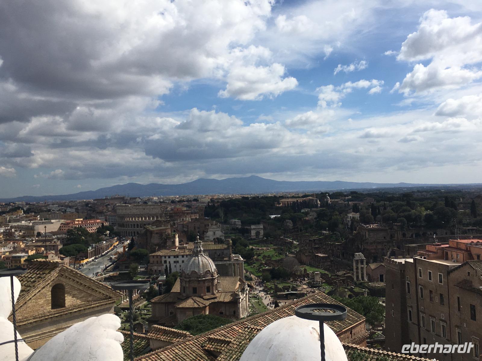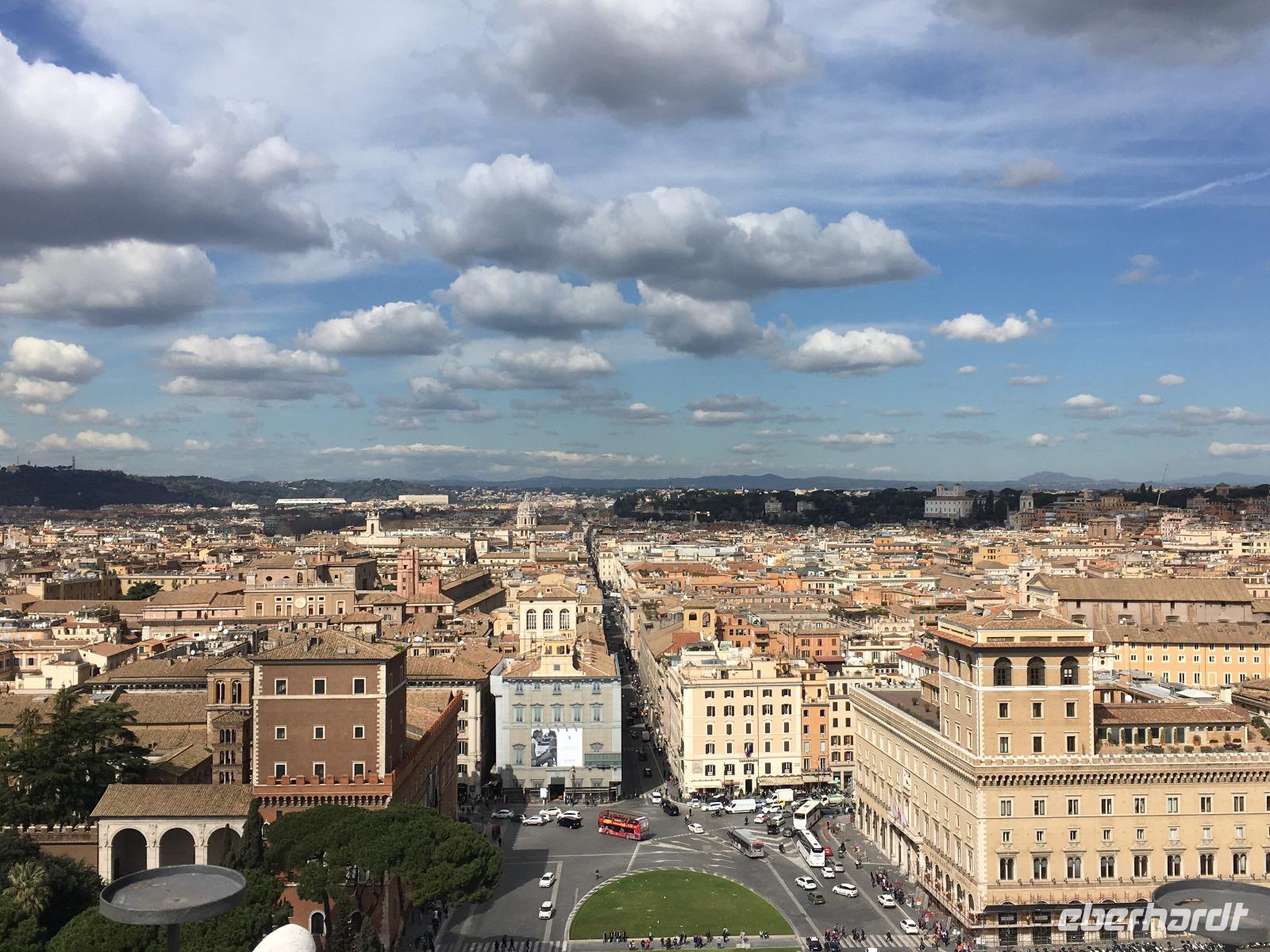 Heute durften alle Gäste ein wenig ausschlafen! Mit dem Bus fuhren wir zur Engelsburg, an welcher Silvia allerdings auf der anderen Seite wartete. Doch uns störte das nicht sonderlich, da wir die Sonnenstrahlen am Morgen genossen. Die Führung der Innenstadt ging über die Engelsbrücke mit einem tollen Blick auf den Petersdom in Richtung Piazza Navona, der Platz mit dem berühmten Brunnen der vier Flüsse. Doch wir blieben nicht lange unentdeckt! Am Straßenrand nahmen wir Luftküsse von einem Charlie Chaplin Double entgegen. Nur wenige Meter entfernt kehrten wir in das katholische Pantheon ein. Silvia fragte uns, ob es wohl durch das Loch im Dach rein regnet oder nicht. Die Fragestellung müsste eigentlich darauf hinauslaufen das es nicht rein regnet, aber natürlich tut es das, es ist ja schließlich eine freie Öffnung. Den Piazza Venezia rechts liegen gelassen schlenderten wir zum berühmten Trevi-Brunnen. Die Sonne spiegelte sich im glasklaren Wasser und Reisebegleiterin Laura spendierte im Namen von Eberhardt Travel ein typisch italienisches Gelatie. Als letzter Besichtigungspunkt stand die spanische Treppe nur ein paar Meter vom Brunnen im Mittelpunkt. Diese hat Ihren Namen viel mehr von der spanischen Botschaft links von Ihr und wurde 1732 herabführend von der Kirche Santa Trinitá die Monti zum Piazza di Spagna erbaut. Von dort aus konnte man individuell die Stadt weiter erkunden. Viele Gäste schlenderten entlang der Via del Corso zu dem Nationaldenkmal am Piazza Venezia. Nach den zahlreichen Treppen und der kurzen Fahrt mit dem Lift hatte man einen atemberaubenden Blick auf die Stadt am Tiber von weit oben. Jeder kehrte am Nachmittag beziehungsweise Abend auf eigene Faust zum Hotel zurück.