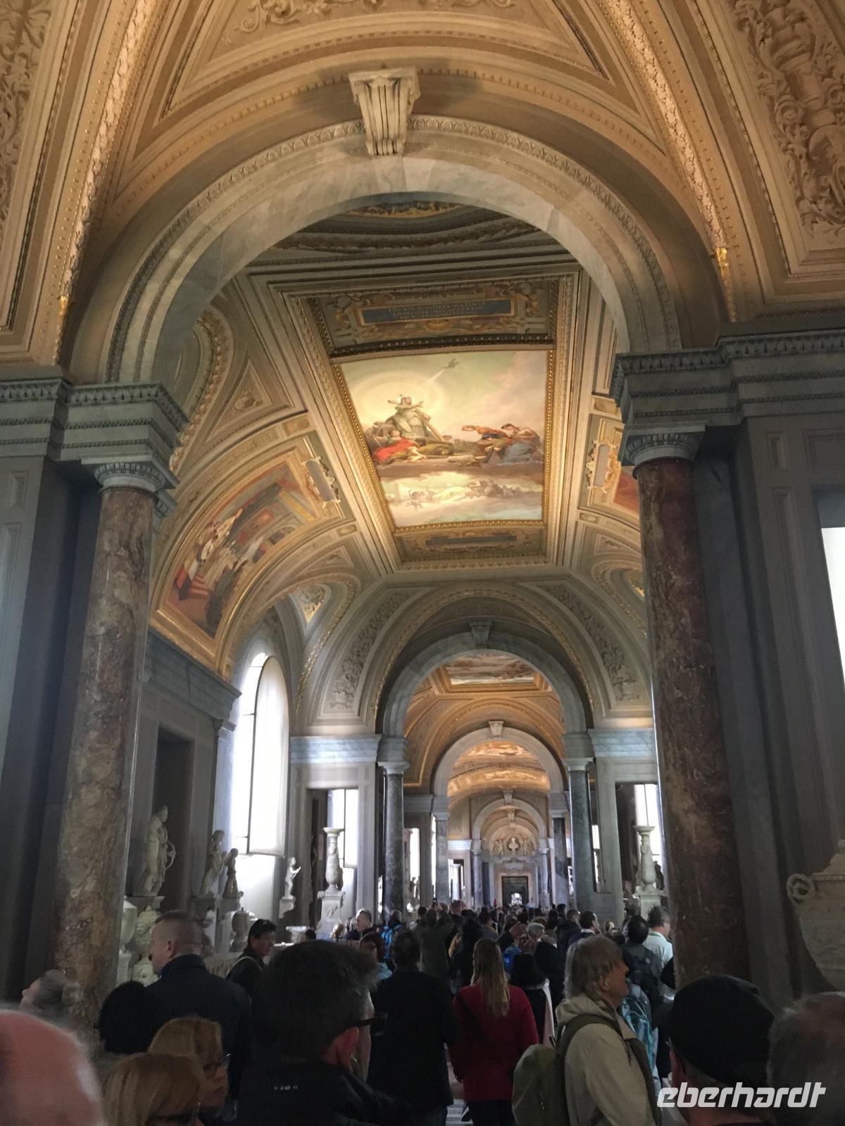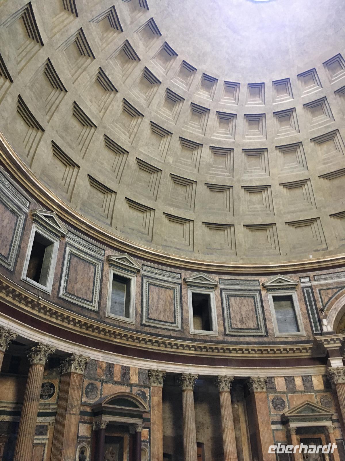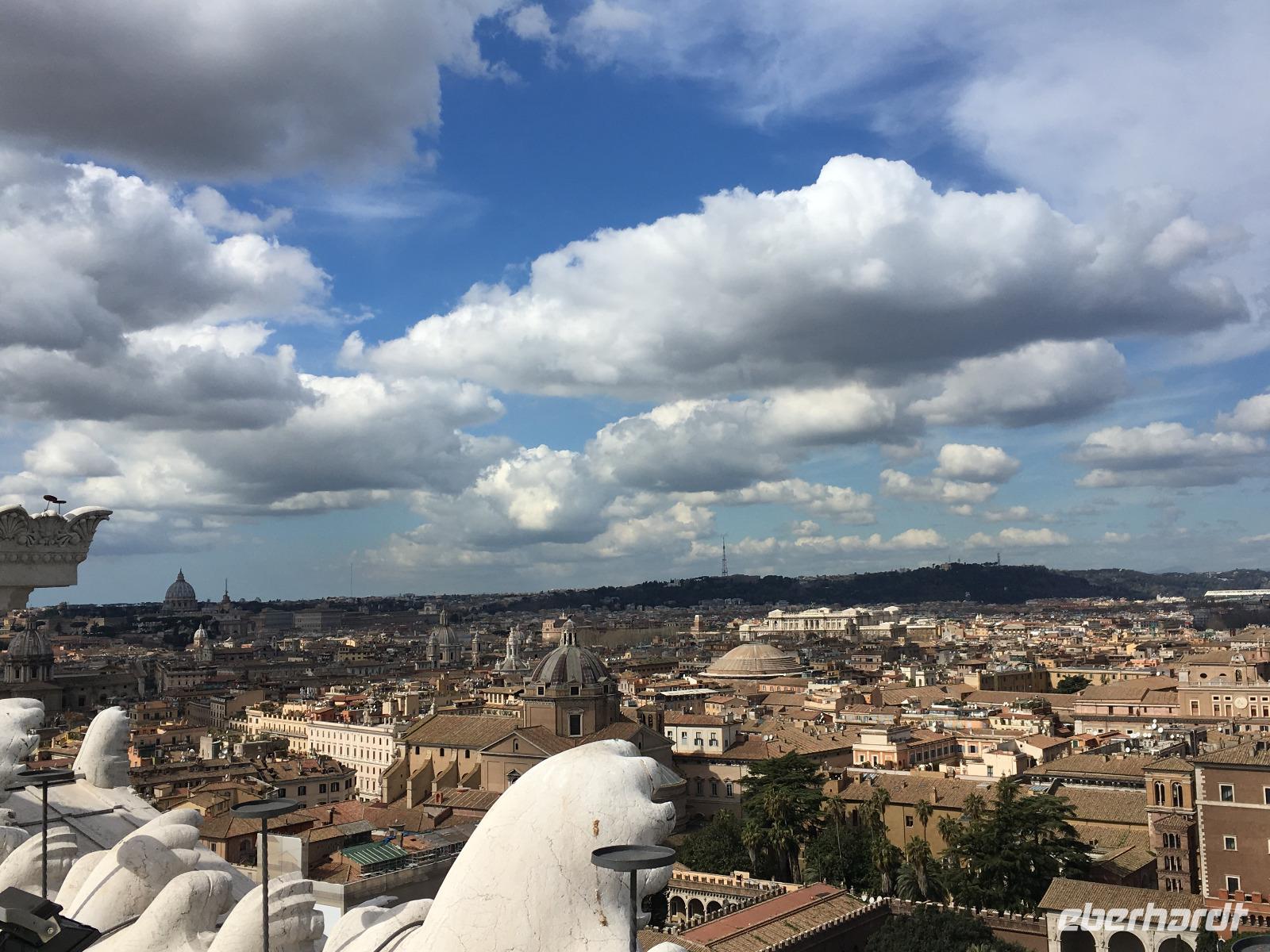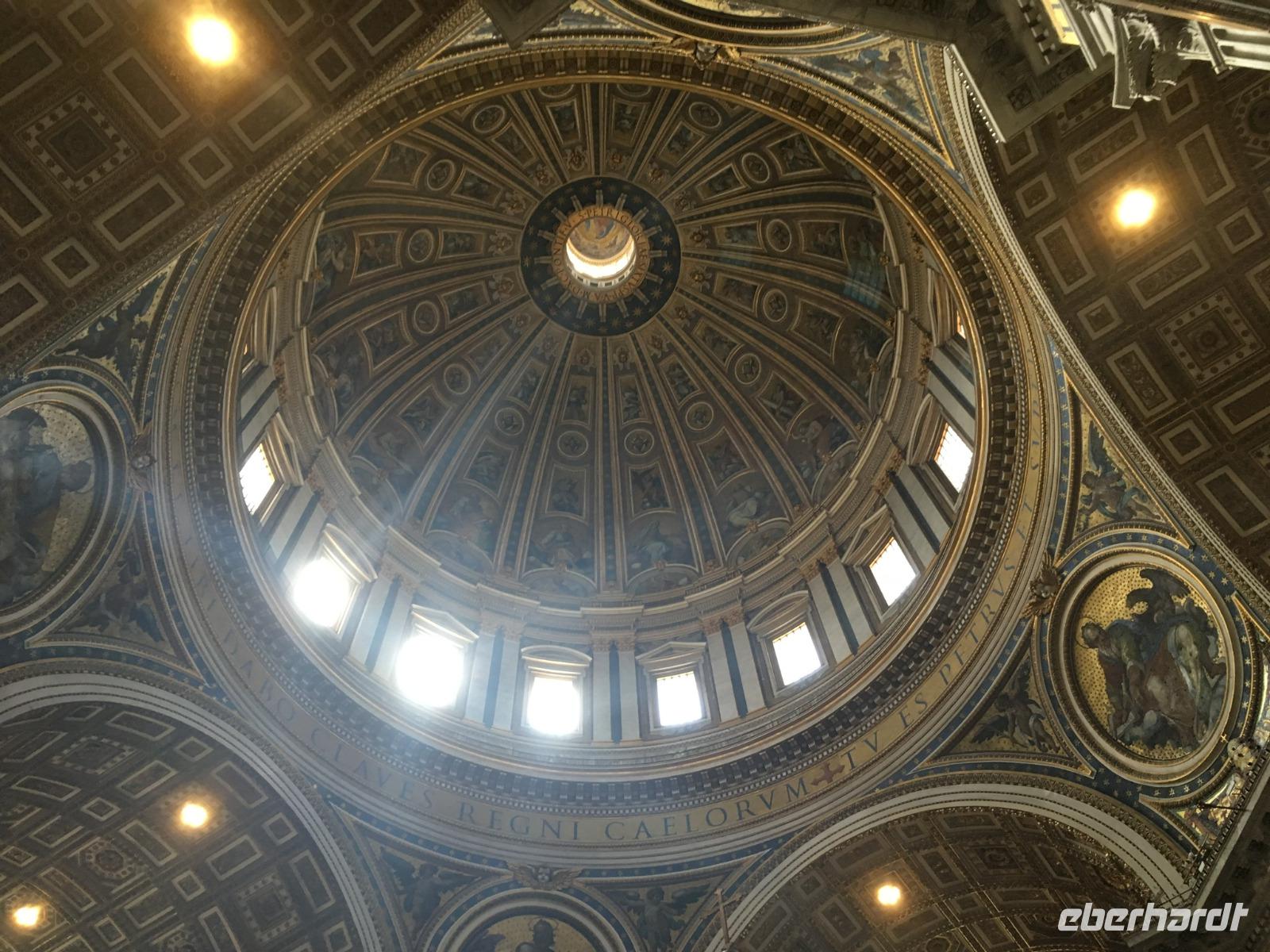 Heute durften alle Gäste ein wenig ausschlafen! Mit dem Bus fuhren wir zur Engelsburg, an welcher Silvia allerdings auf der anderen Seite wartete. Doch uns störte das nicht sonderlich, da wir die Sonnenstrahlen am Morgen genossen. Die Führung der Innenstadt ging über die Engelsbrücke mit einem tollen Blick auf den Petersdom in Richtung Piazza Navona, der Platz mit dem berühmten Brunnen der vier Flüsse. Doch wir blieben nicht lange unentdeckt! Am Straßenrand nahmen wir Luftküsse von einem Charlie Chaplin Double entgegen. Nur wenige Meter entfernt kehrten wir in das katholische Pantheon ein. Silvia fragte uns, ob es wohl durch das Loch im Dach rein regnet oder nicht. Die Fragestellung müsste eigentlich darauf hinauslaufen das es nicht rein regnet, aber natürlich tut es das, es ist ja schließlich eine freie Öffnung. Den Piazza Venezia rechts liegen gelassen schlenderten wir zum berühmten Trevi-Brunnen. Die Sonne spiegelte sich im glasklaren Wasser und Reisebegleiterin Laura spendierte im Namen von Eberhardt Travel ein typisch italienisches Gelatie. Als letzter Besichtigungspunkt stand die spanische Treppe nur ein paar Meter vom Brunnen im Mittelpunkt. Diese hat Ihren Namen viel mehr von der spanischen Botschaft links von Ihr und wurde 1732 herabführend von der Kirche Santa Trinitá die Monti zum Piazza di Spagna erbaut. Von dort aus konnte man individuell die Stadt weiter erkunden. Viele Gäste schlenderten entlang der Via del Corso zu dem Nationaldenkmal am Piazza Venezia. Nach den zahlreichen Treppen und der kurzen Fahrt mit dem Lift hatte man einen atemberaubenden Blick auf die Stadt am Tiber von weit oben. Jeder kehrte am Nachmittag beziehungsweise Abend auf eigene Faust zum Hotel zurück.