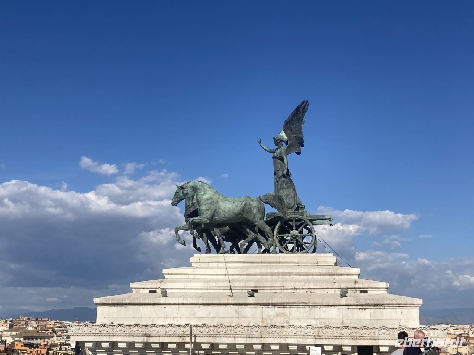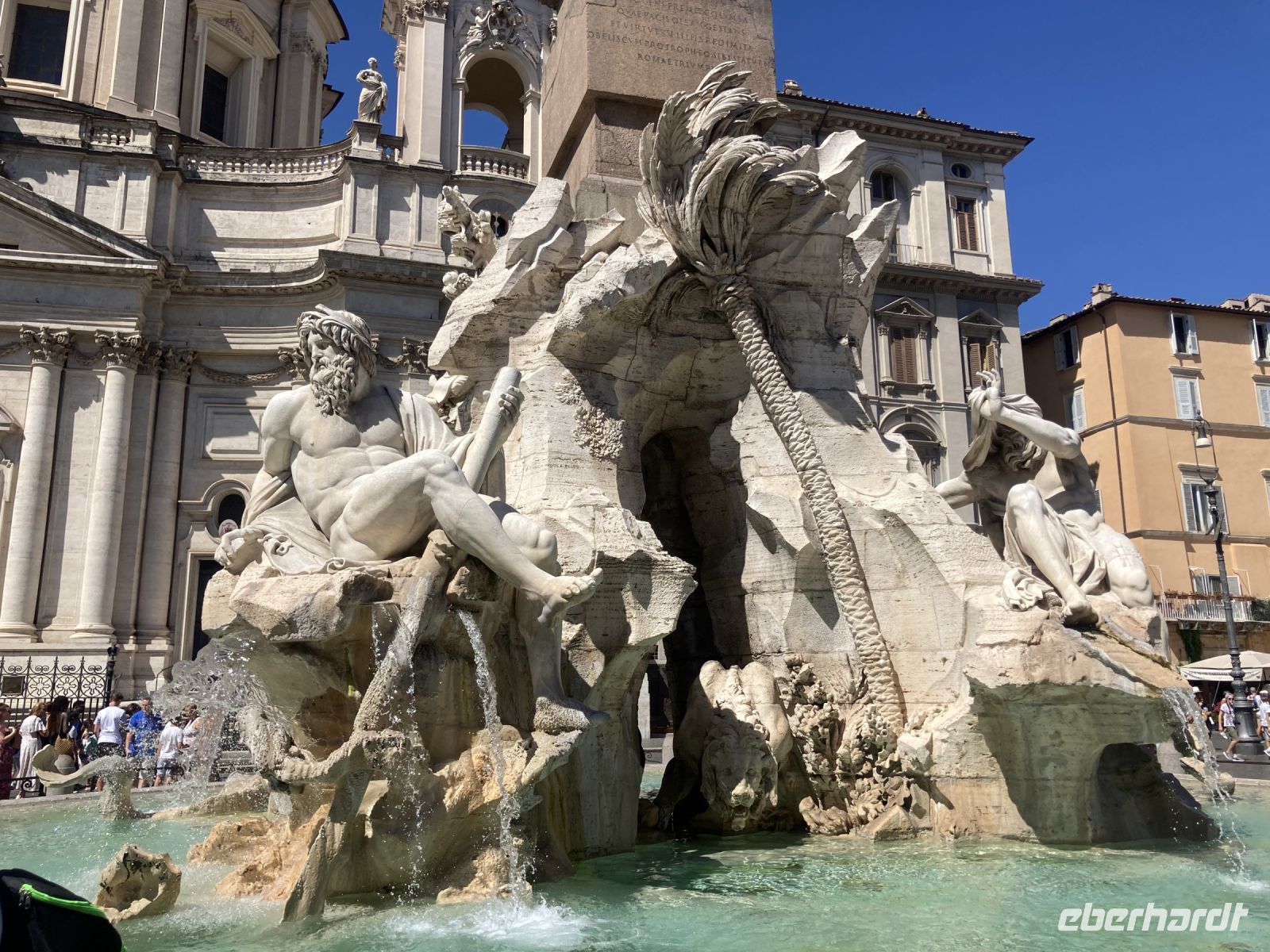 Unweit des Hotels befindet sich die Metrostation Pyramide und eine Bushaltestelle (Linie 23 und 716 sind für uns interessant). Unser Ziel lautet Monumento a Vittorio Emanuele II. Die Terrazza Delle Quadrighe lockt uns an. Die 12 € beinhalten neben der Liftfahrt auf die Aussichtsterasse auch den Eintritt in die Museen, die viel über die Entstehungsgeschichte von Rom zeigen. Wir genießen den unbeschreiblichen Ausblick und verschaffen uns von hier aus den ersten Eindruck von der Stadt. Anschließend bummeln wir durch die Straßen um schließlich auf dem Platz Piazza Navona anzugelangen. Die Plätze in den Restaurants, die im Schatten liegen, sind etwas rar schon, obwohl es für die Italiener noch viel zu früh ist um essen zu gehen. Es gelingt uns ein angenehmes Plätzchen zu finden und so klingt der Tag gemütlich aus.