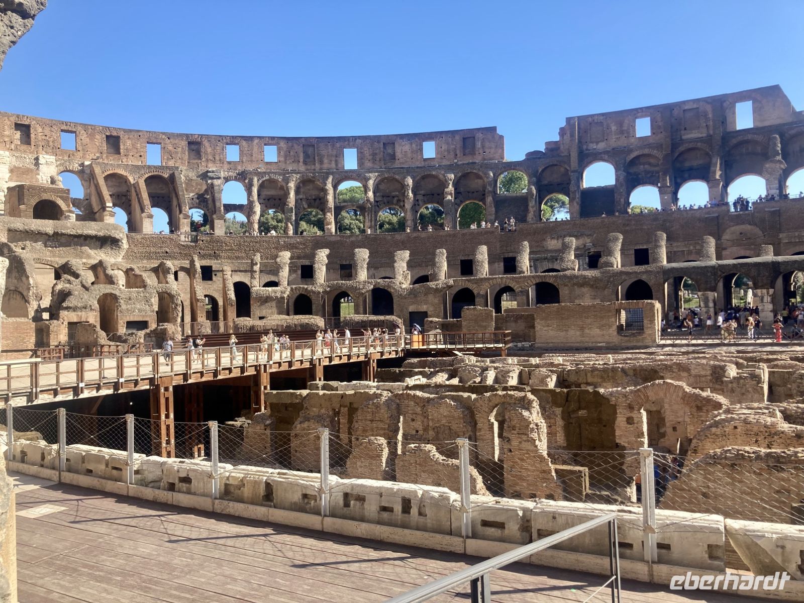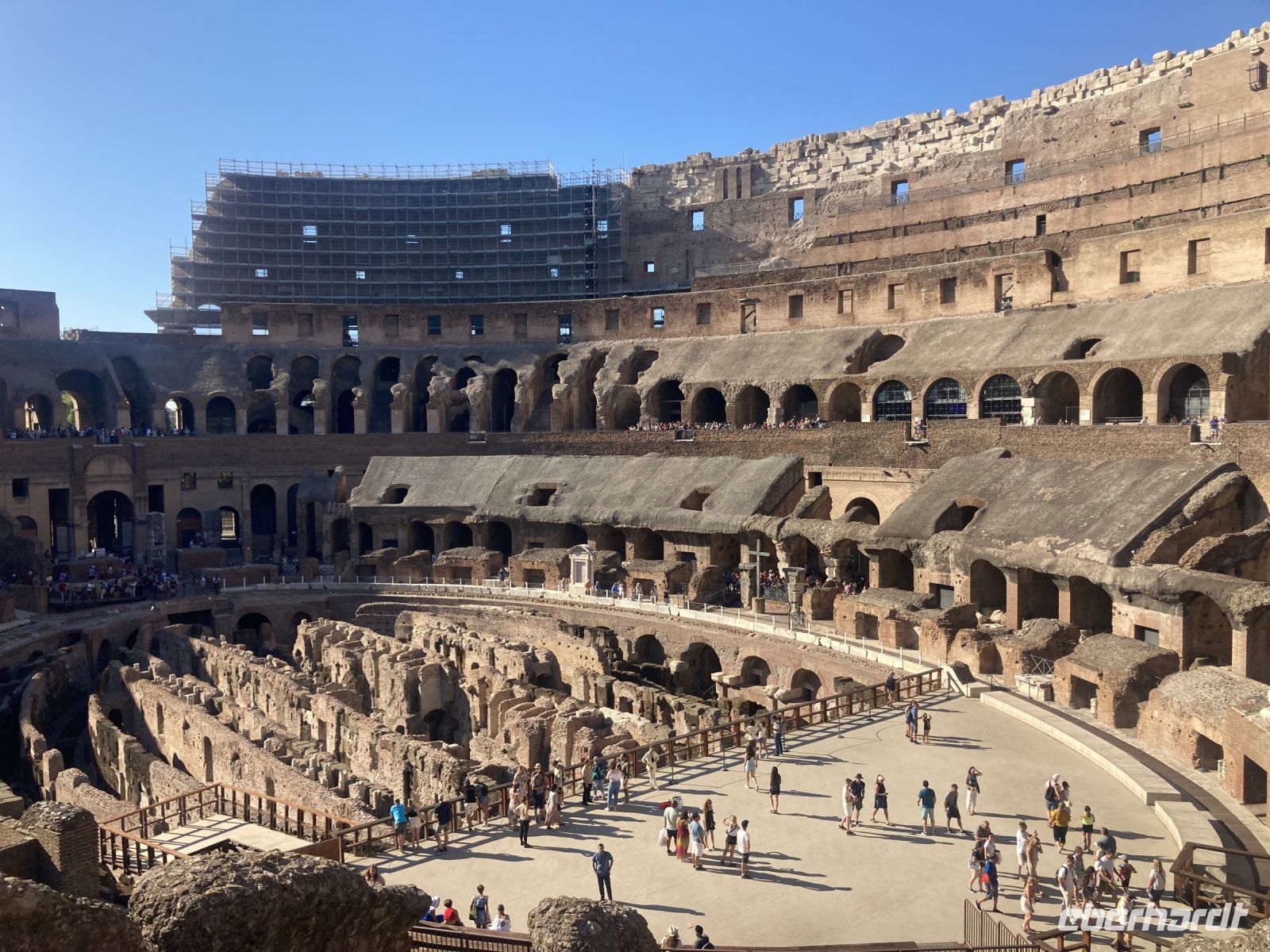An der Stelle des späteren Forum Romanum befand sich bis zum 7. Jahrhundert v. Chr. eine sumpfige Ebene und von den frühen latinischen Siedlern als Begräbnisstätte verwendet wurde. Erst durch Anlage der Cloaca Maxima konnten dieser Sumpf und mittels seiner Verlängerung Richtung Tiber, das Velabrum, ausgetrocknet werden. Das geschah 600 Jahre v. Chr. und ist noch heute in Betrieb. Es erfolgte danach die Errichtung unzähliger Gebäude, die wir noch zum Teil bestaunen können. Neben Tempeln, Palästen, Säulen, Basiliken, Bögen, Thermen und der Rednertribüne - Rosta genannt sind besonders der Titusbogen und die Ruinen der großen Basilika des Maxentius und des Konstantin zu erwähnen.Die Hitze erfordert das Einlegen einer längeren Mittagspause und so erholen wir uns bei Eis, Pizza oder Pasta jeder nach seinen Bedürfnissen um danach zum Colosseo auf zu brechen. Und wir sind überwältigt, auch wenn die Geschichte zum Colosseo doch etwas gruselig ist. Das Bauwerk mit seiner imposanten Höhe von 55 Metern beeindruckt. Von Kaiser Vespasian wurde der Standort für das seinerzeit größte Amphitheater ausgewählt und sein Sohn Titus weihte es im Jahr 80 ein. Das Fest dauerte 100 Tage und kostete zahlreichen Gladiatoren und Tieren das Leben. Dass es damals noch weit bis zur Gleichberechtigung der Geschlechter war, zeigt die Tatsache, dass Frauen auf die oberen Ränge mit schlechter Sicht und ohne Toiletten verbannt wurden. 55.000 Zuscher gelangten durch die 80 Bogengänge in die Treppenhäuser. Völlig überwältigt von dieser Besichtigung ist jetzt erst male Café angesagt…