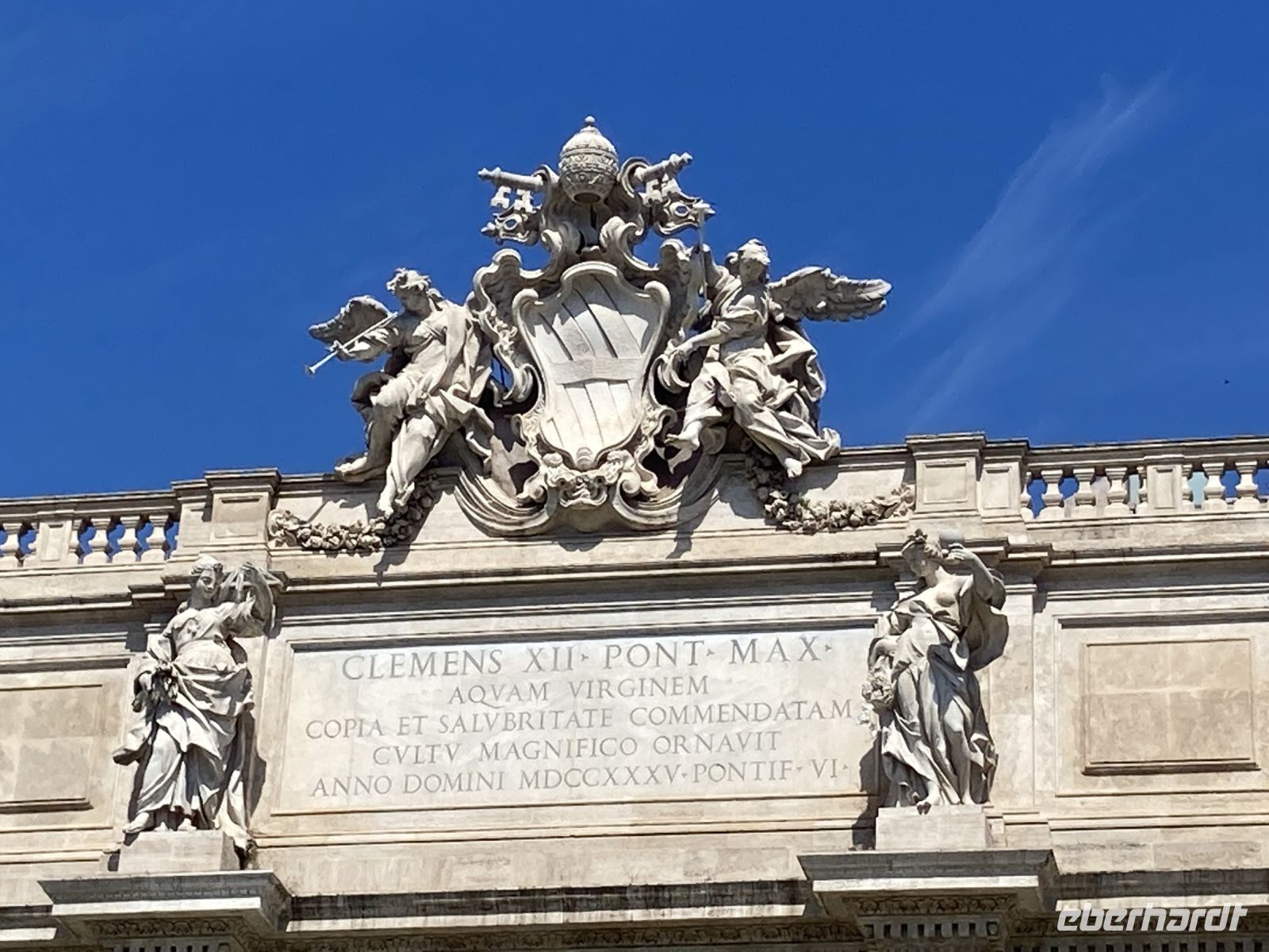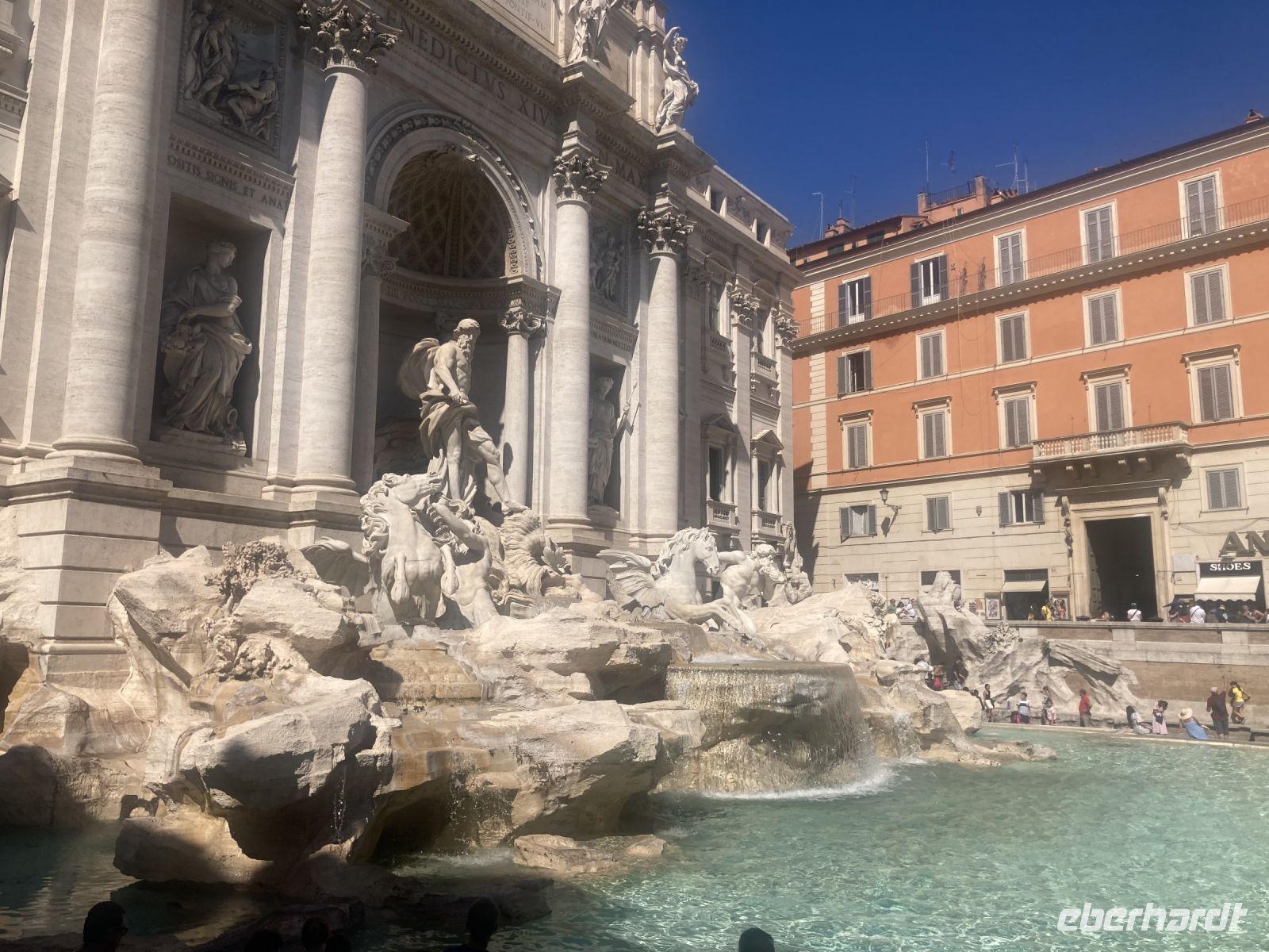 Für uns geht es Schlag auf Schlag, denn unser nächstes Ziel ist der Trevibrunnen. Er wurde von 1732 bis 1762 für Pabst Clemens XII. erbaut und vom Architekten Nicola Alvi geschaffen. Er gilt als eines der schönsten Bauwerke des Barocks und ist einer der, wenn nicht der berühmteste Brunnen der Welt. Natürlich folgen wir dem Ritual über die linke Schulter eine Münze in den Brunnen zu werfen. So stellen wir sicher, bald wieder zu kommen. Dieser Brauch geht auf den Film "Drei Münzen im Brunnen" zurück. Das eingesammelte Geld kommt übrigens nicht dem Haushalt der Stadt zu Gute (diese Bestrebungen hat es gegeben), sondern wohltätige Vereine kommen in den Genuss von Spenden. Berühmt wurde der Brunnen auch durch den Film "La dolce vita (Das süße Leben)" aus dem Jahre 1960 von Fellini. Da nehmen Anita Ekberg und Marcello Mastroianni ein nächtliches Bad im Brunnen. Vom Nachahmen wird dringend abgeraten, dies würde ein teurer Spaß. So trugen vermutlich zwei Filme zum Ansturm auf diesen Brunnen bei. Nein, er ist so überwältigend schön, dass wir auch ohne diese Filme hier her gefunden hätten.