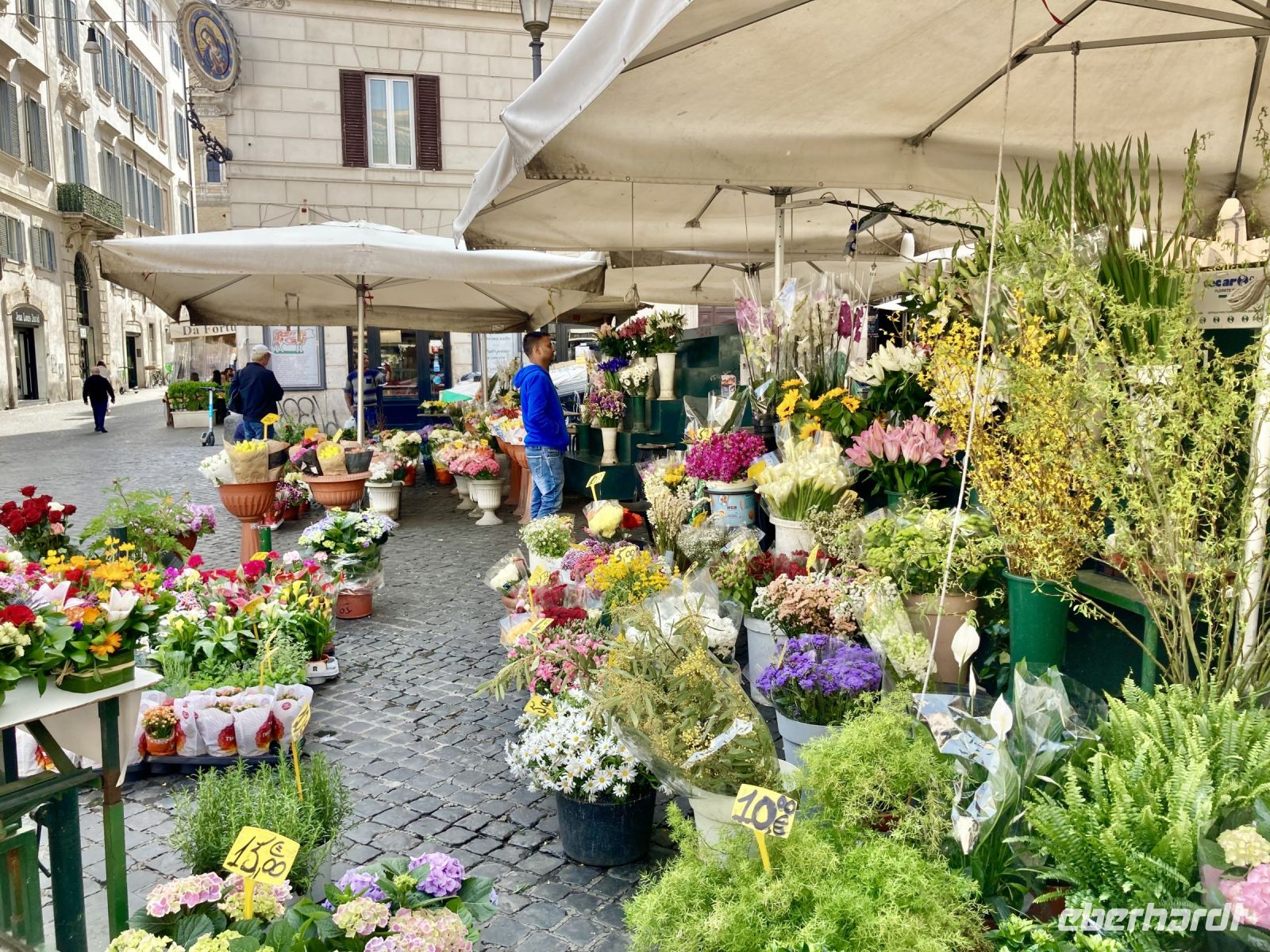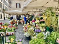 Der nächste Platz, der uns erwartet, stellt sich ganz anders dar. Hier pulsiert das Leben bereits bei Sonnenlicht. Denn auf dem Piatta Compo de Fori ist Markt. Obst, Gemüse und Blumen dominieren. Aber die vielen Gewürzmischungen dürfen nicht fehlen , die vermutlich nur für die Touristen zusammengestellt werden. Denn die Italiener mischen es sich alles frisch...
