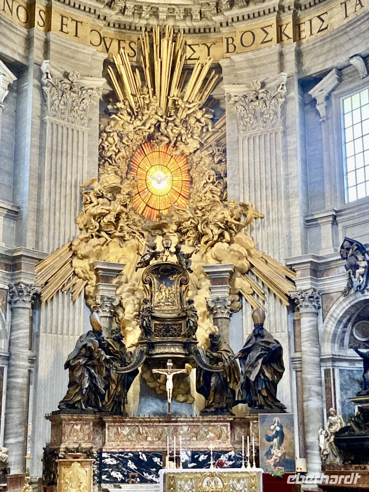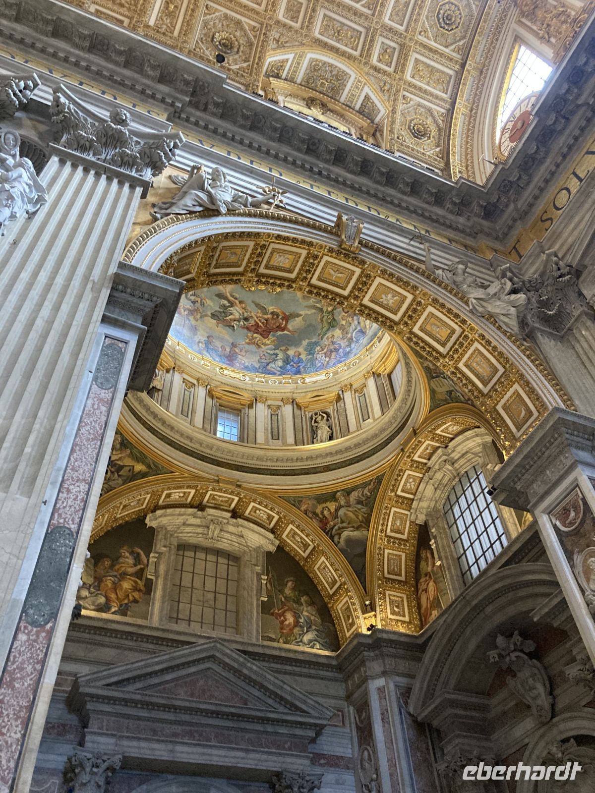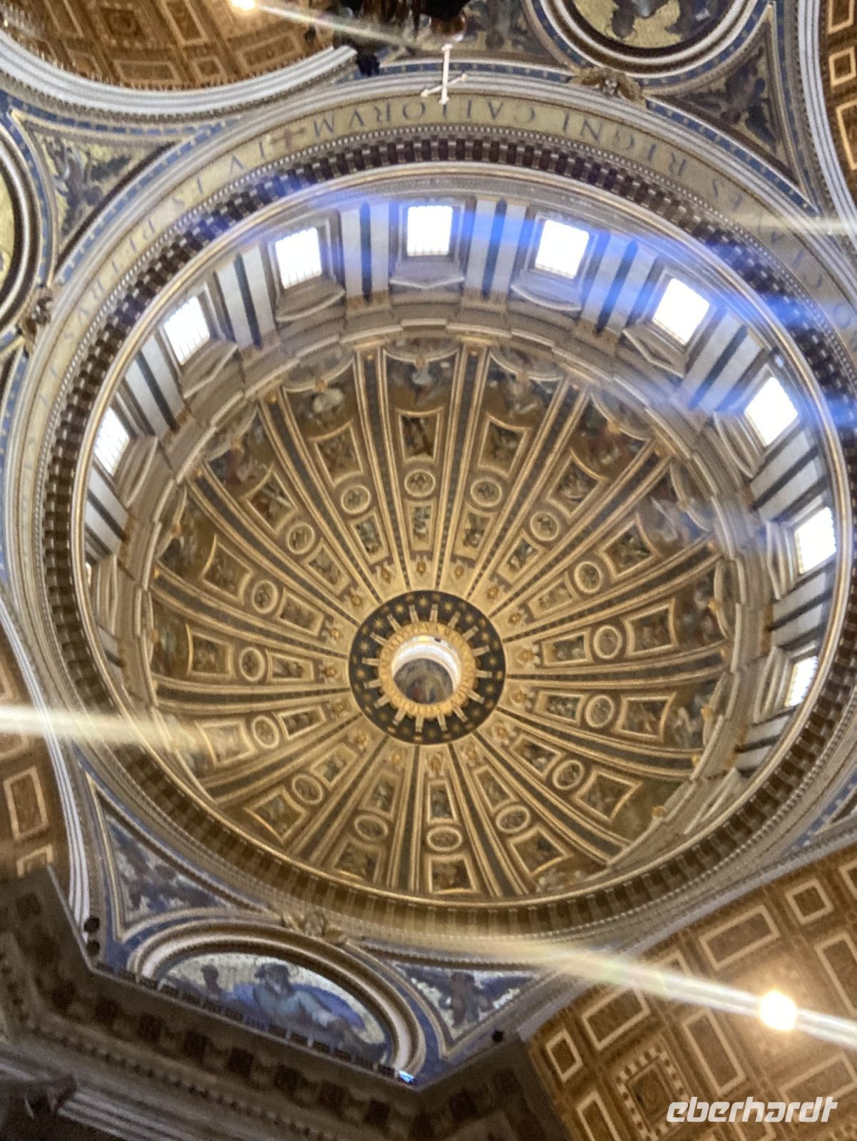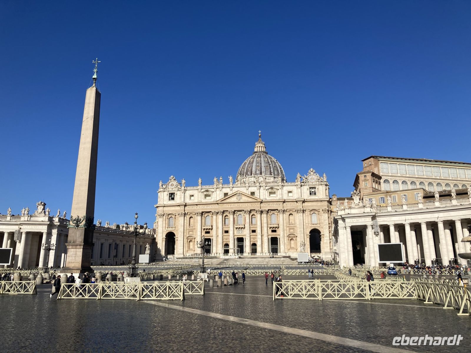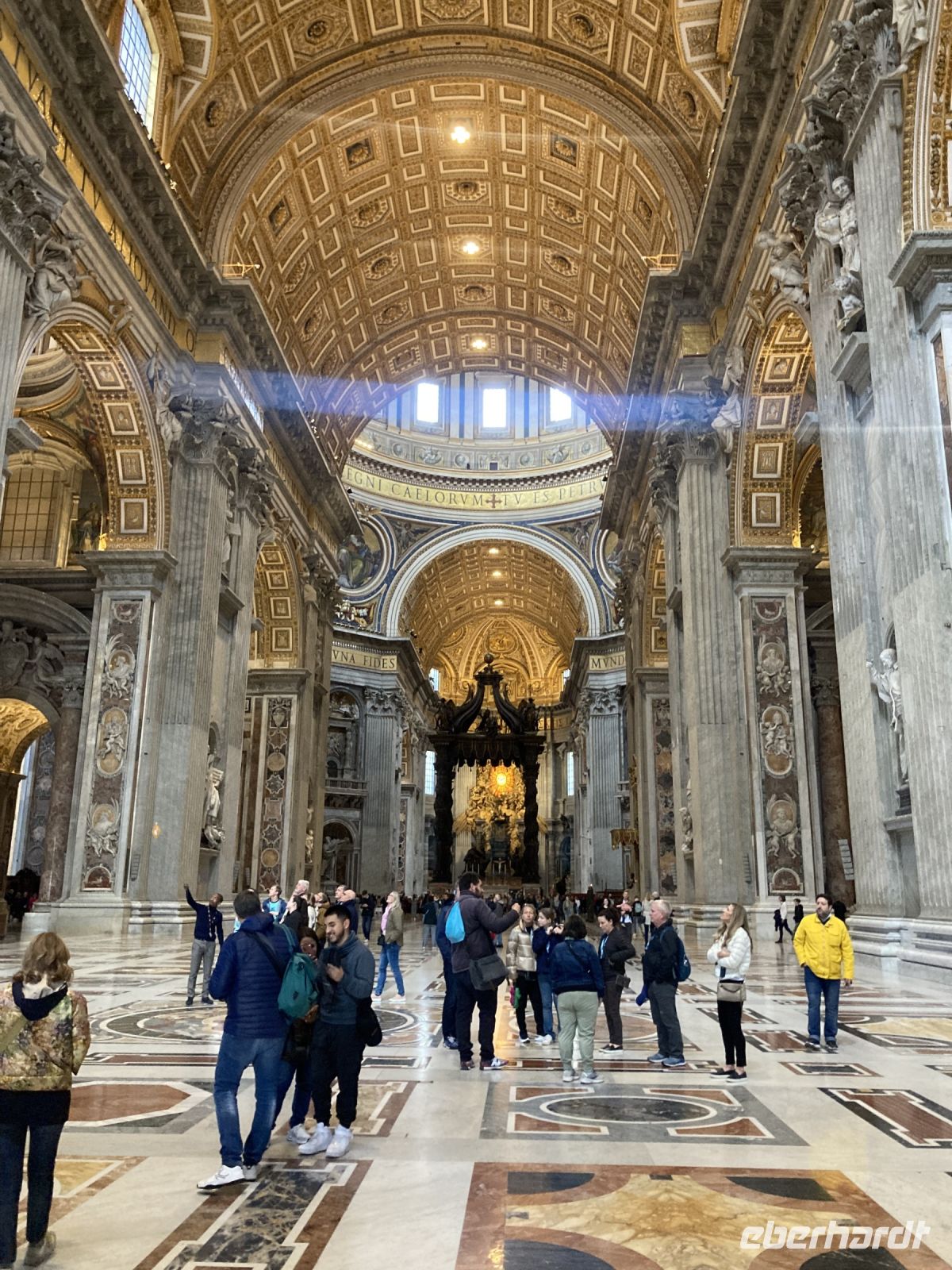 Heute probieren wir die Vorortbahn und erreichen in kurzer Zeit den Bahnhof St. Peter. Agnieszka nimmt uns in Empfang und wir schlendern zum Petersplatz um uns in die Warteschlange ein zu reihen. Es hat sich gelohnt zeitig zu sein, es ist gerade mal 8:30 Uhr. Und so benötigen wir keine halbe Stunde bis wir den Eingang der Kirche erreicht haben. Und so werden wir Teil der über 20.000 täglichen Besucher. Die Gesamtfläche der Kirche beträgt und 20.140 qm und bietet 20.000 Menschen Platz. Der 187 m, lange Dom vereint 11 Kapellen und 45 Altäre.