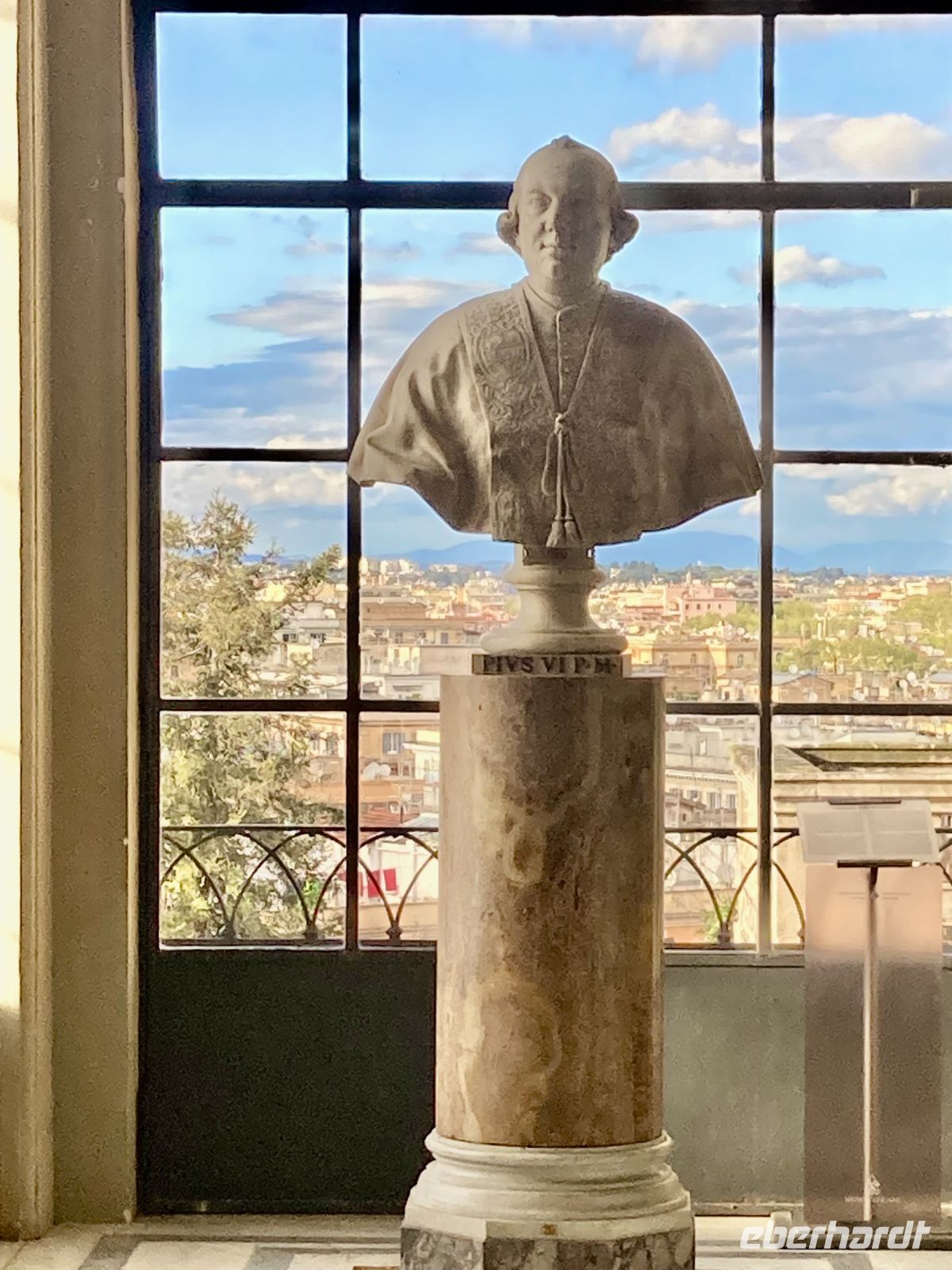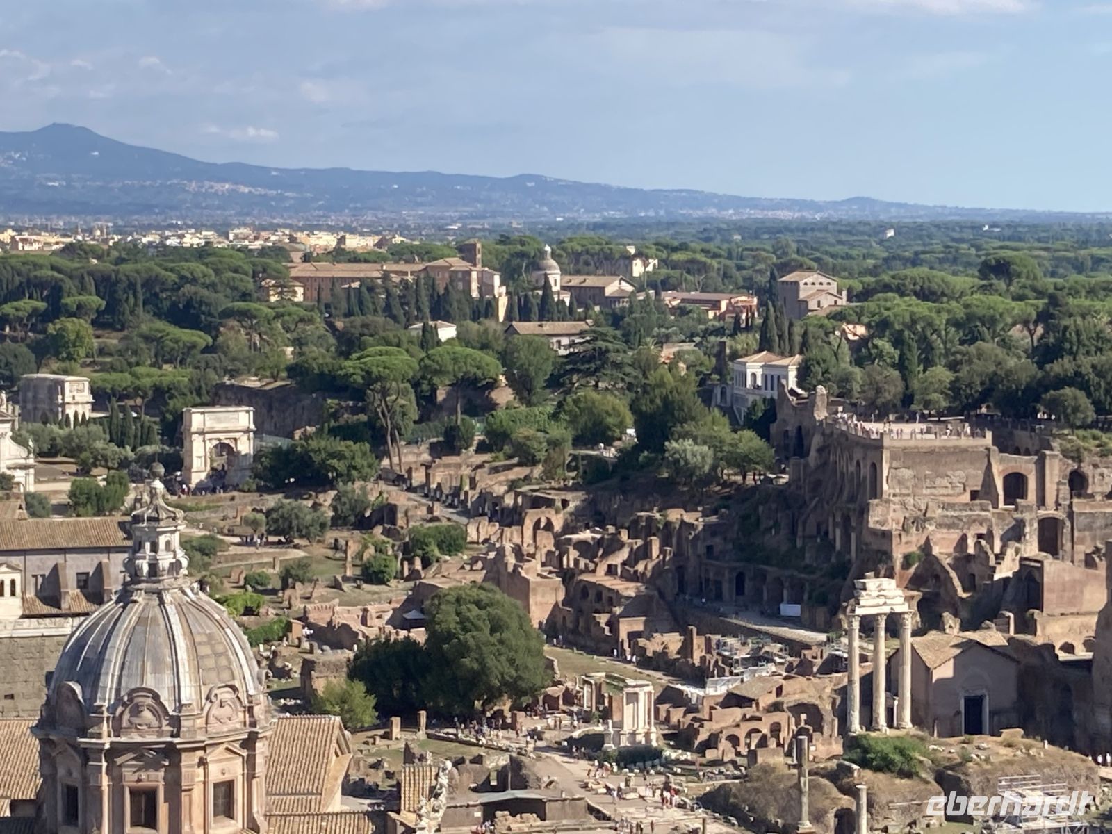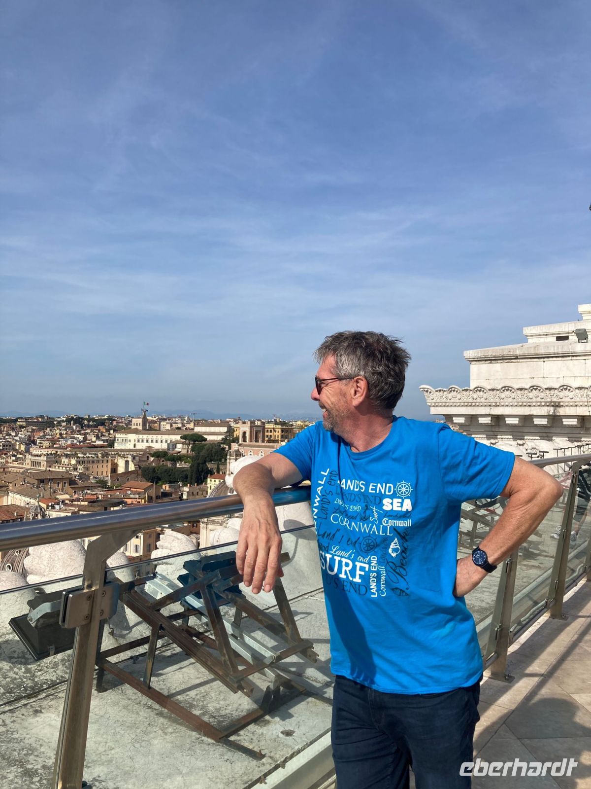 Der frühe Vogel hat mehr vom Tag. Wir reisen in zwei Gruppen, von Berlin bzw. über Frankfurt an. Und so sind wir gegen Mittag schon alle in Rom. Das hat natürlich den Vorteil, dass wir einige Stunden gewonnen haben, Rom schon etwas zu erkunden. Einige Gäste schließen sich mir zum Nationalmuseum an. Nachdem viele Treppen bezwungen waren, ging es mit dem Aufzug in luftige Höhe. Und es hat sich gelohnt. Von hier bekommt man einen wunderbaren ersten Eindruck von der Millionenstadt.