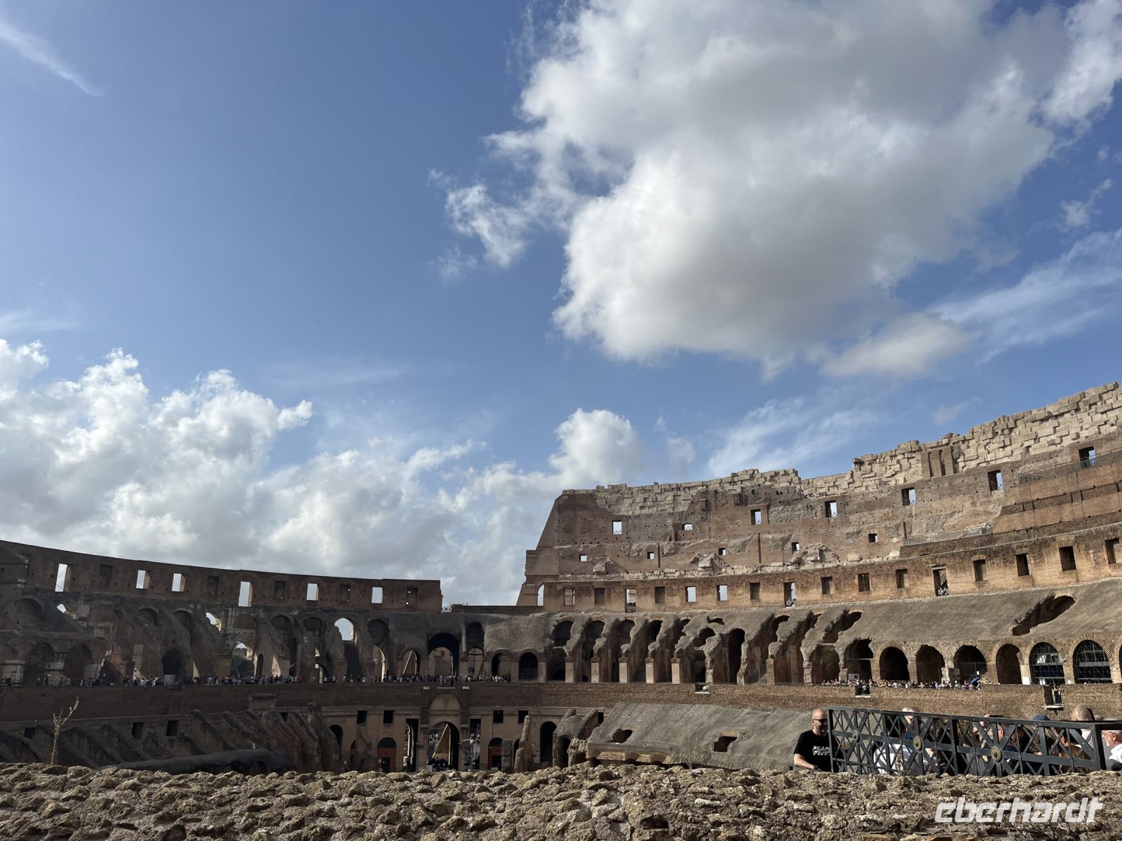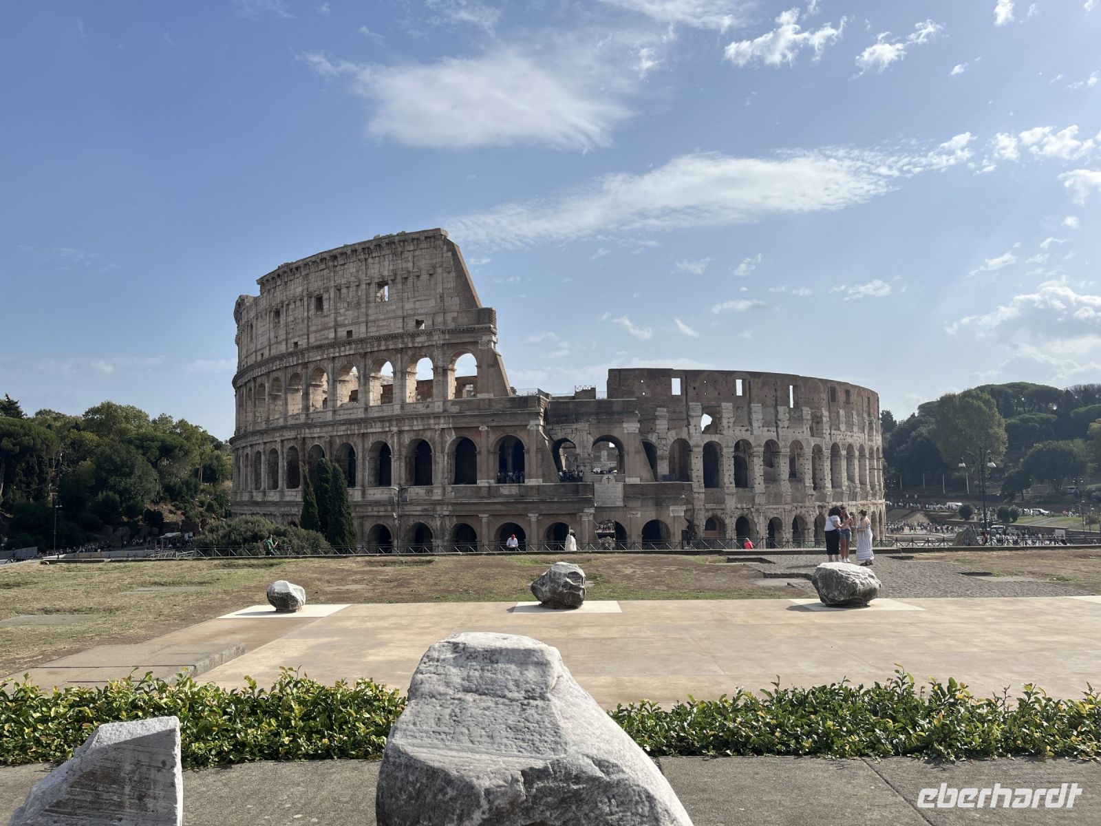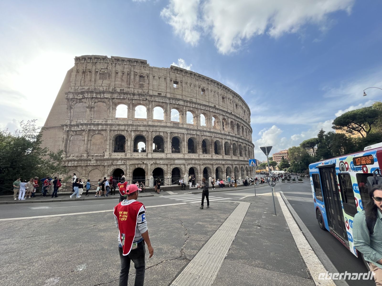 Nach einem kräftigenden Frühstück verlassen wir das Hotel, um uns an der fußläufig zu erreichenden Pyramide mit unserer örtlichen Gästeführerin Sylvia zu treffen. Heute steht das antike Rom auf dem Programm und beginnen soll es mit einem Spaziergang auf den Aventin, einen der sieben Hügel Roms. Von hier aus hat man eine fantastische Aussicht auf die Innenstadt und es bietet sich eine großartige Fotokulisse. Hier hat Sylvia noch eine Überraschung für die Gruppe: wir halten vor einem großen Tor, durch dessen Schlüsselloch man durch den Garten der Malteser den Petersdom erspähen kann. Danach geht es für uns weiter zum Circus Maximus, dem größten Circus Roms, in dem bis ins 6. Jahrhundert Wagenrennen stattgefunden haben. Leider ist heutzutage nicht mehr viel von der einst prunkvollen Arena erhalten, doch durch die Schilderungen unserer Gästeführerin kann man sich ein gutes Bild davon machen, wie es hier vor 2000 Jahren ausgesehen haben muss. Von hier aus geht es am Kolosseum vorbei weiter zum Forum Romanum. Diese Ausgrabungsstätte war früher das Zentrum des öffentlichen Lebens der Römer. Sylvia erzählt uns alles über die vielen Tempel, Statuen, Kirchen und Triumphbögen, die sich im Areal des Forums befinden und alle hören aufmerksam zu. Das Wetter ist heute zum Glück sehr gut und wir können die historische Stadt bei Sonnenschein und 25 Grad entdecken. Die Hitze macht der Gruppe dennoch etwas zu schaffen und so kommt es uns gelegen, dass der nächste Programmpunkt etwas schattiger ist. Nach kurzem Anstehen in er Schlange geht in hinein in das Innere des Kolosseums, dem größten jemals erbauten Amphitheater der Welt. Die Arena, die vor allem der Unterhaltung der Mitglieder des Kaiserhauses diente, wurde zwischen 72 und 80 n. Chr. erbaut. Hier fanden früher grausame Veranstaltungen statt, bei denen Gladiatoren gegeneinander oder gegen Tiere antraten. Hier endet das heutige offizielle Programm und die Gäste haben den restlichen Tag zur freien Verfügung. Zur großen Freude einiger Mitreisender bietet Heike noch an, die nahegelegene Kirche San Pietro in Vincoli zu besichtigen. Dort befinden sich zum einen die vermeintlichen Ketten von Petrus, mit denen er in einer Gefängniszelle gefesselt war, und zum anderen die berühmte Statue des Moses, die von Michelangelo als Grabmal für Papst Julius II. angefertigt wurde. Mit der Metro geht es anschließend zurück ins schöne Abitart Hotel. Zum Abendessen haben wir Plätze im Restaurant „La Valle del Sacco in der Nähe des Hotels reserviert, wo wir bestens speisen und den Tag ausklingen lassen.