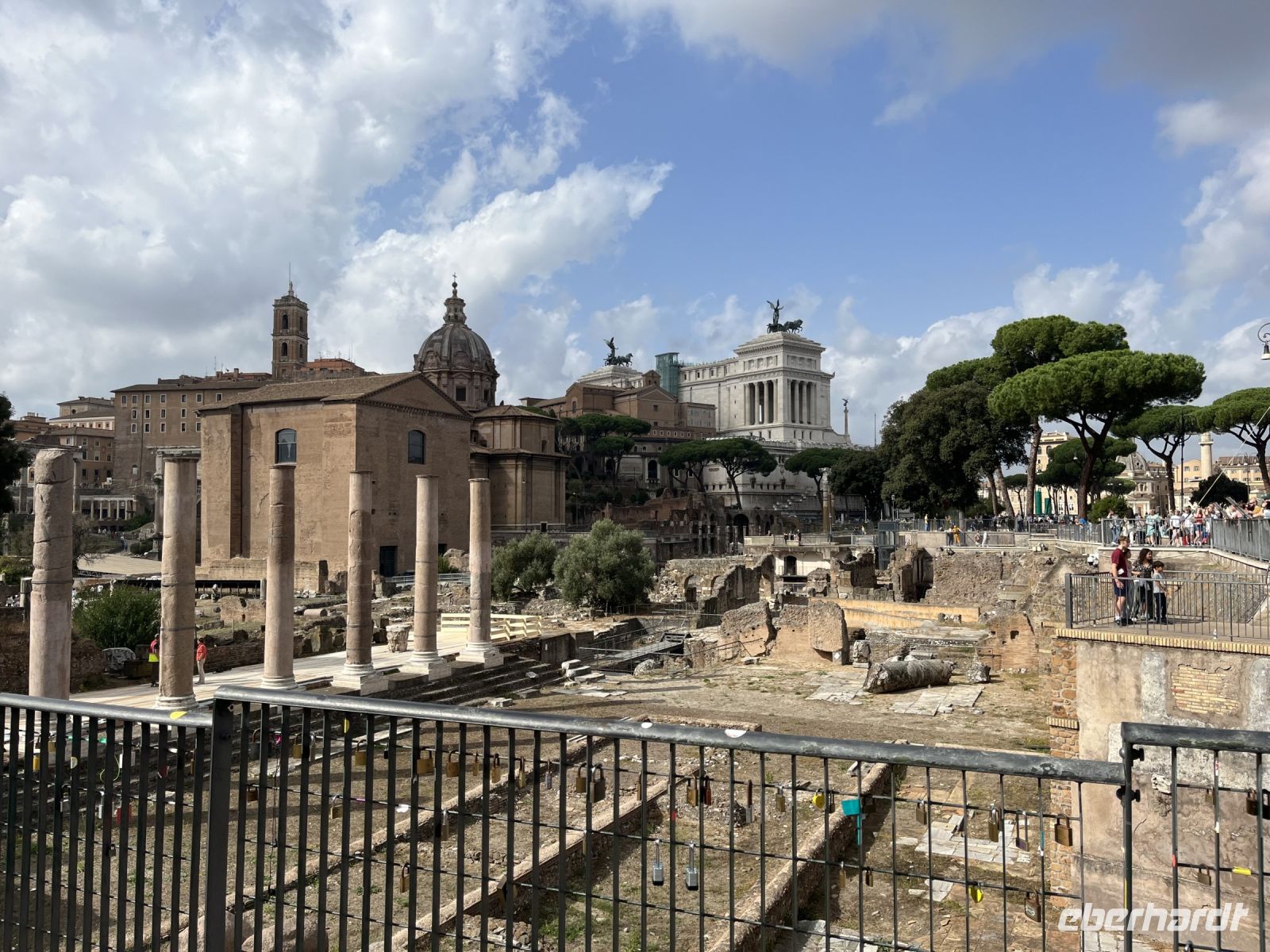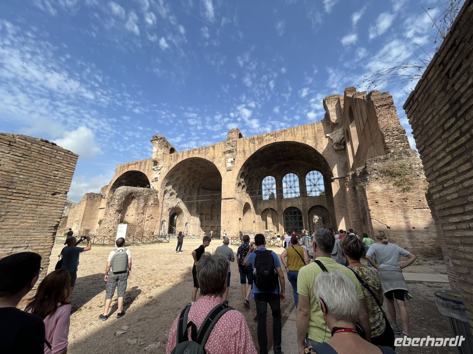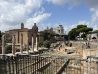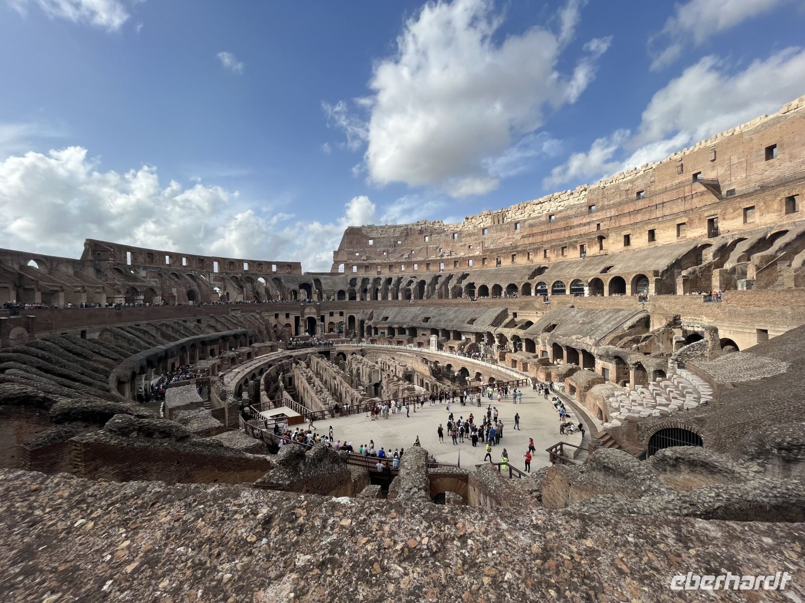 Nach einem kräftigenden Frühstück verlassen wir das Hotel, um uns an der fußläufig zu erreichenden Pyramide mit unserer örtlichen Gästeführerin Sylvia zu treffen. Heute steht das antike Rom auf dem Programm und beginnen soll es mit einem Spaziergang auf den Aventin, einen der sieben Hügel Roms. Von hier aus hat man eine fantastische Aussicht auf die Innenstadt und es bietet sich eine großartige Fotokulisse. Hier hat Sylvia noch eine Überraschung für die Gruppe: wir halten vor einem großen Tor, durch dessen Schlüsselloch man durch den Garten der Malteser den Petersdom erspähen kann. Danach geht es für uns weiter zum Circus Maximus, dem größten Circus Roms, in dem bis ins 6. Jahrhundert Wagenrennen stattgefunden haben. Leider ist heutzutage nicht mehr viel von der einst prunkvollen Arena erhalten, doch durch die Schilderungen unserer Gästeführerin kann man sich ein gutes Bild davon machen, wie es hier vor 2000 Jahren ausgesehen haben muss. Von hier aus geht es am Kolosseum vorbei weiter zum Forum Romanum. Diese Ausgrabungsstätte war früher das Zentrum des öffentlichen Lebens der Römer. Sylvia erzählt uns alles über die vielen Tempel, Statuen, Kirchen und Triumphbögen, die sich im Areal des Forums befinden und alle hören aufmerksam zu. Das Wetter ist heute zum Glück sehr gut und wir können die historische Stadt bei Sonnenschein und 25 Grad entdecken. Die Hitze macht der Gruppe dennoch etwas zu schaffen und so kommt es uns gelegen, dass der nächste Programmpunkt etwas schattiger ist. Nach kurzem Anstehen in er Schlange geht in hinein in das Innere des Kolosseums, dem größten jemals erbauten Amphitheater der Welt. Die Arena, die vor allem der Unterhaltung der Mitglieder des Kaiserhauses diente, wurde zwischen 72 und 80 n. Chr. erbaut. Hier fanden früher grausame Veranstaltungen statt, bei denen Gladiatoren gegeneinander oder gegen Tiere antraten. Hier endet das heutige offizielle Programm und die Gäste haben den restlichen Tag zur freien Verfügung. Zur großen Freude einiger Mitreisender bietet Heike noch an, die nahegelegene Kirche San Pietro in Vincoli zu besichtigen. Dort befinden sich zum einen die vermeintlichen Ketten von Petrus, mit denen er in einer Gefängniszelle gefesselt war, und zum anderen die berühmte Statue des Moses, die von Michelangelo als Grabmal für Papst Julius II. angefertigt wurde. Mit der Metro geht es anschließend zurück ins schöne Abitart Hotel. Zum Abendessen haben wir Plätze im Restaurant „La Valle del Sacco in der Nähe des Hotels reserviert, wo wir bestens speisen und den Tag ausklingen lassen.