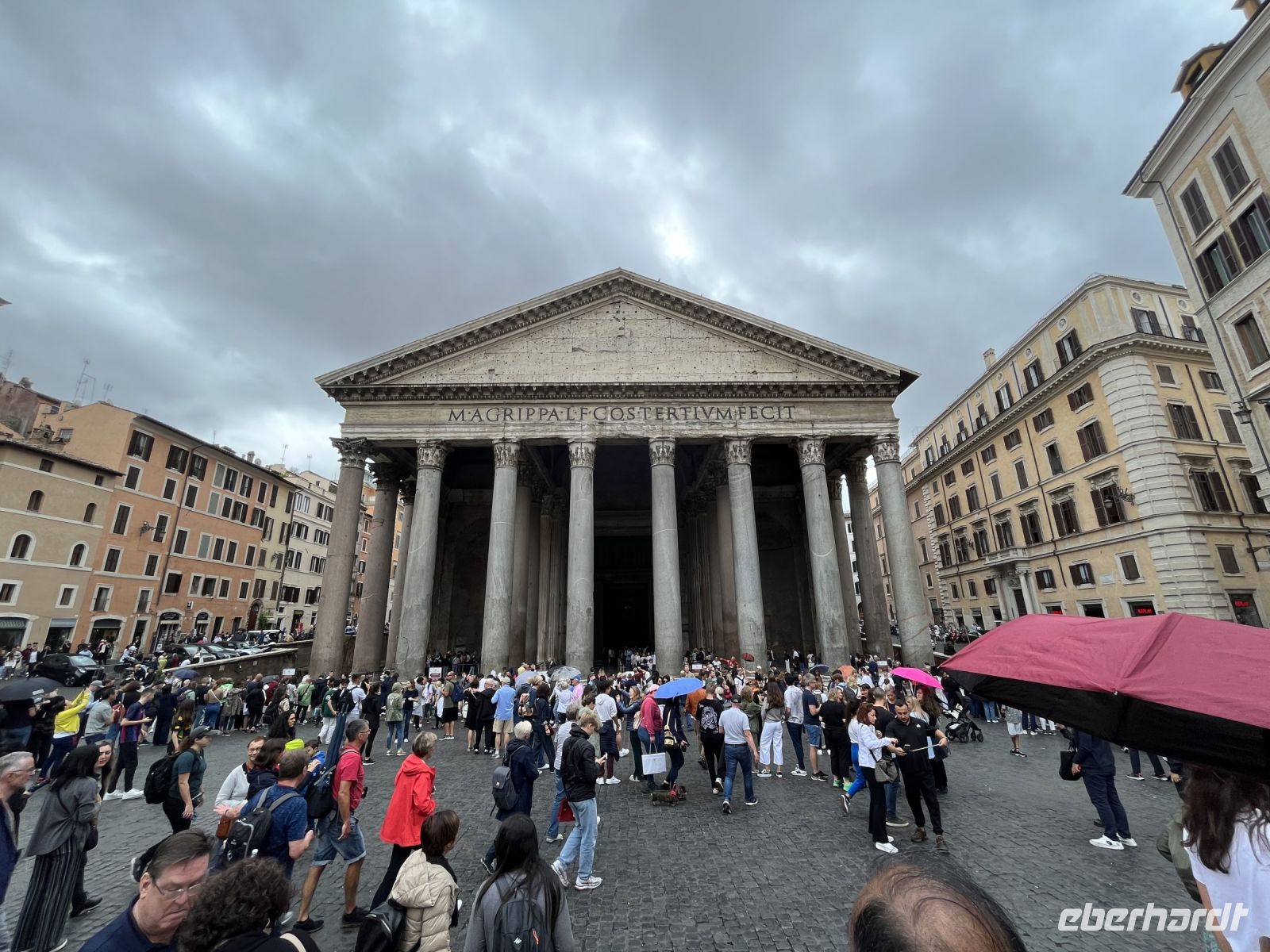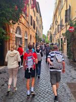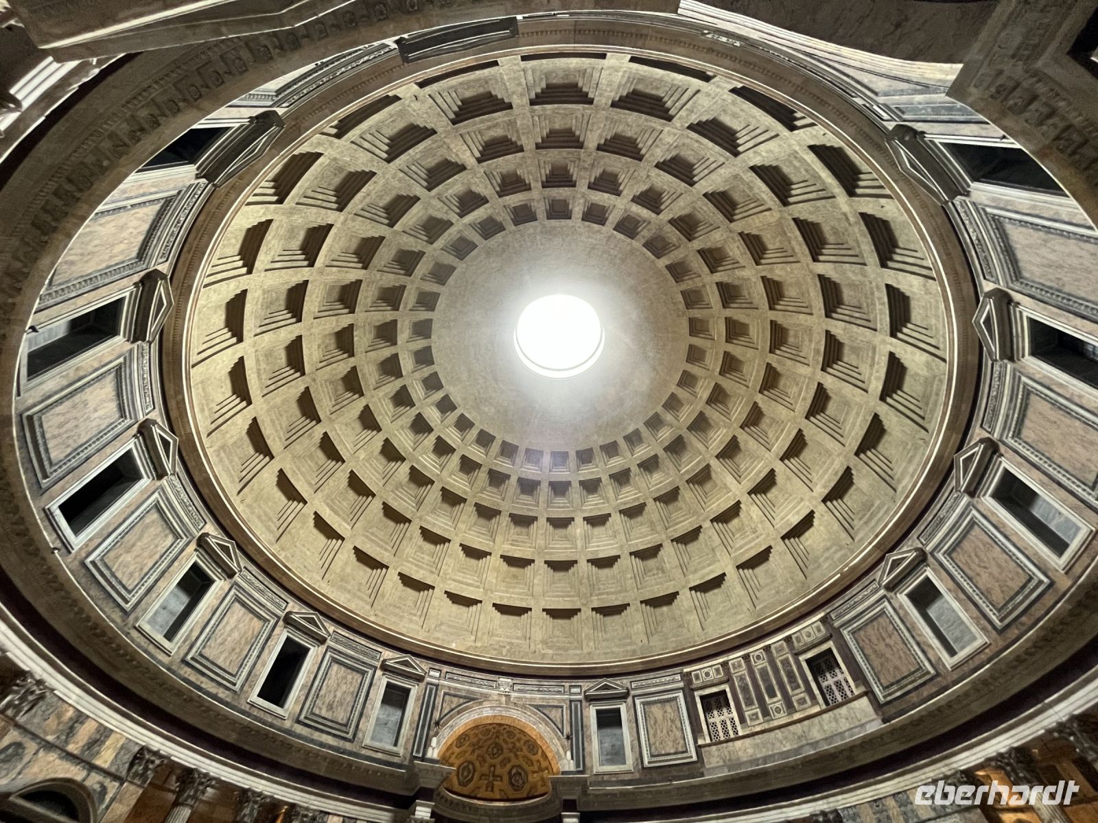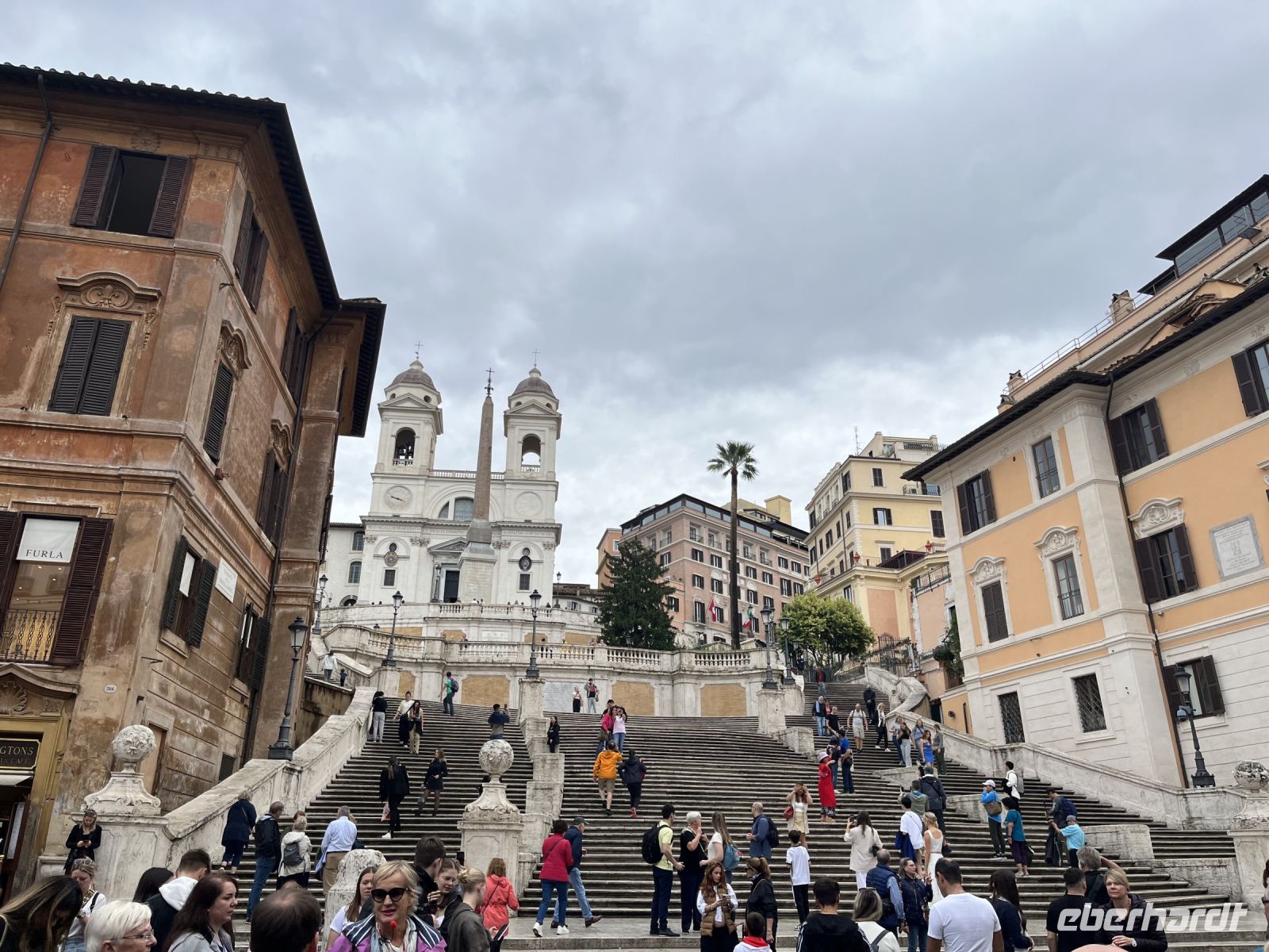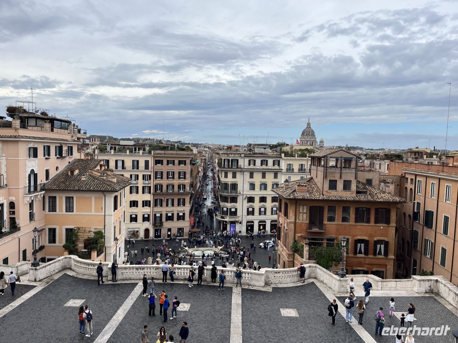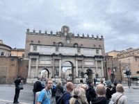 Am Morgen geht es mit der Metro los zur Piazza del Popolo, dem früheren nördlichen Stadttor von Rom. Von hier aus gehen drei Straßen ab, in denen die Boutiquen der großen Modemarken zu finden sind. Danach geht es weiter zur Spanischen Treppe an der Piazza di Spagna, die eigentlich gar nicht spanisch ist, wie wir später erfahren. Sie ist eine der bekanntesten Sehenswürdigkeiten Roms und besteht aus 136 Treppenstufen. Fun Fact: Seit 2019 ist das Sitzen auf der Treppe verboten. Weiter geht es zum Trevi-Brunnen. Dieses Meisterwerk des Barocks ist der größte Brunnen Roms und einer der bekanntesten der Welt. Die Statue des Meeresgottes Neptun, der auf seinem muschelförmigen Streitwagen von zwei geflügelten Pferden und Tritons zum Meer gezogen wird, steht zentral unter dem Triumphbogen. Sylvia erklärt uns, was es mit dem berühmten Münzwurf über die Schulter auf sich hat: wer eine Münze wirft, wird nach Rom zurückkehren, wer zwei Münzen wirft, wird sich in einen Römer oder eine Römerin verlieben und wer drei Münzen wirft, wird diese Person heiraten. Jährlich werden etwa 1 Mio. Euro aus dem Brunnen geholt und an eine Wohltätigkeitsorganisation gespendet. Nach einer kurzen Mittagspause mit Pizza und Pasta steht nun die Besichtigung des Pantheons an. Dieses gilt als eines der am besten erhaltenen Bauwerke der römischen Antike. Aufgrund des Wetters können wir auch die Frage klären, ob es oben ins Pantheon reinregnet: Ja, es regnet rein. Die acht Meter große kreisrunde Öffnung an der Decke des Gebäudes hat verschiedene Zwecke. Zum einen diente sie als Sonnenuhr, zum anderen konnte früher so der Rauch bei Opfergaben, die verbrannt wurden, aus dem Gebäude ziehen. Wir haben heute schon viele Plätze gesehen, aber Rom hat immer noch mehr zu bieten. Wir spazieren zur Piazza Navona, einem charakteristischen Platz des barocken Roms. Vor etwa 2000 Jahren hat Julius Cäsar hier ein Stadion gebaut, in dem sportliche Wettkämpfe, wie bei den olympischen Spielen in Griechenland, stattfanden. Heute befindet sich auf dem Platz der Vierströmebrunnen, mit männlichen Figuren, die die Flüsse Nil, Donau, Rio de la Plata und Ganges repräsentieren. Der nächste Platz, der uns erwartet, ist der Campo de Fiori, oder übersetzt Blumenmarkt. Hier findet jeden Vormittag ein Markt statt, auf dem man Käse, Wurst, Holzkunst und natürlich Blumen kaufen kann. An der schönen französischen Botschaft vorbei, gelangen wir zum Ende des Rundgangs auf die Via Giulia, die 1508 von Papst Julius II. erbaut wurde. Diese einen Kilometer lange, schnurgerade Straße galt einst als schönste Straße Roms. Heute beherbergt sie viele Antiquitätengeschäfte, Galerien und Werkstätten. An einem kleinen Springbrunnen beendet Sylvia die Führung und wir bedanken uns für Ihre tollen Erläuterungen der letzten Tage. Es ist auch ein Abschied für einige aus der Gruppe, die sich wegen der verschiedenen Rückflüge nicht mehr sehen werden. Der Rest des Tages steht den Gästen wieder zur freien Verfügung. Einige schlendern noch etwas durch Trastevere, einige gehen nochmal auf Entdeckungstour durch die Innenstadt und andere begeben sich nach dem anstrengenden Tag direkt ins Hotel.