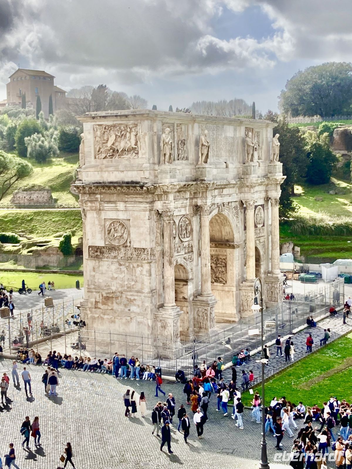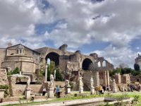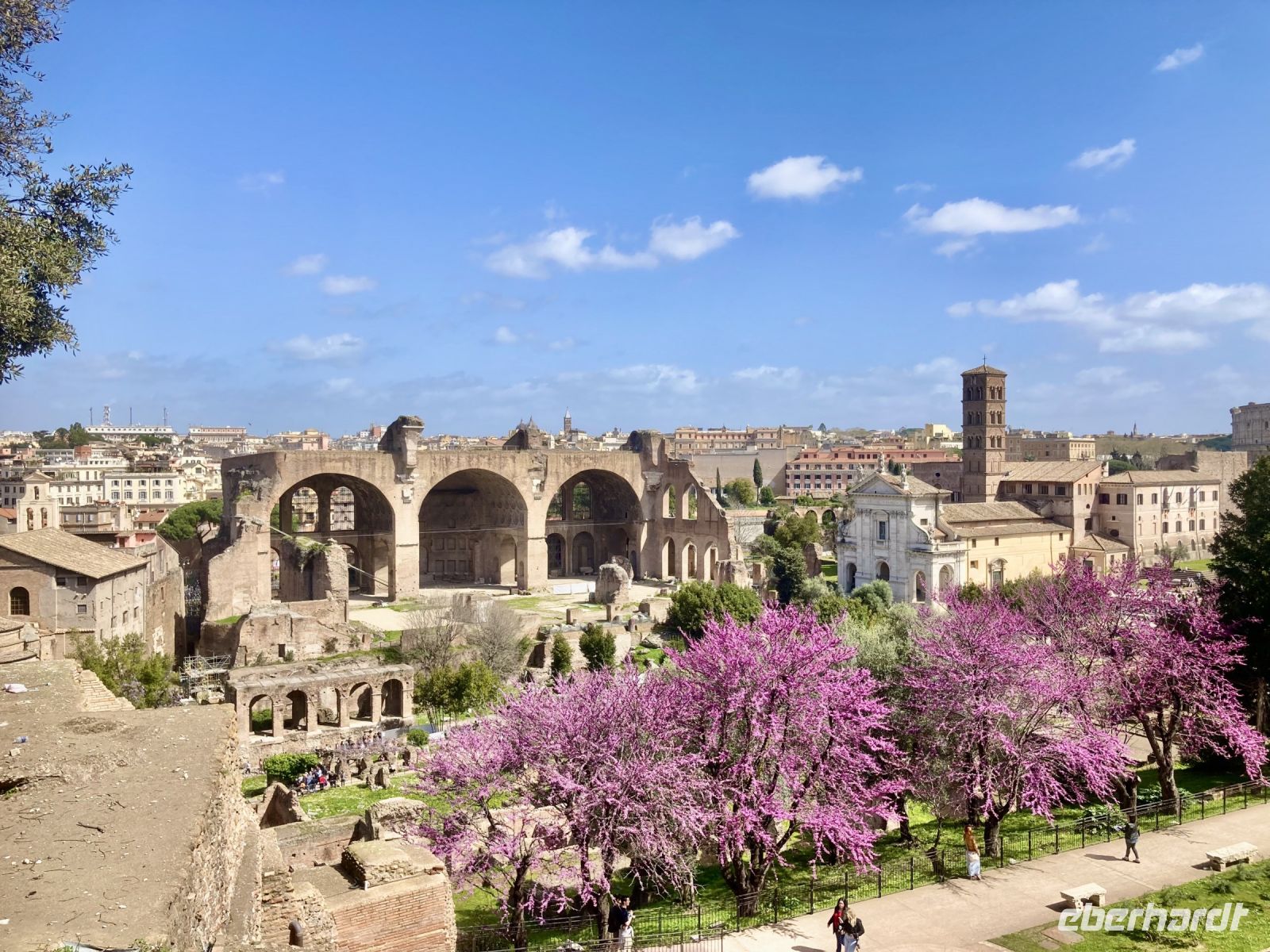Und los gehts, zuerst ins Forum Romanum, welches umgeben von den drei Hügeln: Kapitol, Palatin und Esquilien ist. Da wir recht früh dran sind, hält sich die Wartezeit in Grenzen. Im Forum Romanum fand seinerseits das gesellschaftliche und politische Leben statt. Zuvor war es eine sumpfige Gegend, die im 7. Jh vor Christi von Siedlern urbar gemacht wurde. Erst durch die Anlage der Cloaca Maxima (die noch heute in Betrieb ist) konnte dies Gegend genutzt werden. So konnten unzählige Gebäude errichtet werden, Paläste, Tempel, Rednertribünen und viele Thermen, um nur einige zu benennen. Anschließend erklimmen wir einen der Hügel und es bietet uns ein traumhafter Ausblick.