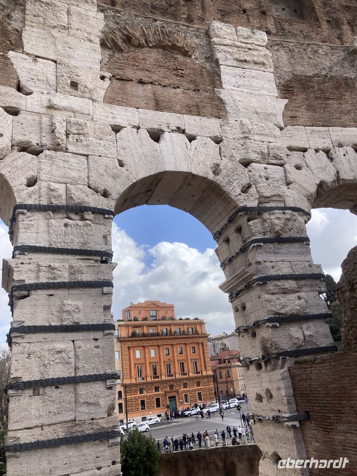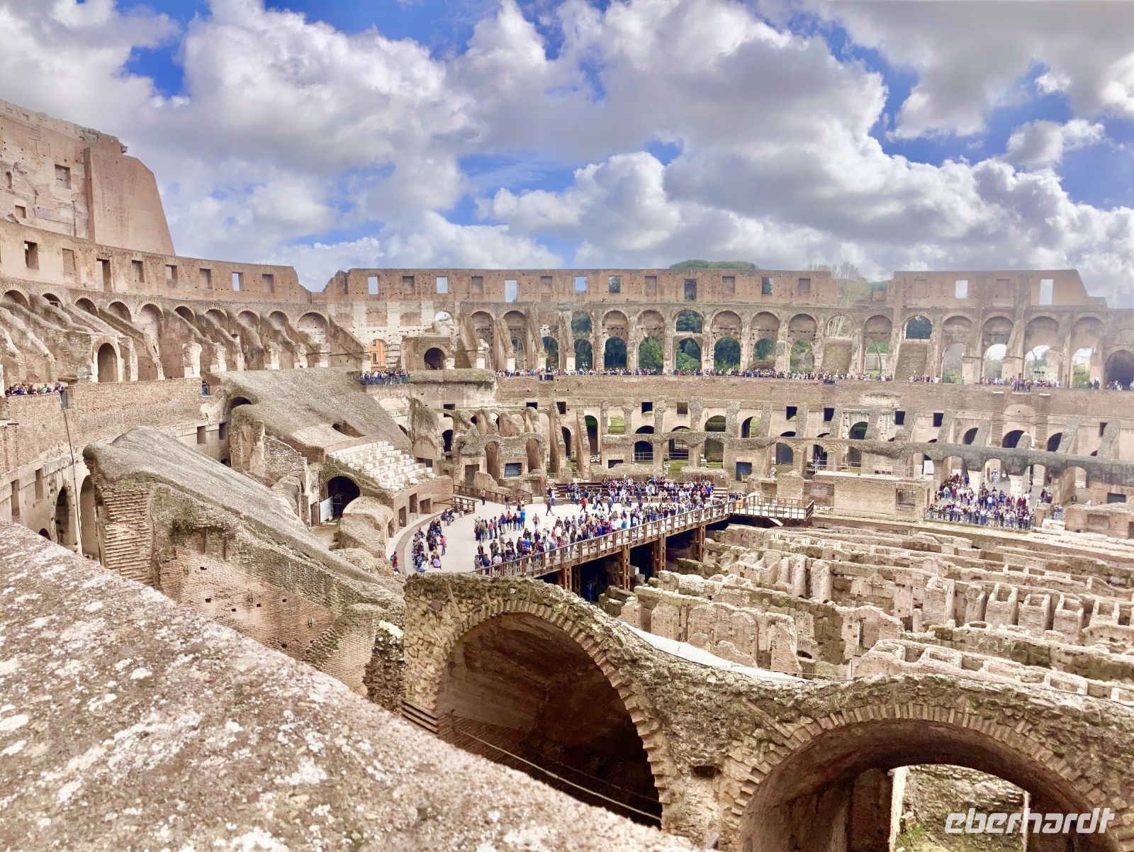 Das Colloseum, im Jahre 80 eingeweiht und mit einem 100 Tage dauernden Fest wurde es eröffnet. Wenn man seine Geschichte hört, wird einem schon etwas gruselig. Von Hinrichtungen grausamster Art erzählt man, von Kämpfen Mensch gegen Mensch, Mensch gegen Tier und Tiere untereinander. Nicht desto trotz ist es mit seinen 55 Metern Höhe ein imposantes Bauwerk. Beeindruckend ist auch das ausgeklügelte Konzept zur Logistik für die Zuschauer, über viele bogenähnliche Eingänge gelangte man zielstrebig an seine Plätze. 80 Eingänge rund um die Arena ermöglichten den Zuschauern, auf direktem Weg zu ihren Plätzen zu gelangen. Vier von diesen Eingängen waren der obersten Schicht vorbehalten. Unter diesen befanden sich unter anderem der Kaiser, Senatoren, die Vestalinnen, die ausgewählt waren das ewige Feuer zu bewachen, und Priester. Für diese bedeutenden Personen wurde ein eigens abgesichertes Podium in der Arena errichtet.