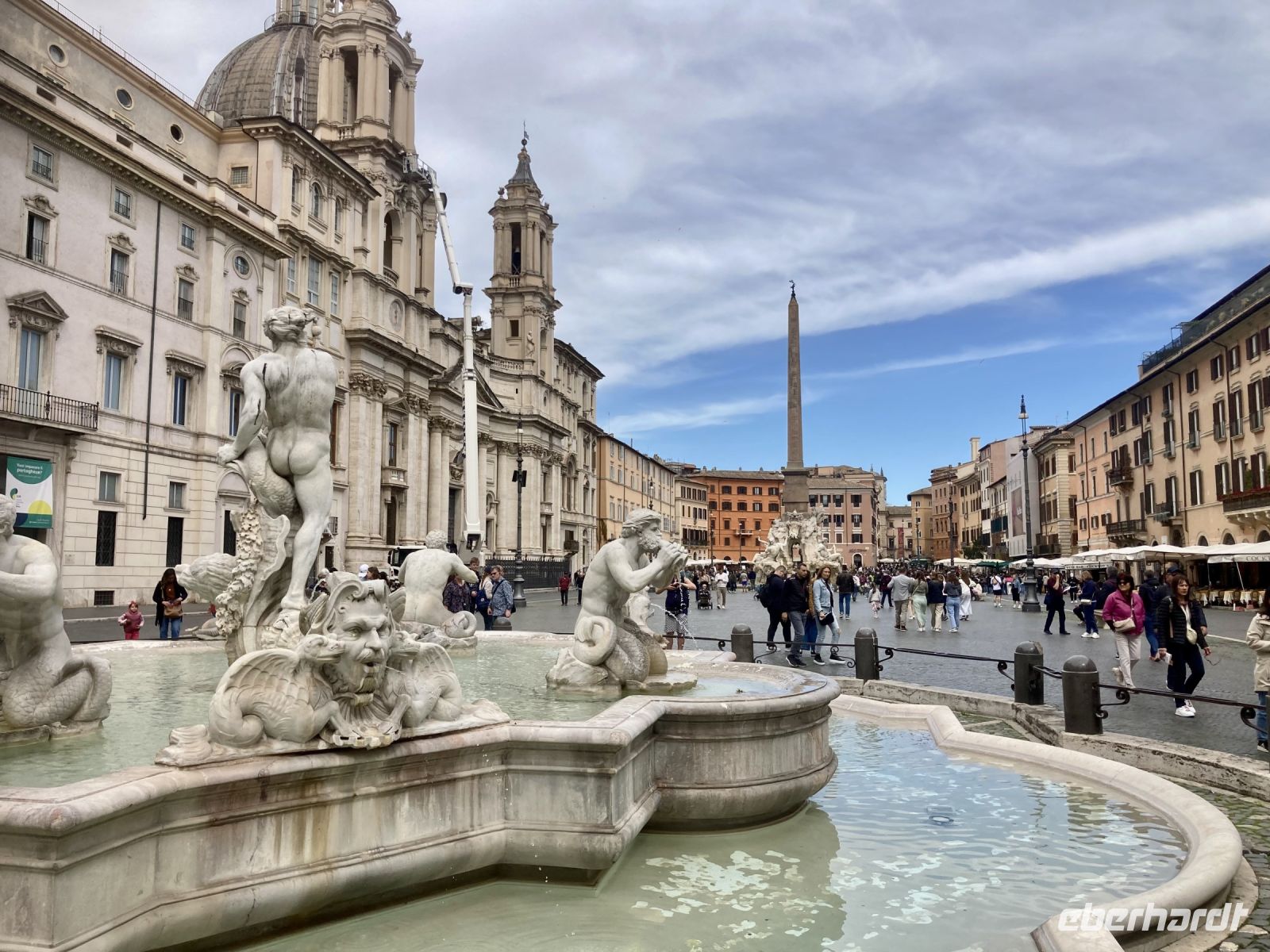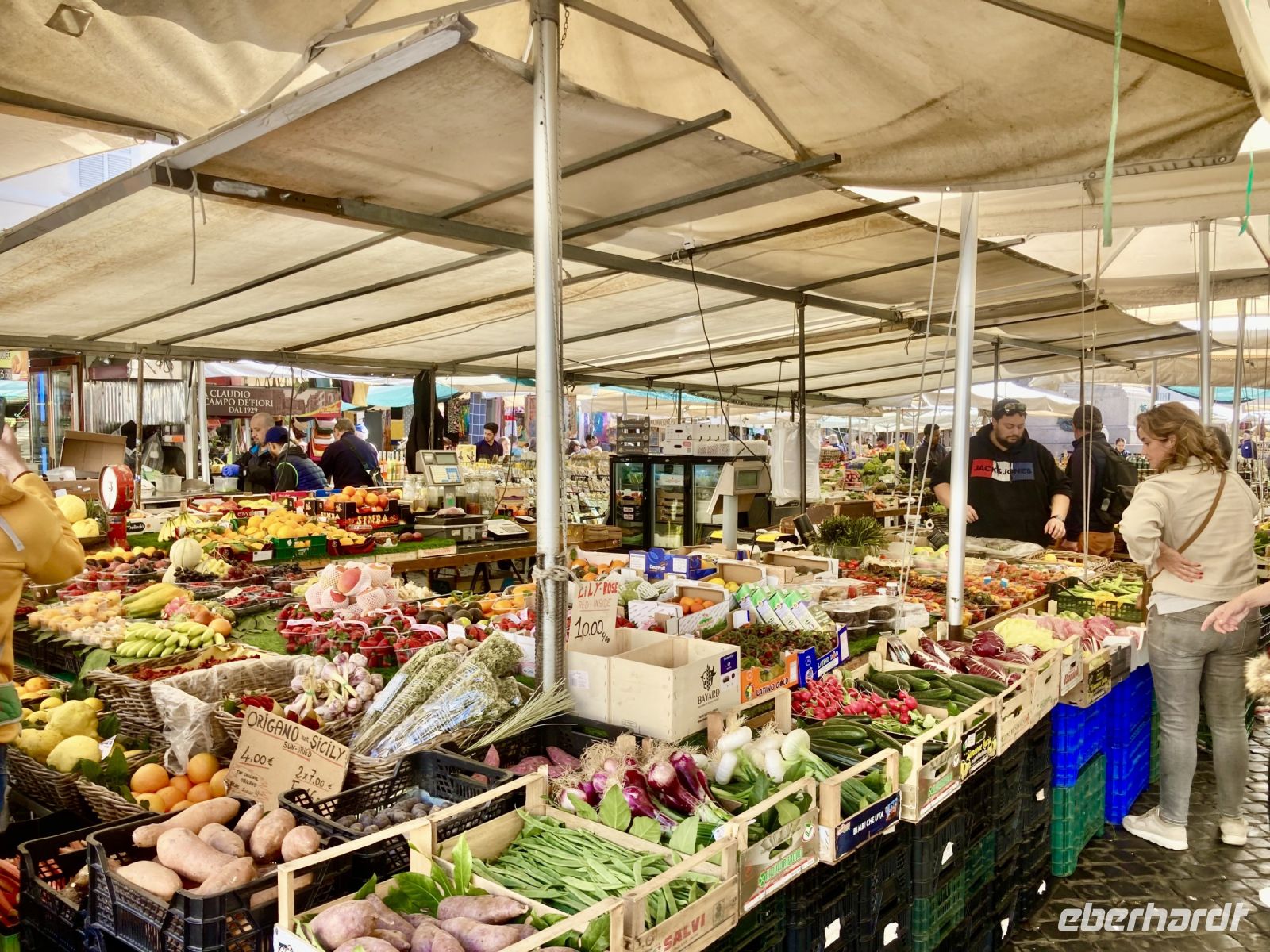 Weiter führt uns der Weg durch typisch römisch Gassen, wo sich Autos, Motorroller und wir uns arrangieren. Wir erreichen den Piazza Navona mit seinen zwei Brunnen. Besonders ragt der 1651 erbautenBrunnen der vier Flüsse bzw. vier Kontinente (Fontana Dei Quattro) von Bernini heraus. Nebenan befindet sich die Kirche der Heiligen Agnes, erschaffen vom Bildhauer Boromini. Kurios ist, dass sich die beiden Baumeister nicht ausstehen konnten und so schauen die Figuren weg vom jeweils anderen Bauwerk. Zu erwähnen ist noch, dass der gesamte Platz (früher auch mal eine Wettkampfstätte) heute von unzähligen Restaurants umringt wird. Nun führt uns der Weg weiter zu einem anderen Platz. Der Campo de Fiori ist so ganz anders. Der Handel begann hier als Blumenmarkt. Heute erhält man neben reichlich Obst und Gemüse auch Allerlei, was eindeutige der Zielgruppe: Tourist gewidmet ist. Einige Minuten Freizeit nutzen wir zum Rundgang und zur Verkostung. Eis geht übrigens immer in Rom. Es zieht uns langsam zum Pantheon und es gibt erst mal die Wohlfühlmittagspause, zu der man es in der Sonne gut nur im T Shirt aushält.