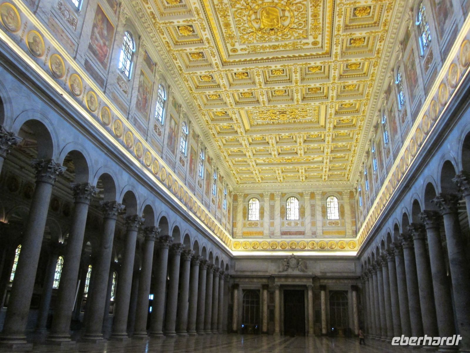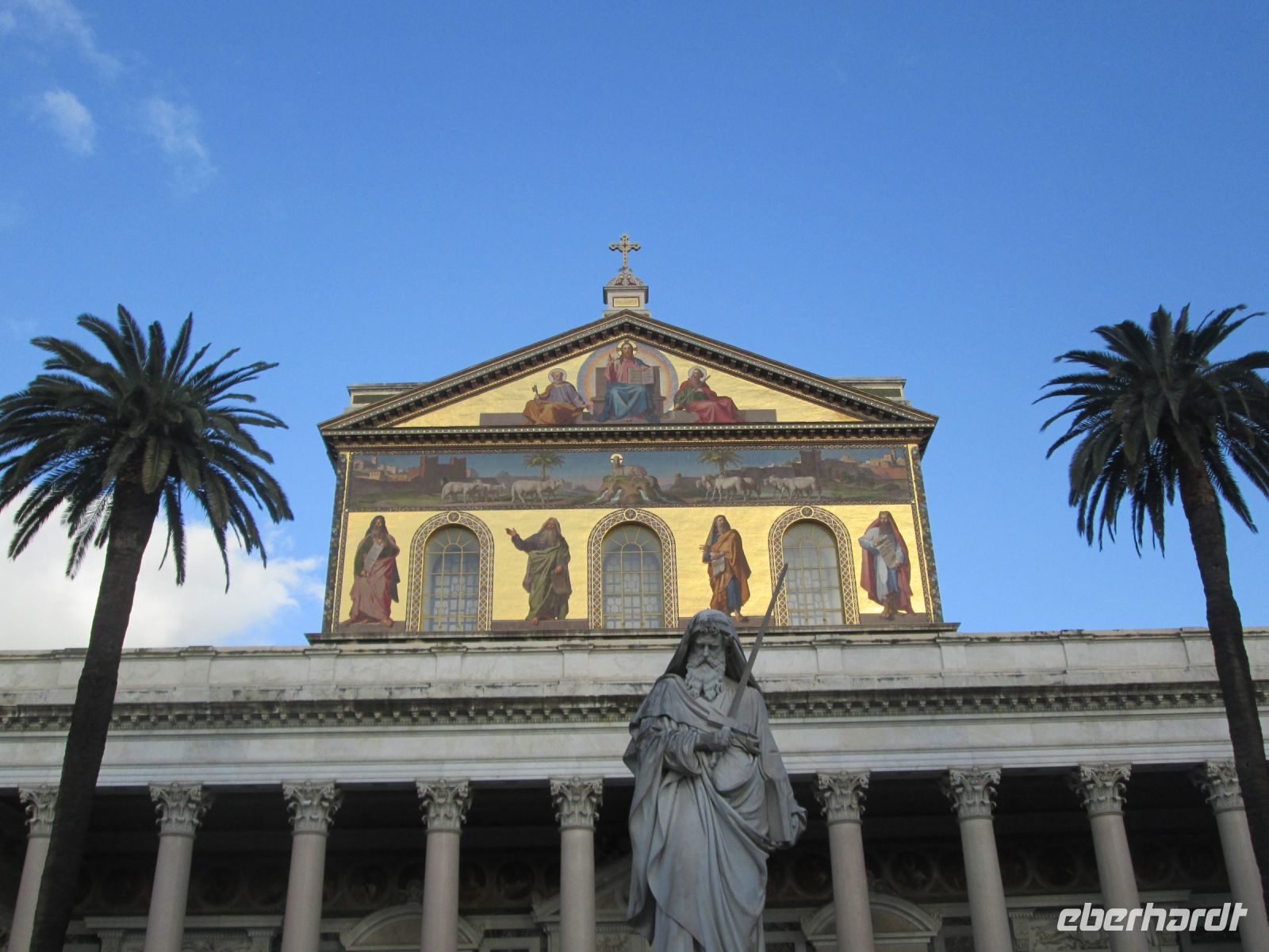 Einen ersten Höhepunkt am Ankunftstag stellte die zusätzliche Besichtigung der Basilika St. Paul vor den Mauern dar. Sie gehört zu den exterritorialen Patriarchalbasiliken des Vatikan, d.h. sie befindet sich auf römischem Gebiet, unweit unseres Hotels. Warum also nicht die Gelegenheit nutzen? Das Wetter war hervorragend, die Sonne schickte ihre Strahlen auf das große Mosaik auf der Westseite der Fassade und glänzte in den kräftigsten Farben. Wir bekamen im Innenhof zunächst Informationen über den Heiligen Paulus, die Fassade mit ihren Portalen, zu denen auch die Heilige Pforte gehört und zum verheerenden Brand im Jahre 1823. Nach dieser allgemeinen Einführung ging es natürlich auch zur Besichtigung in das Innere. Ein "Wow" war nicht zu überhören. Die Ausmaße dieser Basilika sind mit etwa 130 Metern Länge und 65 Metern Breite enorm. Über dem Langhaus und dem Querschiff breiten sich runde Mosaik-Papstportraits aus. Der jeweilige Papst im Amt wird beleuchtet. Bei den verstorbenen Vorgängern wir das Pontifikat exakt in Jahr, Monat und Tag angegeben.
