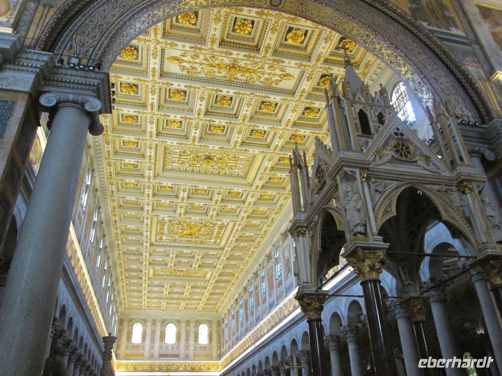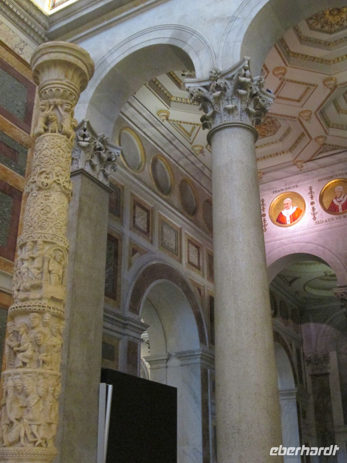 Da die Osterfeierlichkeiten gerade zu Ende gegangen waren, spielte natürlich auch der Osterleuchter eine Rolle, welcher zum Tragen der Osterkerze entwickelt wurde. Gerade in St. Paul vor den Mauern befindet sich ein wunderbares Beispiel für die Arbeiten der Steinmetzen, die im 13. Jahrhundert in Rom tätig waren. Mit einer Höhe von fast 6 Metern und seiner dekorierten Oberfläche gehört er zu den Hauptwerken im Inneren. Neben ihm befindet sich das gotische Ziborium und der Papstaltar. Genau wie in der Petersbasilika zelebriert nur der Papst dort seine Messen. Ausnahmen durch eine andere Person gibt es sehr selten. Weitere Informationen gab es zum Apsismosaik, das von Papst Honorius III. in Auftrag gegeben wurde und den thronenden Christus im Mittelpunkt darstellt.
