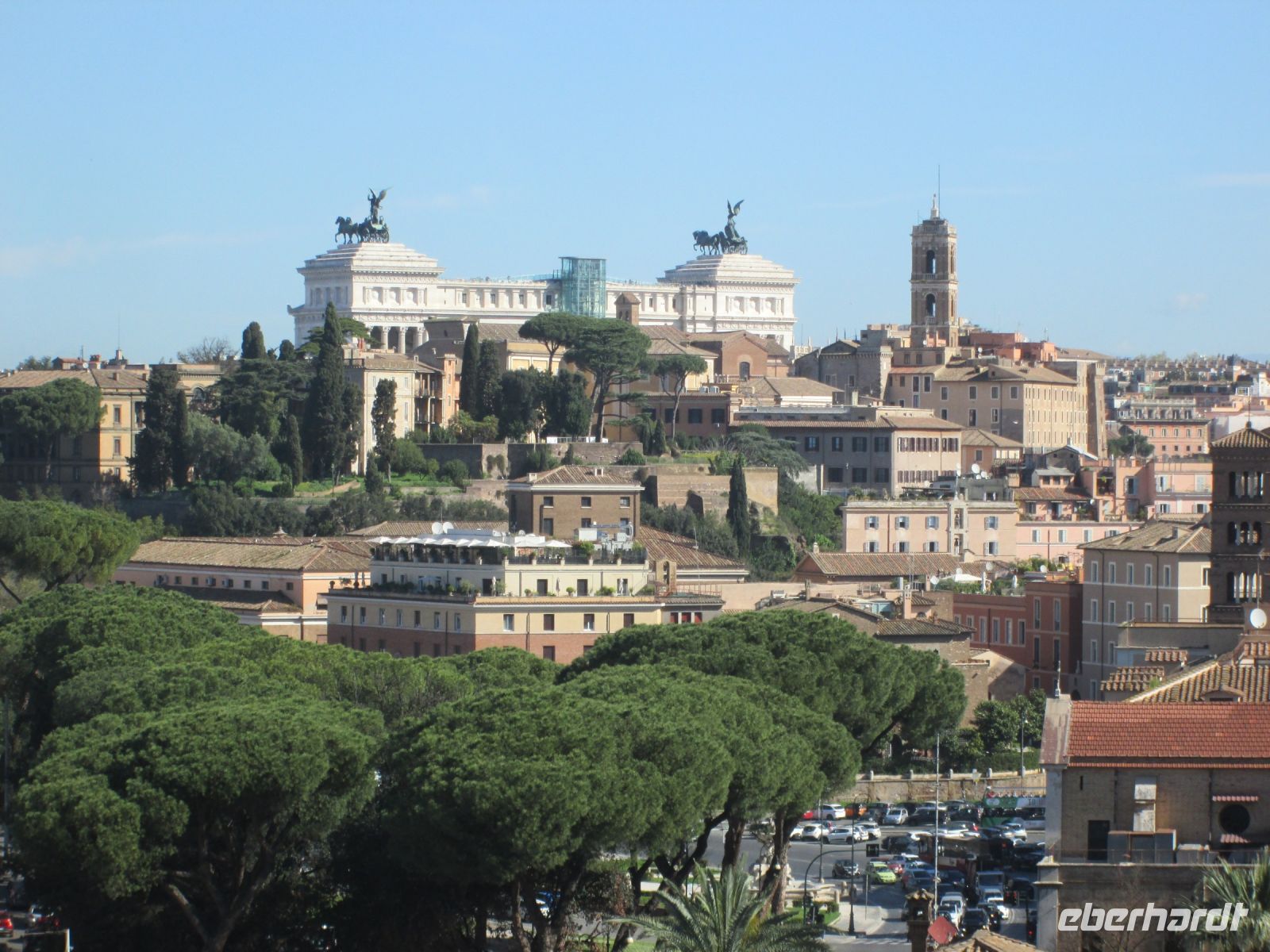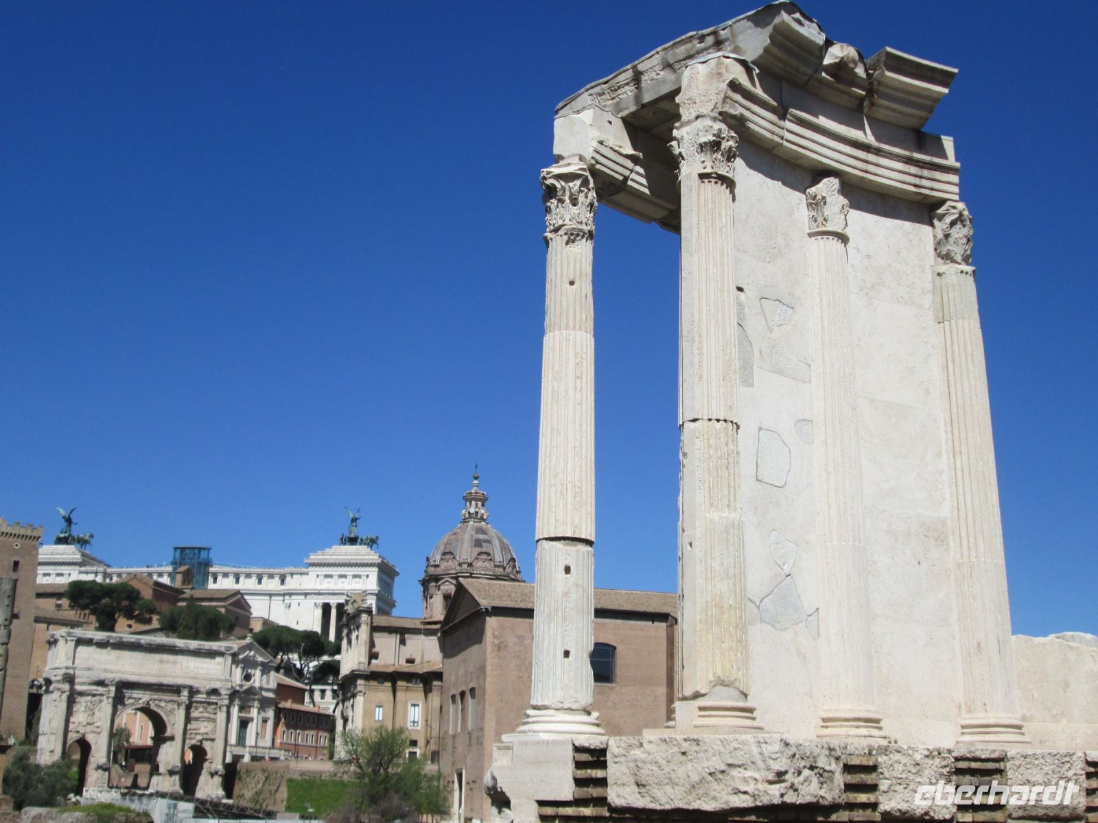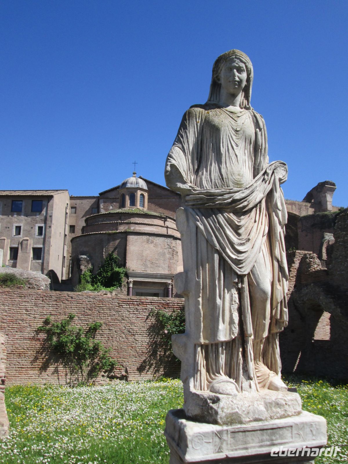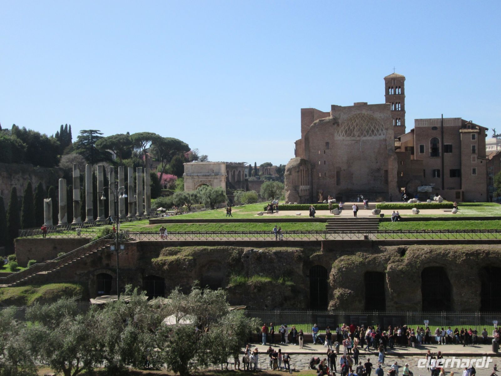 Das Forum Romanum auf der gegenüberliegenden Seite war der zentrale Versammlungsplatz im alten Rom. Von den einstigen Prachtbauten sind heute nur noch Ruinen vorhanden. Rekonstruktionen verdeutlichen die frühere Größe. Es wurde z.B. Recht gesprochen, Rat gehalten, geopfert und das ewige Feuer seitens der Vestalinnen gehütet. Wehe die Jungfrauen aus vornehmen Kreisen ließen das Feuer ausgehen. Dies galt als großes Unglück und wurde als Zeichen des bevorstehenden Untergangs von Rom gewertet. Die Vestalinnen bezahlten dies mit ihrem Leben, in dem sie lebendig eingemauert wurden.