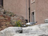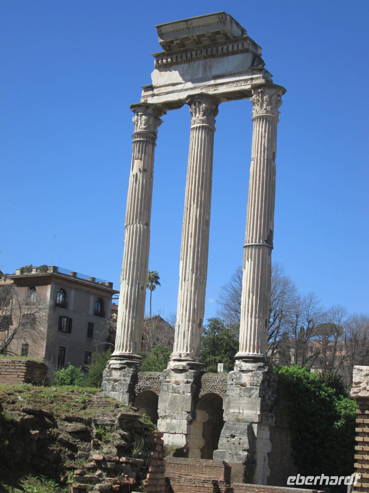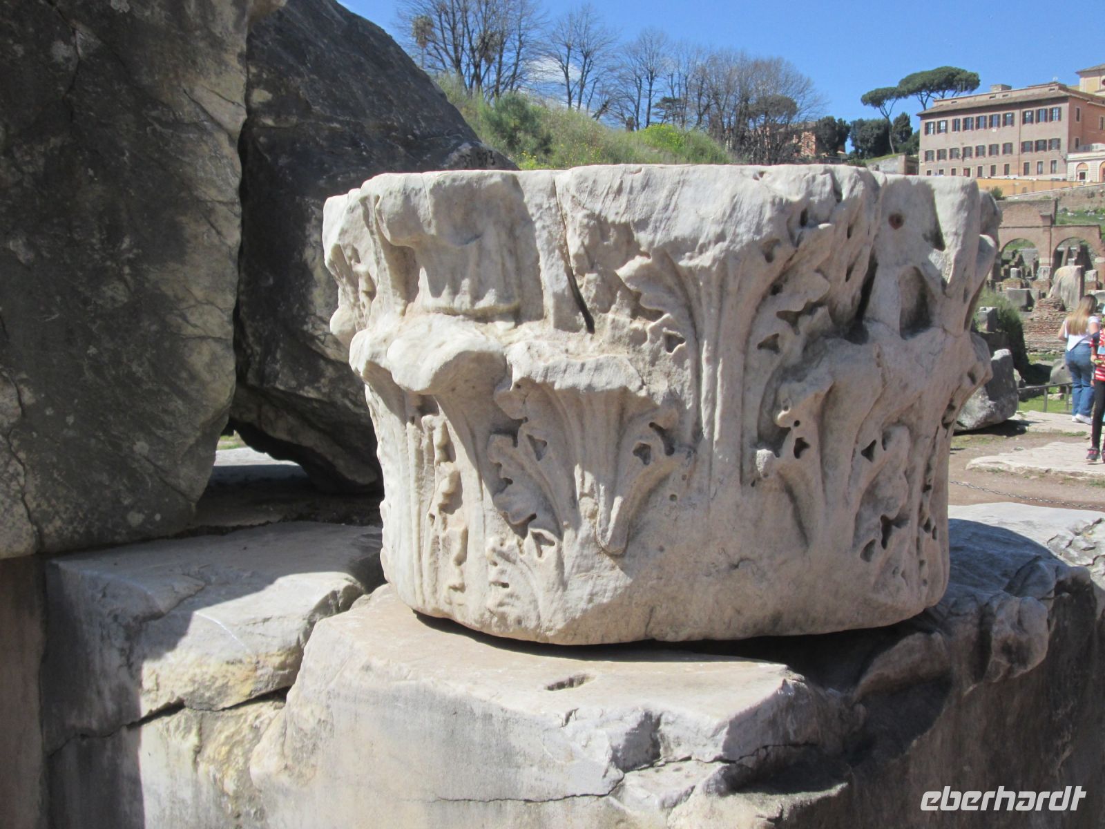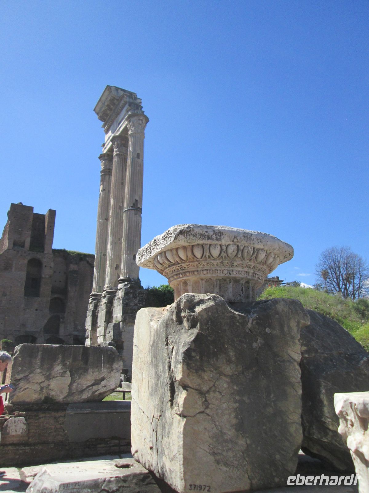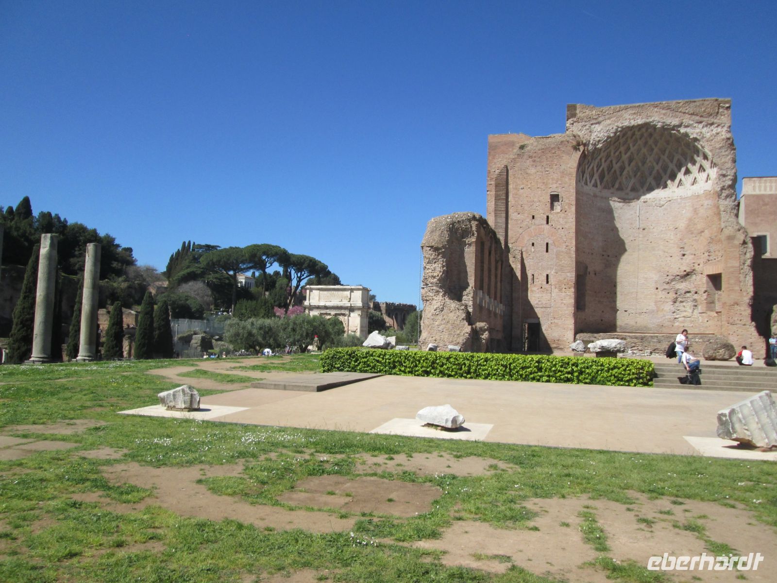 Das Forum Romanum auf der gegenüberliegenden Seite war der zentrale Versammlungsplatz im alten Rom. Von den einstigen Prachtbauten sind heute nur noch Ruinen vorhanden. Rekonstruktionen verdeutlichen die frühere Größe. Es wurde z.B. Recht gesprochen, Rat gehalten, geopfert und das ewige Feuer seitens der Vestalinnen gehütet. Wehe die Jungfrauen aus vornehmen Kreisen ließen das Feuer ausgehen. Dies galt als großes Unglück und wurde als Zeichen des bevorstehenden Untergangs von Rom gewertet. Die Vestalinnen bezahlten dies mit ihrem Leben, in dem sie lebendig eingemauert wurden.