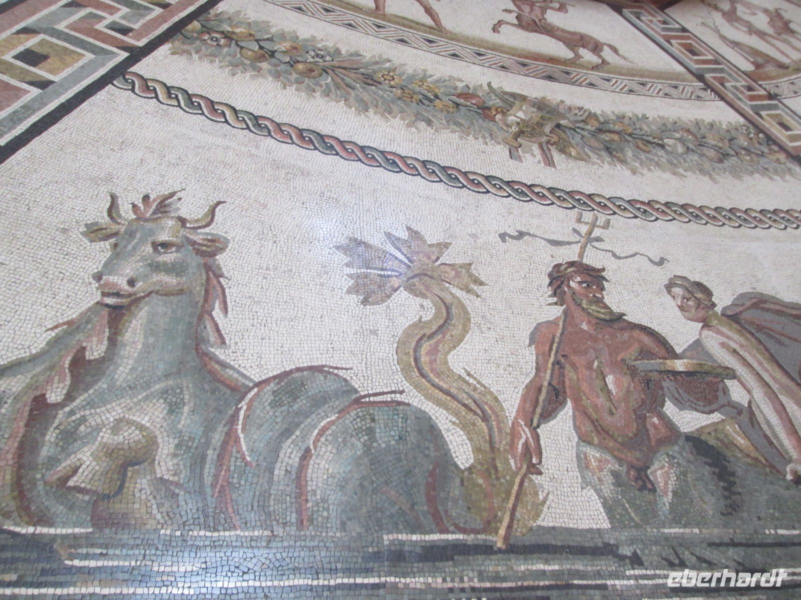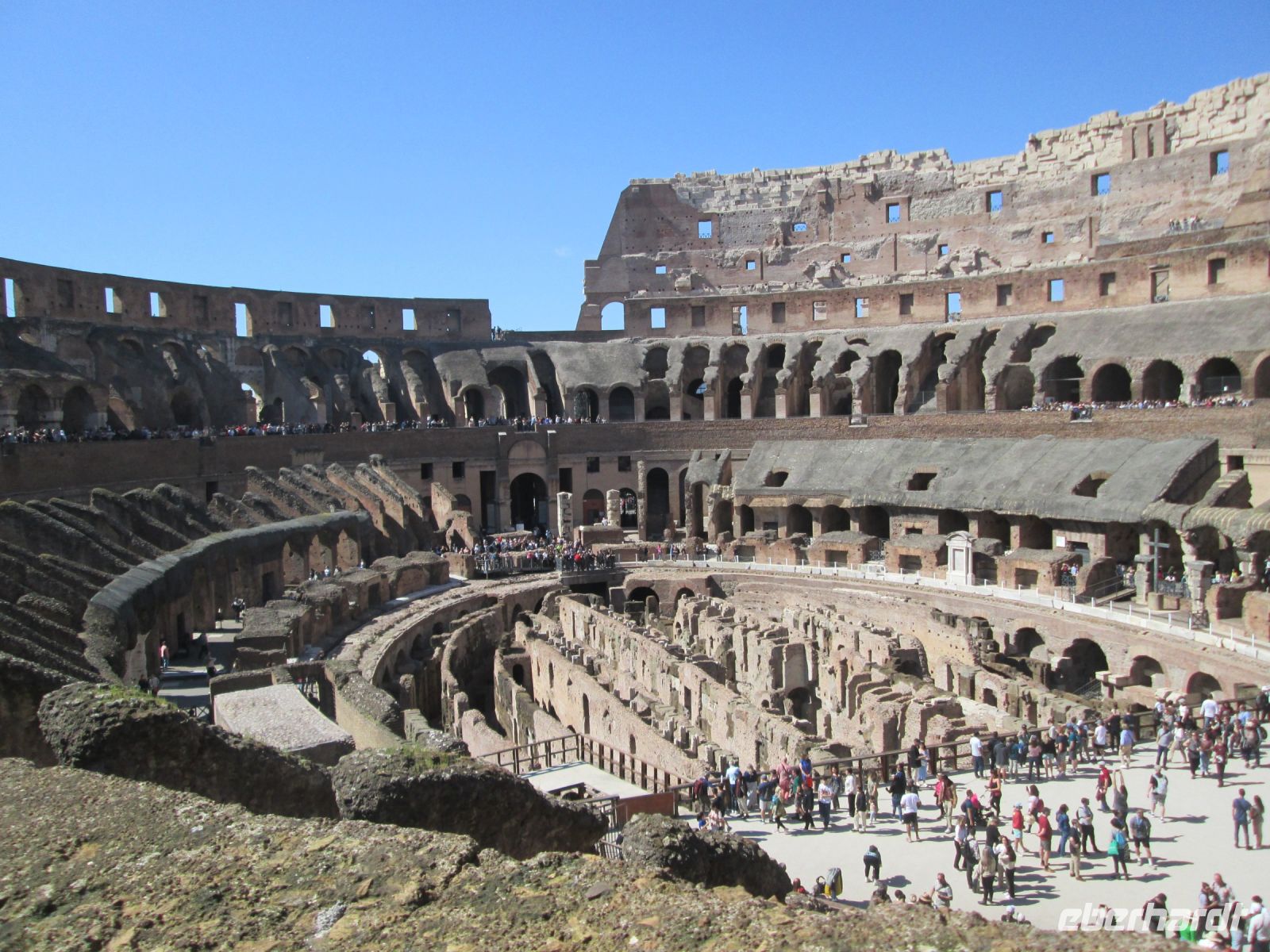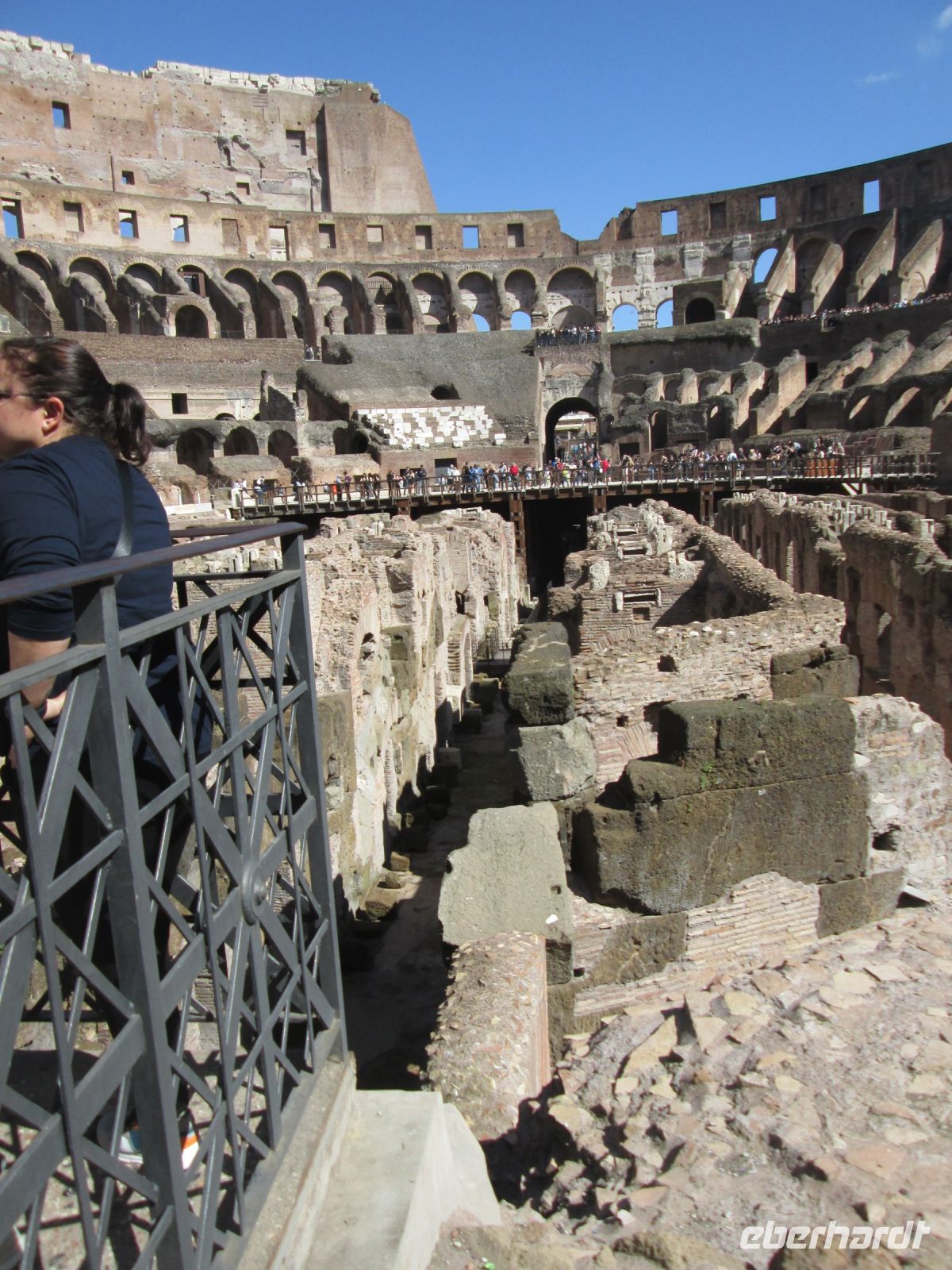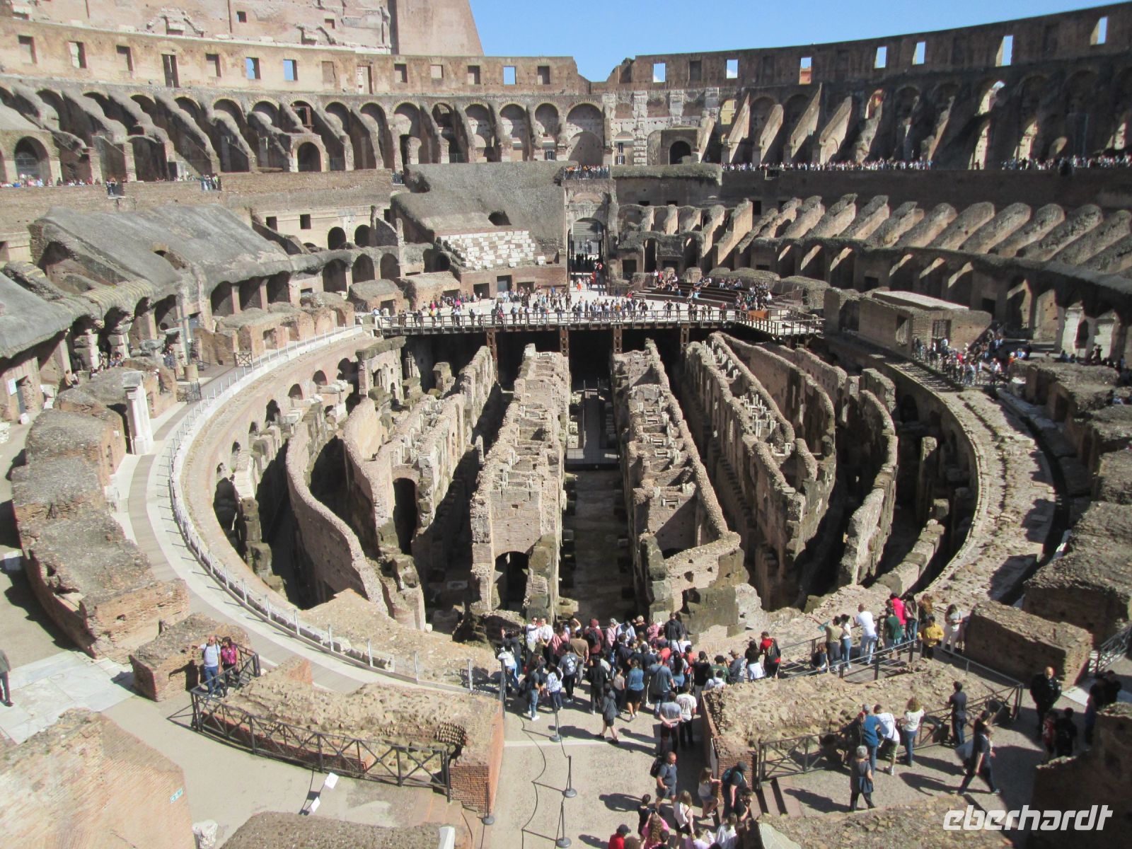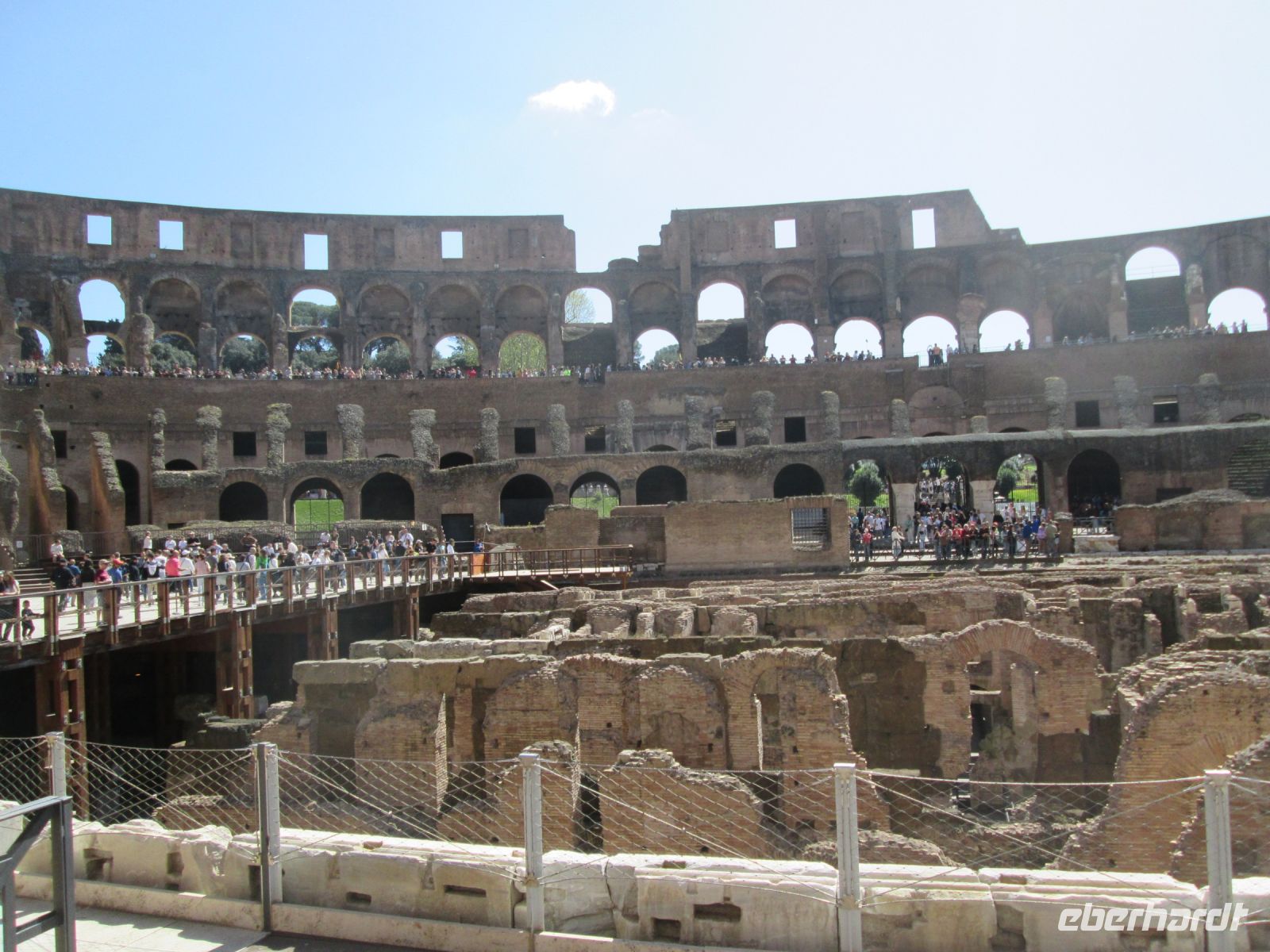 Die Renndistanz lag meist bei 7 Runden. Leider forderten diese Rennen auch viele Opfer unter Mensch und Tier, was im Kolosseum nicht anders war. Brot und Spiele waren an der Tagesordnung. In unglaublichen 9 Jahren wurden über 100000 Steinblöcke übereinander gesetzt und mit Metallstreben verbunden. Circa 2000 Jahre später befanden wir uns in diesem einzigartigen Zeugnis römischer Baukunst. Sylvia erklärte uns die Sitzordnung: Kaiser, Konsuln und Vestalinnen saßen am Rand der Arena und damit unmittelbar am Geschehen, während die niederen Klassen und die Frauen oben saßen. Unter dem Kolosseum gab es ein Netz von Tunnelgängen, durch welche Tiere getrieben und oben entsetzlich niedergemetzelt wurden. Oder die Gladiatoren wurden mittels Flaschenzügen nach oben gezogen, um dann mit Netz und Dreizack um ihr Leben zu kämpfen. Es konnte sogar das Innere geflutet werden, um Seeschlachten der Meute zu bieten.
