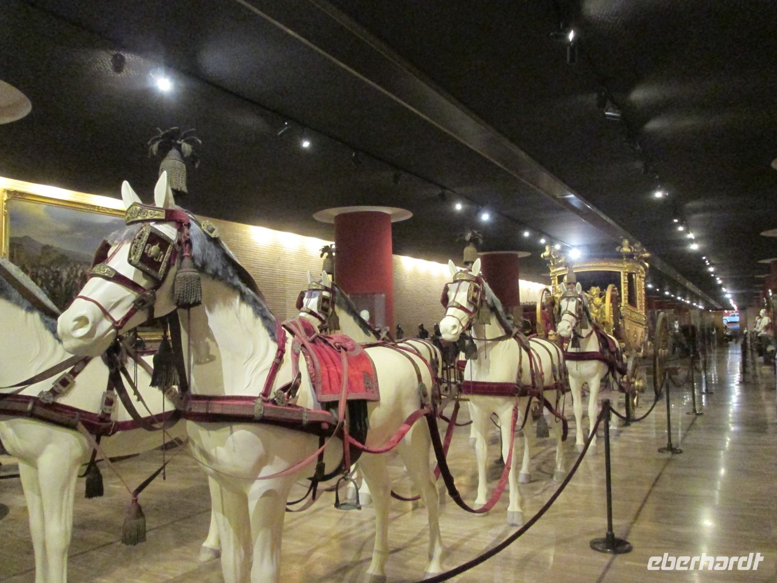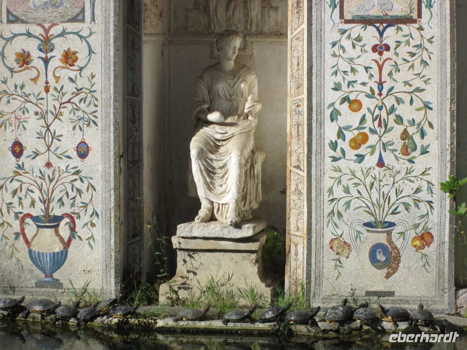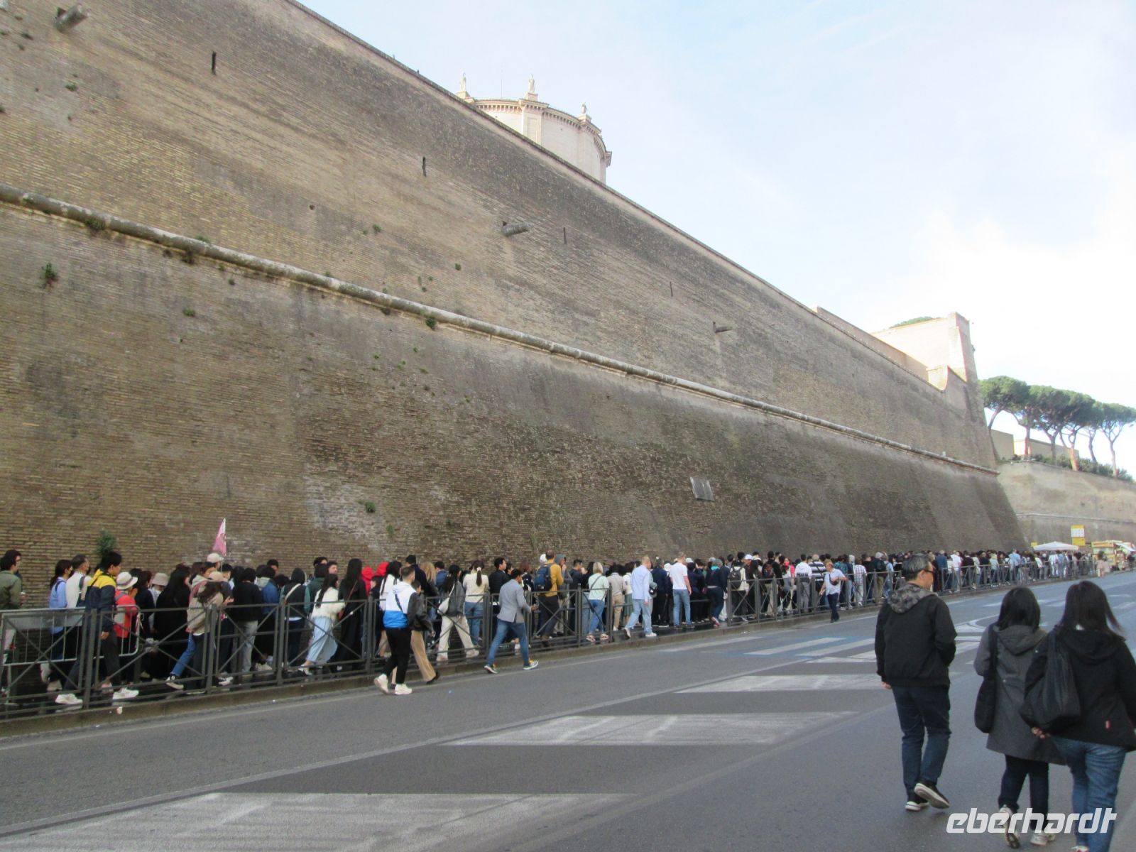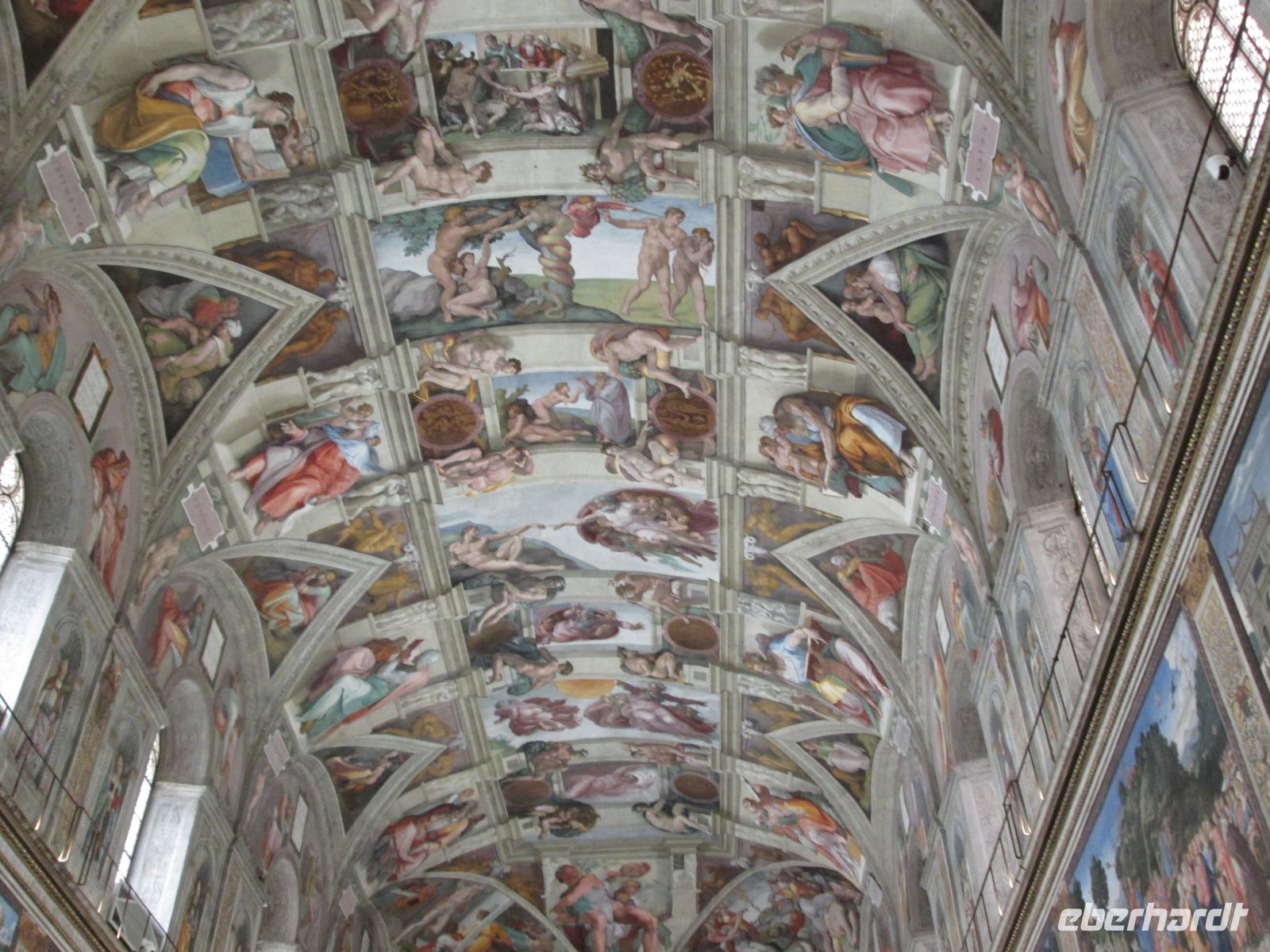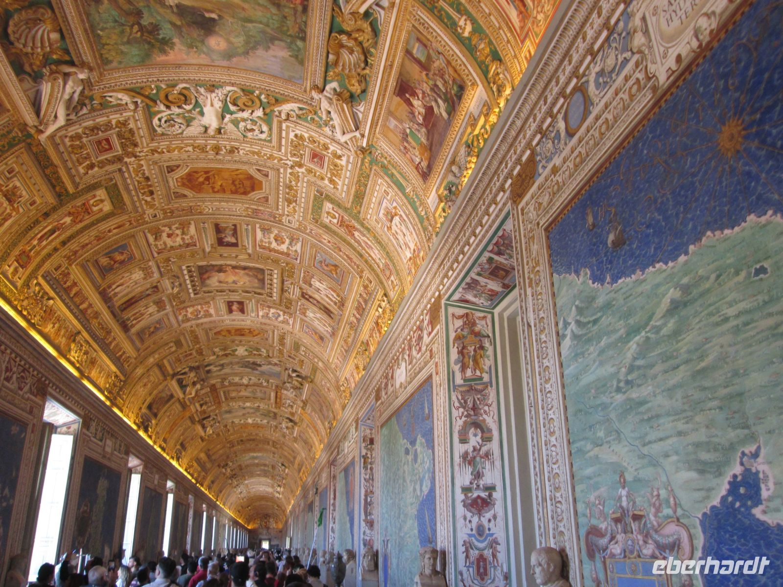 Grotten mit sich dort wohlfühlenden Schildkröten, Wasserspiele, Mammut-und Olivenbäume, Steingärten, Hecken, Paläste, ein Bahnhof, ein Hubschrauberlandeplatz u.v.m. bilden ein herrliches Miteinander, in das man gern eintaucht, die Ruhe genießt und somit Lärm und Hektik der Millionenmetropole entflieht. Dieses sanfte Wohlfühlen war nach 45 Minuten beendet, denn Ruhe gab es in den sich anschließenden vatikanischen Museen nicht wirklich. Tausende von kunstinteressierten Besuchern schlängeln sich fast täglich durch die schier endlos erscheinenden Korridore, vorbei an einem unerschöpflichen Reichtum an Kunstschätzen. Ob etruskische Abteilung, Kutschenmuseum, Gemäldegalerie oder die berühmte Sixtinische Kapelle, für uns bedeutete es nur ein kleiner Auszug im großen Reich der Kunst.