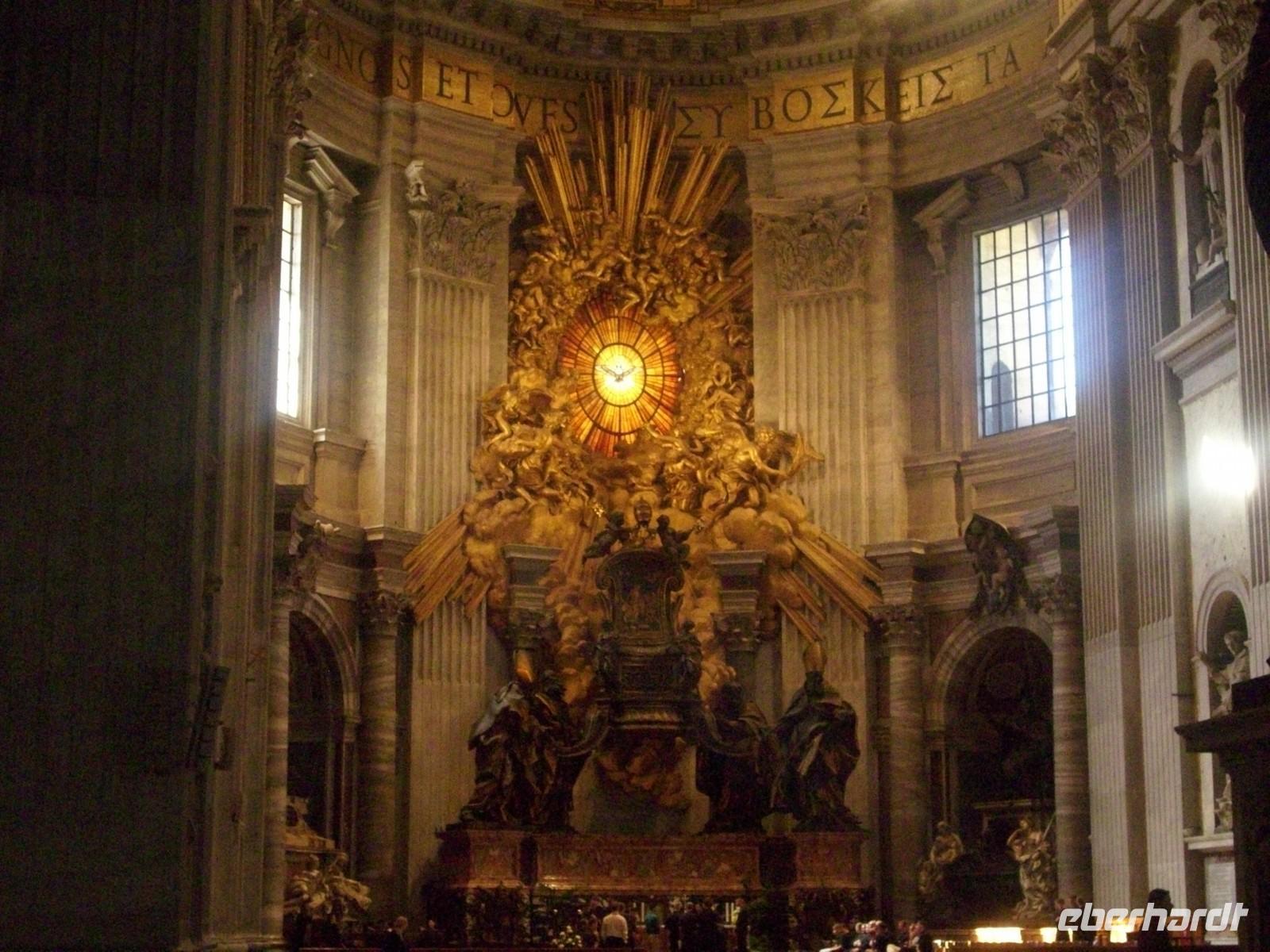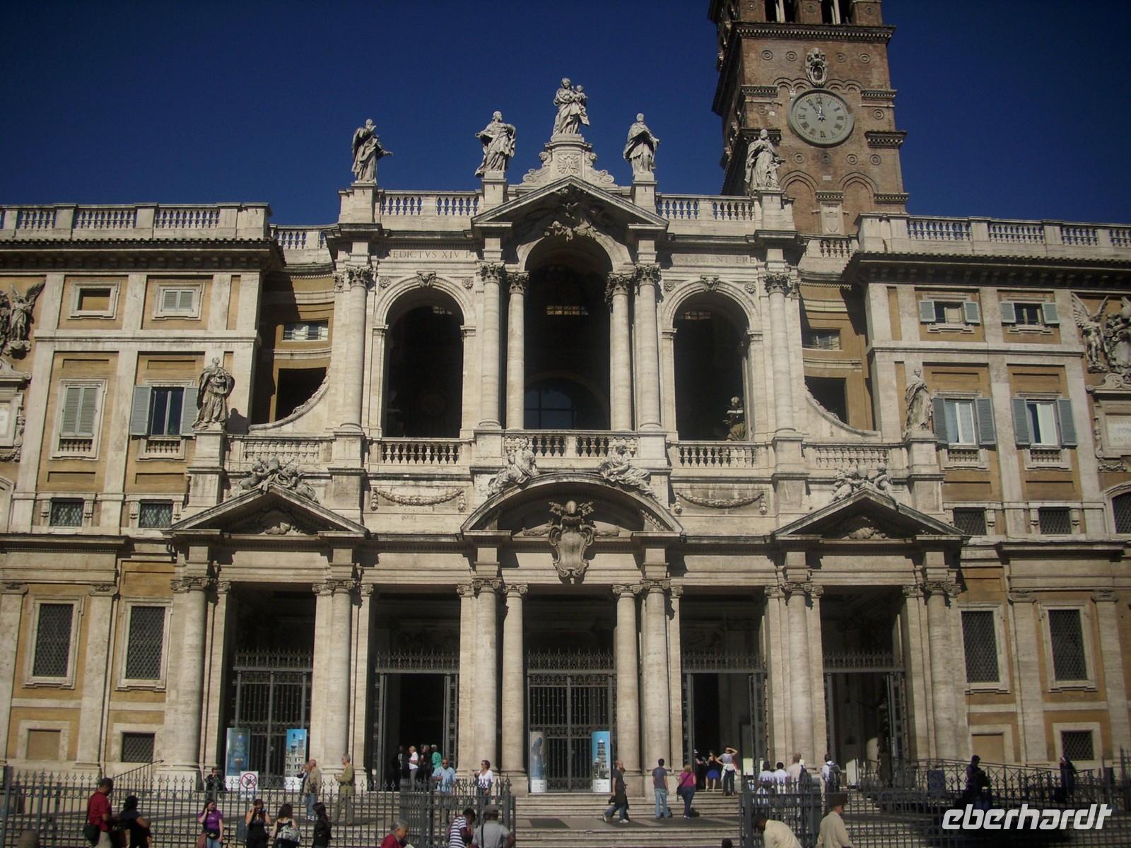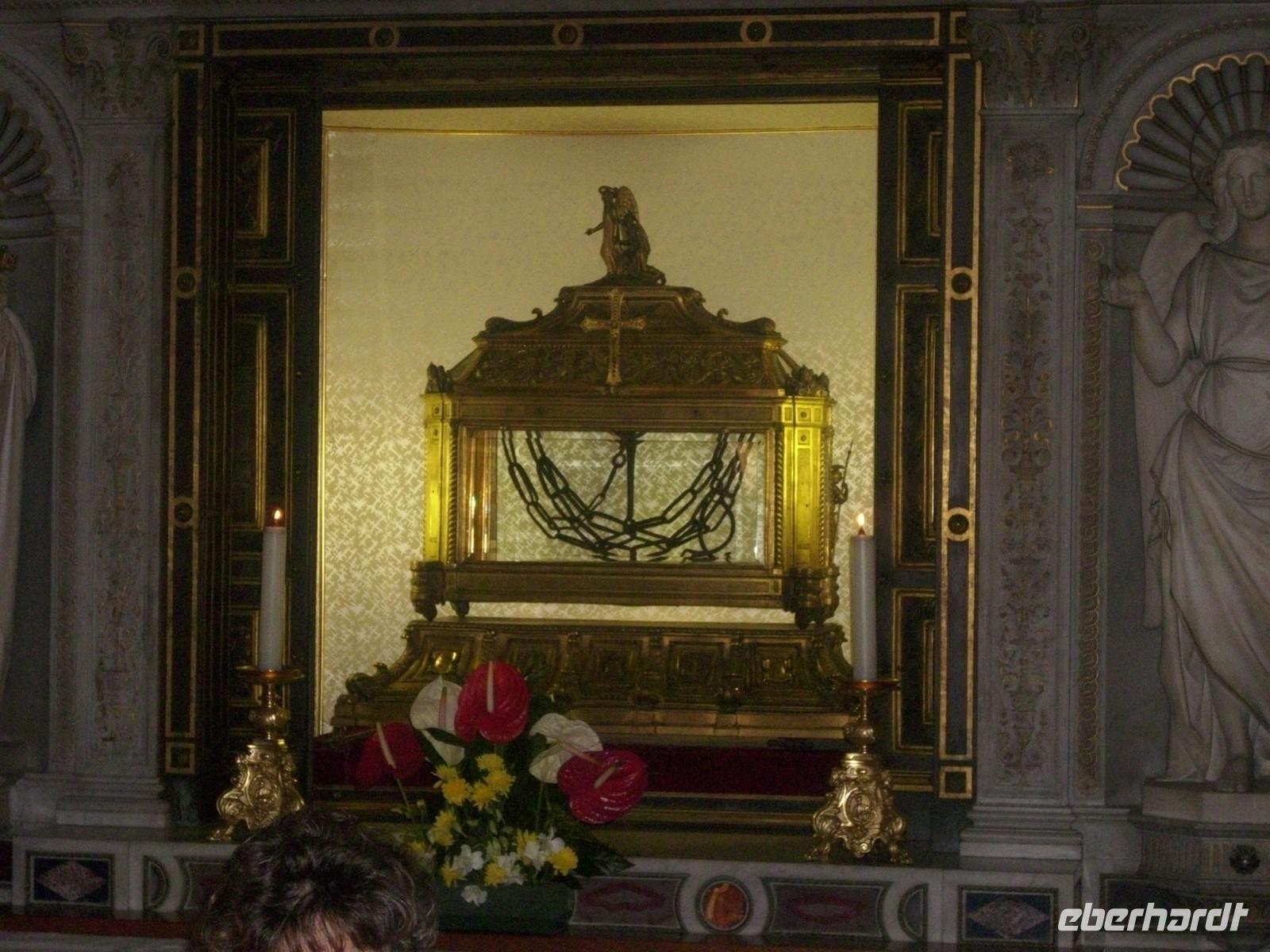 Ketten, mit denen Petrus im Mamertinischen Kerker festgeschmiedet gewesen sein soll, als Reliquie. Wie alle Besucher bestaunen wir den von Michelangelo geschaffenen "Moses".Entlang der Via dei Fori Imperiali, entlag am Foro Romano gelangen wir auf den Hauptberg, das Kapitol. Auf der Piazza del Campidoglio steht die Kopie des Reiterstandbildes von Kaiser Marc Aurel, die Pläne zur Platzgestaltung stammen von Michelangelo.Über die Flachtreppe geht’s hinab zur Piazza Venezia, an deren Südseite das Nationaldenkmal für Viktor Emanuell II. steht.Durch verwinkelte Gassen erreichen wir zur Mittagszeit den Fontana di Trevi, den monumentalsten Brunnen Roms.Endlich Zeit zum verschnaufen, Mittagspause!!!Das Pantheon, Mittelpunkt der Altstadt und das besterhaltenste Bauwerk der römischen Antike, bildet den Auftakt nach der Pause.Im Inneren befinden sich unter anderem die Gruft von Viktor Emanuell II und die Grabstätte von Raffael.Auf dem Weg zur Spanischen Treppe machen wir noch einen kurzen Abstecher in die Kirche Sant` Ignazio. Im Inneren der Jesuitenkirchegelang Andrea Pozzo ein malerisches Kunstwerk, die Kuppel - die man zu sehen glaubt - ist Illusion.Zum Ende der Stadtführung erreichen wir über die Via del Corso diePiazza del Spagno. Die Spanische Treppe -Scalianata della Trinita dei Monti - eine der größten Attraktionen von Rom, wurde im Stil des Barock angelegt und auch wir nutzen die Möglichkeit um auf den Stufen auszuruhen. Christliches Rom An diesem Morgen treffen wir Maria Teresa an der Scala Santa. Diese befindet sich gegenüber dem Lateranspalast, in einem Gebäude aus dem 16. Jahrhundert. Die heilige Treppe führt hinauf zur Kapelle Sancta Sanctorum, die Privatkapelle der Päpste. San Giovanni in Laterano, ist eine der Patriarchalkirchen, die Mutter und das Haupt aller Kirchen von Rom. Das Innere der Basilika hat im 16./17. Jahrhundert durch Borromini seine heutige Gestalt erhalten.Auf dem Weg durch das christliche Rom erreichen wir mit den öffentlichen Verkehrsmitteln die nächste Patriarchalkirche.