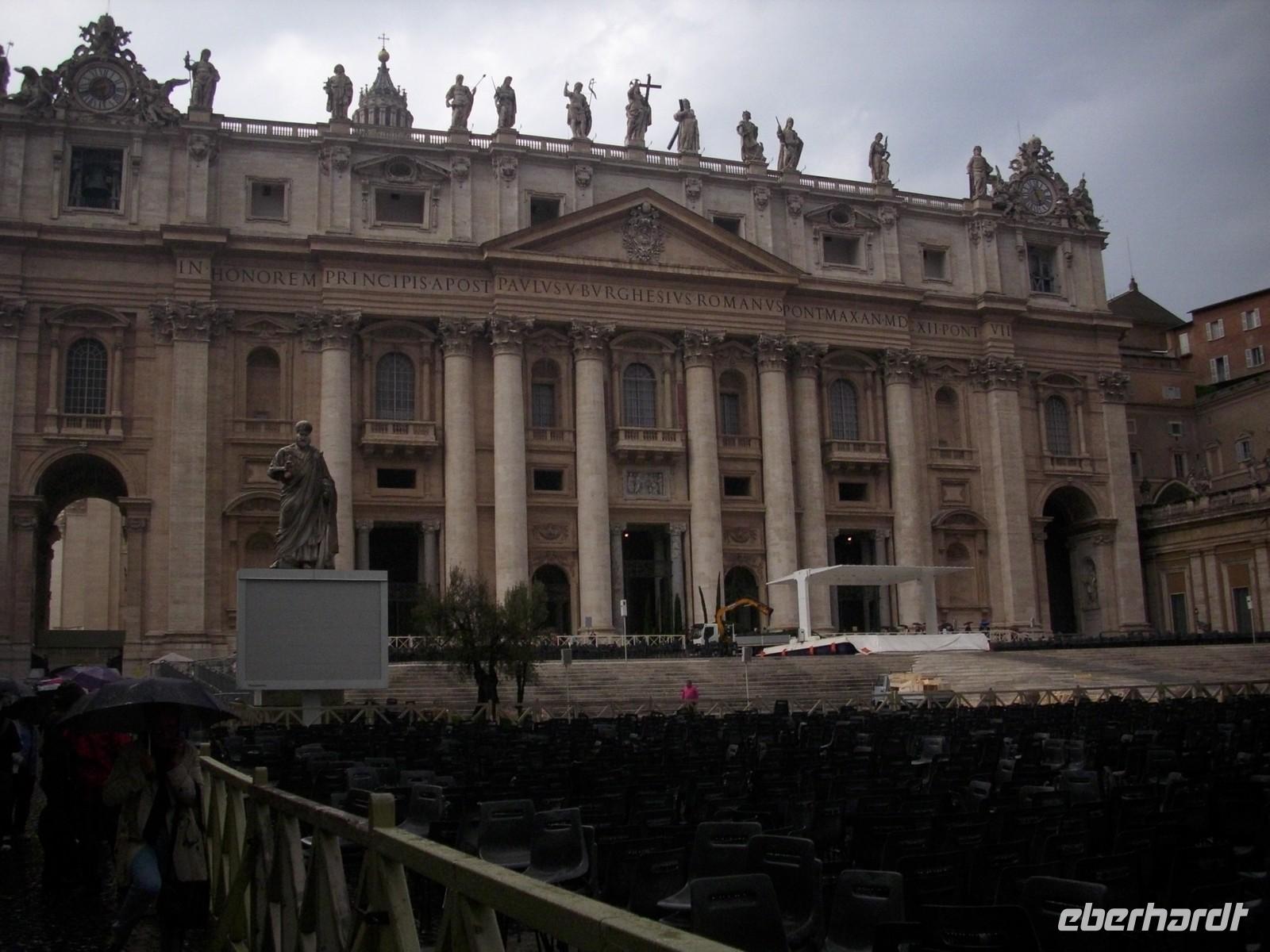 Der Petersdom erstreckt sich auf einer Länge von 211 m, 186 m an ihrer breitesten Seite und hat eine Höhe von 132 m. 60 000 Menschen finden hier Platz. Verschiedene Baumeister haben an ihrem Bau mitgewirkt, unter anderem Donato Bramante, Michelangelo, Carlo Maderna.
