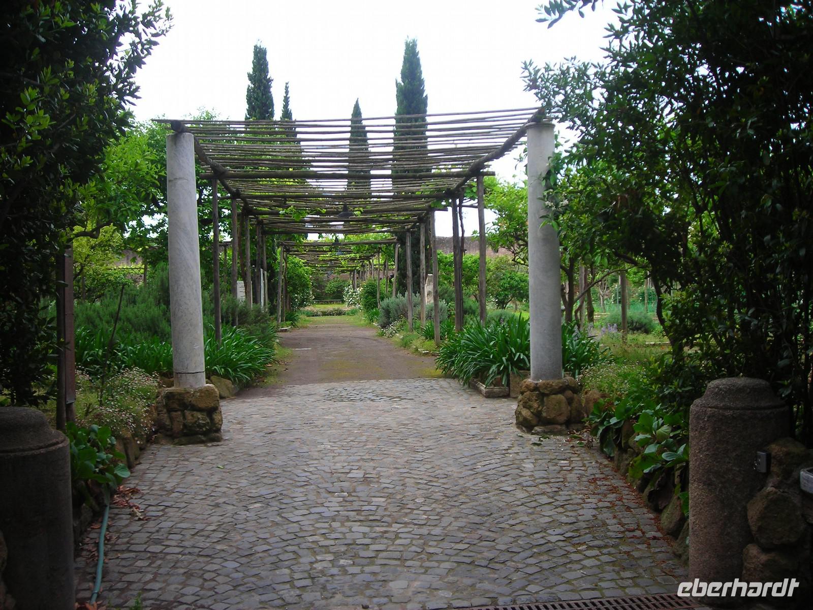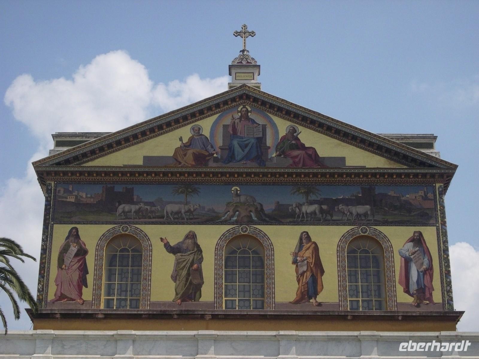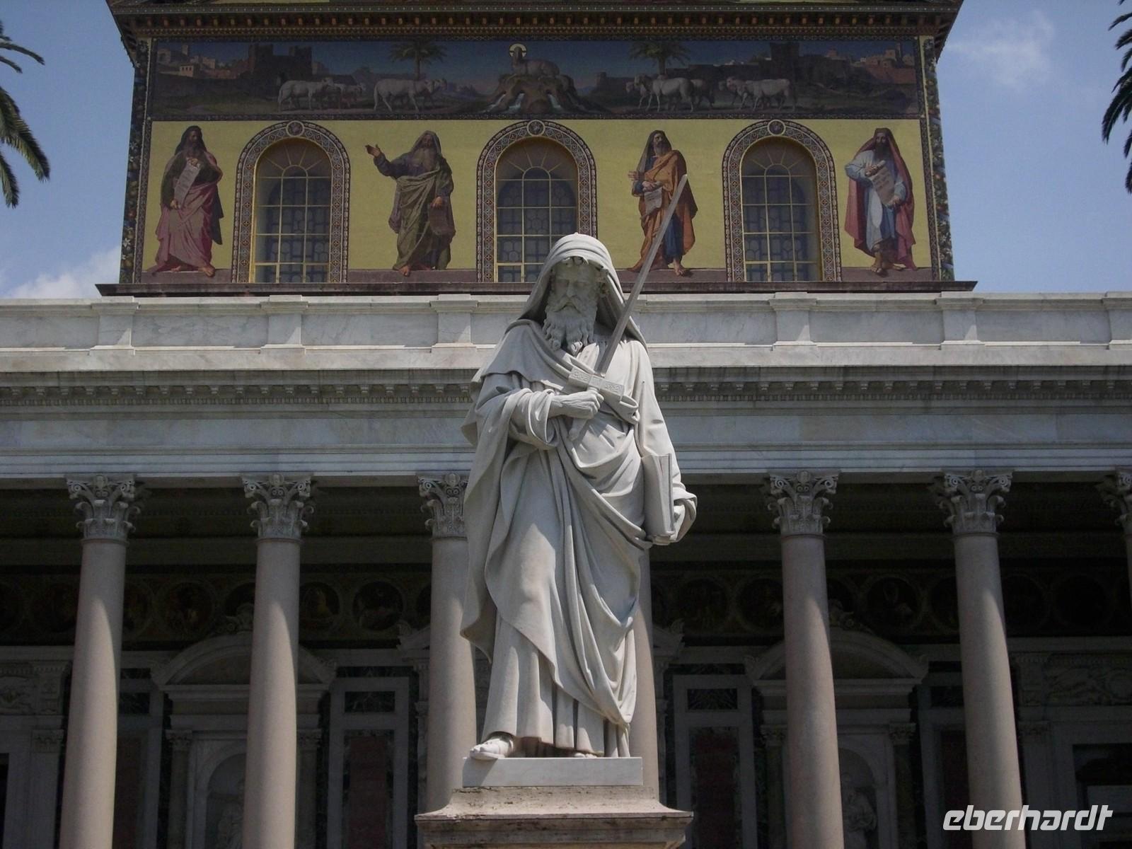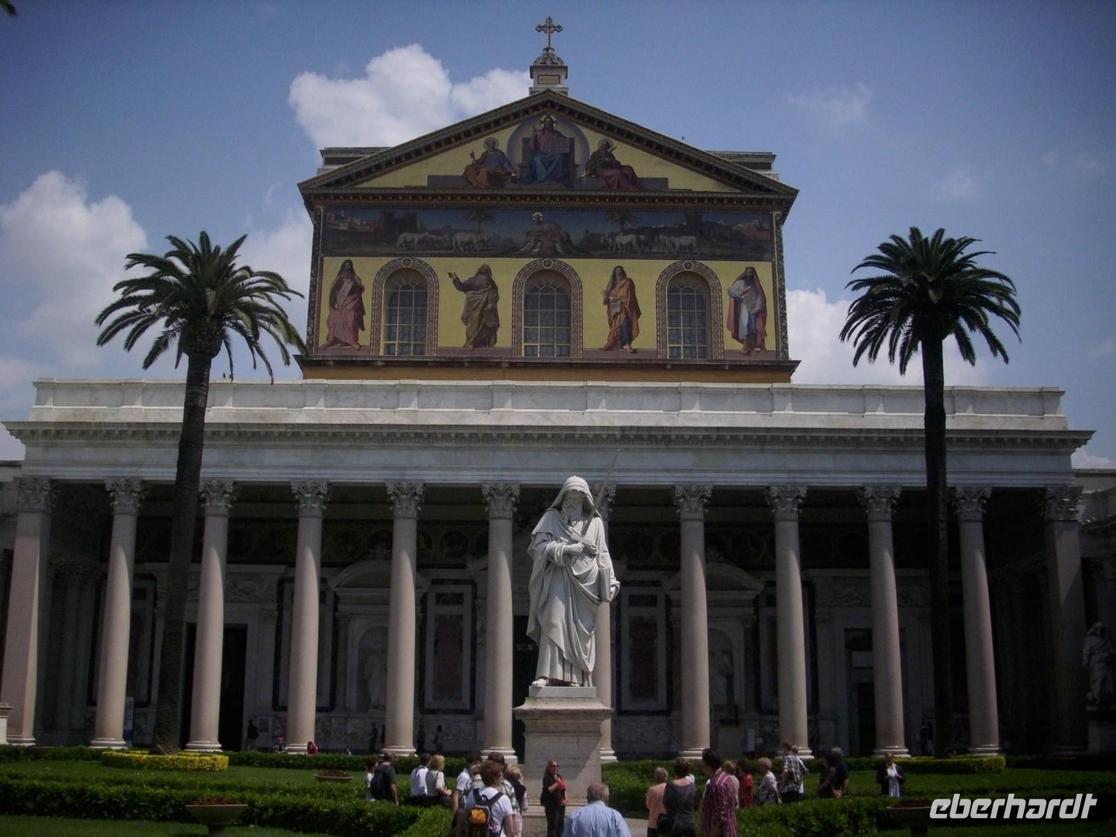 Normalerweise wären wir jetzt zur Peterskirche gefahren, doch diese ist ja geschlossen. Als Alternative besichtigen wir die vierte der Patriachalskirchen von Rom. Sant Paul vor den Mauern, San Paolo fuori le Mura. Sie wurde im Jahre 324 von Konstantin dem Großen als Gedächtniskapelle über dem Grab des Apostel Paulus gegründet, der mit dem Schwert enthauptet und vor den Mauern von Rom beigesetzt worden ist. Auch hier befindet sich eine der Heiligen Pforten, die alle 25 Jahre geöffnet werden, deshalb auch Ziel vieler Pilger. Die fünfschiffige Basilika ist 120 m lang, 60 m breit und 23 m hoch. Achtzig Granitsäulen trennen die einzelnen Schiffe. Über den Säulen sieht man die Portraitmedaillons aller Päpste von Petrus bis Benedikt XVI.