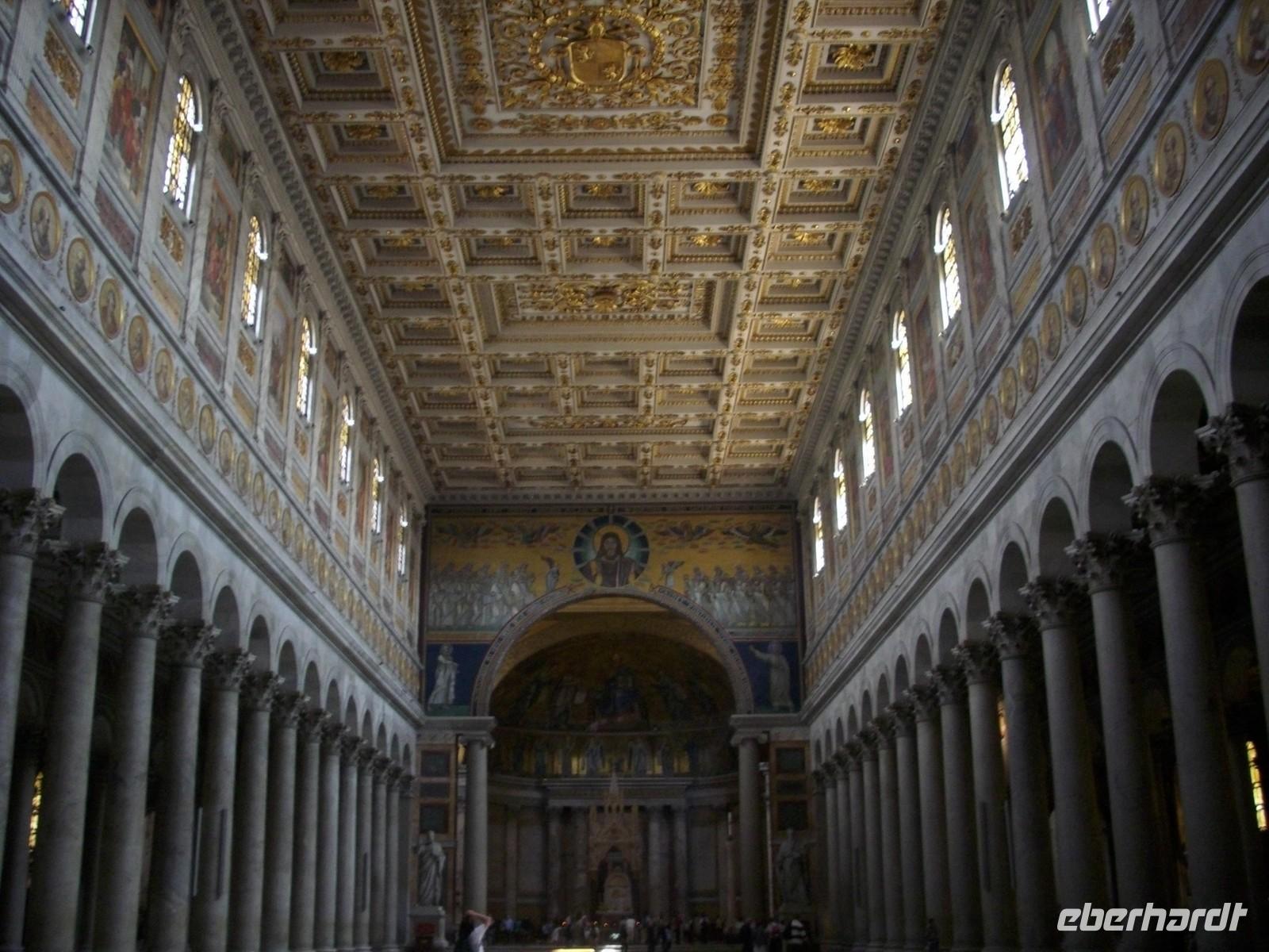 Santa Maria Maggiore, auf dem Esquilin, sie ist die größte der Marienkirchen in Rom. Nach dem „ Wunder des Schnees „ errichtet, wurde sie im Laufe der Jahrhunderte mehrfach umgebaut. Die Kirche besticht durch ihre prachtvolle Ausschmückung. Besonders beeindruckend für die Besucher ist die Kassettendecke, zu deren Vergoldung man das erste aus Amerika gekommene Gold verwendet hat.