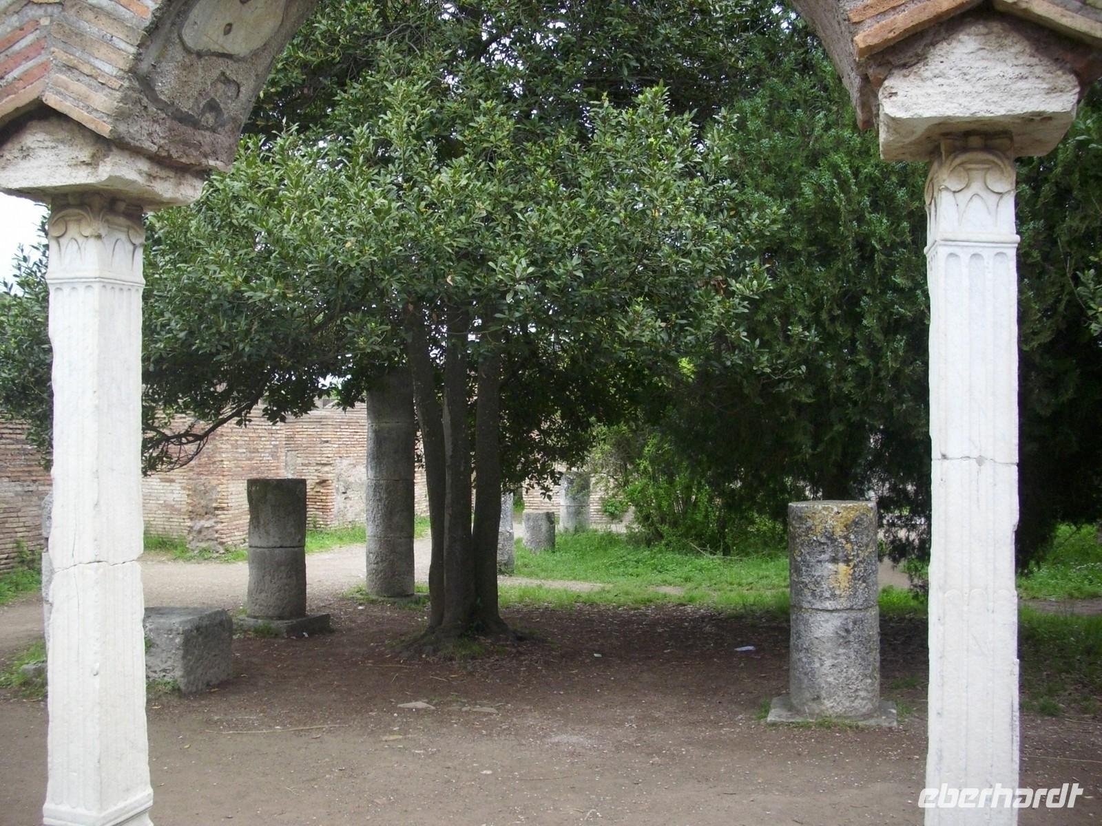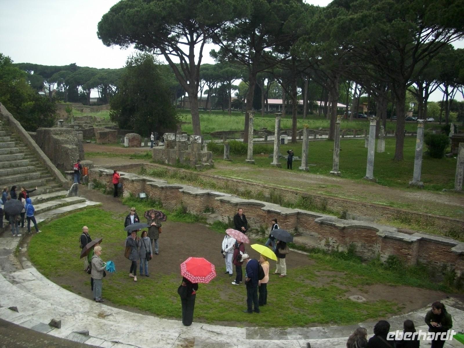 Weiter geht der Ausflug, mit einem örtlichen Reisebus, nach Ostia. Die alte Hafenstadt Roms, ist heute Ausgrabungsstätte. Gegründet im 4. Jahrhundert v. Ch. Durch die wachsende Bedeutung der römischen Flotte und des Mittelmeerhandels entwickelte sich Ostia zum wichtigsten Vorort. Bei einem Rundgang erhalten wir ein anschauliches Bild vom Leben in der antiken Stadt. Erhalten sind noch Reste von Mietshäusern, im Erdgeschoß befanden sich Ladengeschäfte. An der Decumanus Maximus, Hauptstraße des alten Ostia, befindet sich das Theater, das für etwa 2700 Personen Sitzplätze bot. Von den Sitzstufen aus hat man einen guten Blick auf die Ausgrabungen und der von Pinien gesäumte Platz war einst das Handelszentrum von Ostia.