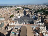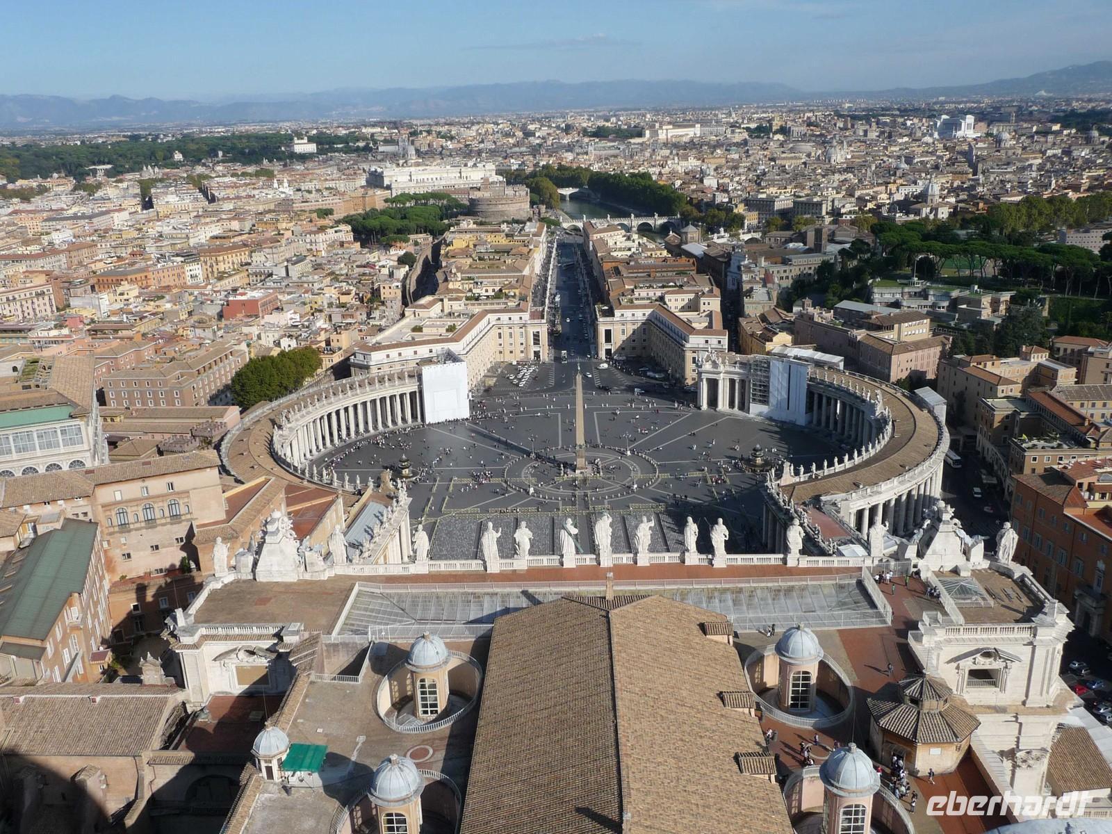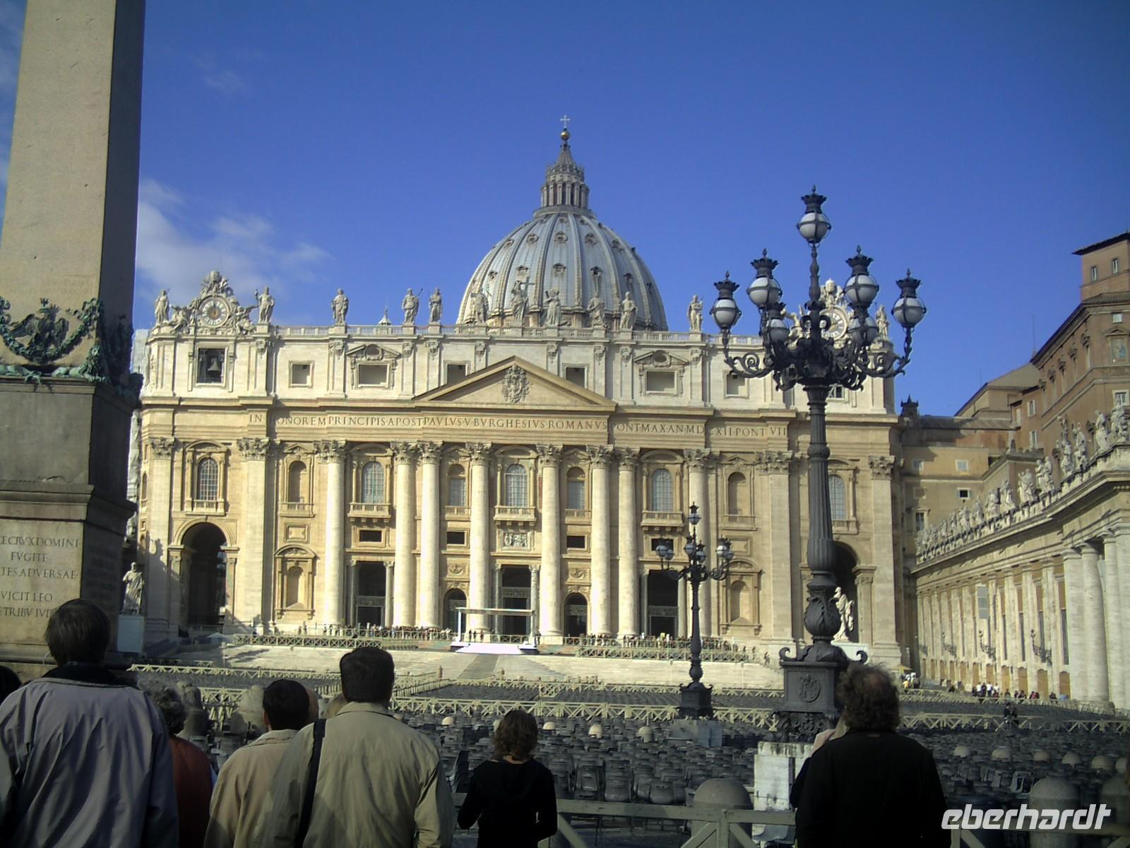 Heute treffen wir unsere Stadtführerin Maria Teresa, vor der heiligen Stiege. Natürlich wieder gut ausgestattet mit dem Eberhardt-Reiseleiterfunk begeben wir uns auf die Spuren durch das christliche Rom.Die Kirche St. Giovanni im Lateran, ist die Mutter und das Haupt aller Kirchen Roms. Mit ihr verbunden der Lateranspalast, er war jahrhundertelang der Sitz der Päpste.In der Mitte auf der Piazza San Giovanni befindet sich ein ägyptischer Obelisk, aus dem 15. Jahrhundert n. Ch.. Mit einer Höhe von 32 m ist er der größte seiner Art.Die Kirche ist Teil des Vatikans und somit bietet sich unseren Reisegästen schon jetzt die Gelegenheit „Gesegnete Post“ zu verschicken.Auf dem Weg durch das christliche Rom erreichen wir mit den öffentlichen Verkehrsmitteln die nächste Patriarchalkirche.Santa Maria Maggiore, auf dem Esquilin, sie ist die größte der Marienkirchen in Rom. Nach dem „Wunder des Schnees„ errichtet, wurde sie im Laufe der Jahrhunderte mehrfach umgebaut.Auf dem Platz vor der Kirche steht eine monumentale über 14 m hohe Mariensäule und das Innere der Kirche besticht durch die prachtvolle Ausschmückung, besonders beeindruckend für die Besucher ist die Kassettendecke, zu deren Vergoldung man das erste aus Amerika gekommene Gold verwendet hat.Santa Maria Maggiore ist Grablege vieler Päpste und dem Bildhauer und Architekten Gian Lorenzo Bernini.Mit dem Schnellbus erreichen wir zur Mittagszeit den Petersplatz. Bevor wir uns in die Schlange der Wartenden einreihen, um in die Peterskirche zu kommen, bleibt ausreichend Zeit für eine Mittagspause.Nach einer kurzen Wartezeit und der obligatorischen Sicherheitskontrolle sind wir dann imgrößten Kirchenbau der Welt.Der Petersdom erstreckt sich auf einer Länge von 211 m, 186 m an ihrer breitesten Seite und hat eine Höhe von 132 m. 60 000 Menschen finden hier Platz. Verschiedene Baumeister haben an ihrem Bau mitgewirkt, unter anderem Donato Bramante, Michelangelo, Carlo Maderna.Eine der Sehenswürdigkeiten im Innern ist Michelangelos Pieta. Sie befindet sich in der ersten Seitenkapelle. Michelangelo vollendete das Werk als er 25 Jahre alt war. Seit dem Attentat im Jahr 1972, als sie schweren Schaden genommen hatte, wurde sie nach den Renovierungsarbeiten hinter Panzerglas wieder aufgestellt.Leider waren an unserem Besuchstag im Petersdom wieder mal viele Absperrungen aufgebaut, sodass wir viele der Sehenswürdigkeiten nur von weitem sehen konnten.Aber der Weg vorn im Mittelschiff war frei. Hier ist eine rote Porphyrscheibe in den Boden eingelassen, auf der Karl der Große im Jahr 800 von Papst Leo III. zum Kaiser gekrönt wurde.Nach der Führung und Besichtigung bleibt noch Zeit um in die vatikanischen Grotten hinab oder auf die Kuppel hinauf zu steigen.