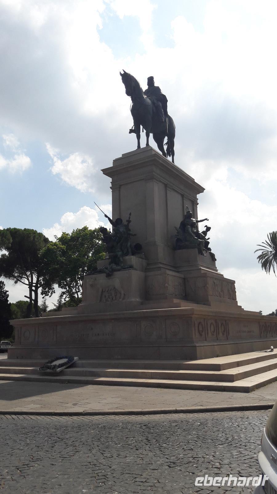 Doch wir sind tapfer und lassen uns von unserem Vorhaben nicht so leicht abbringen. Wir nehmen die Regionalbahn und kämpfen uns dann mühsam die Straßen hoch zum Hügel. Und wir werden belohnt mit einem atemberaubenden Blick auf die Stadt. Mit dem Einheitshelden Giuseppe Garibaldi (hoch zu Ross) im Rücken und einem erfrischenden, aber schnell davonlaufenden Eis in der Hand genießen wir das herrliche Panorama. Danach spazieren wir vorbei an der Fontana Acqua Paola hinunter nach TRASTEVERE, einem noch recht volkstümlichen Stadtteil von Rom (der Name leitet sich von „trans Tiberim" - auf der anderen Seite des Tibers ab).