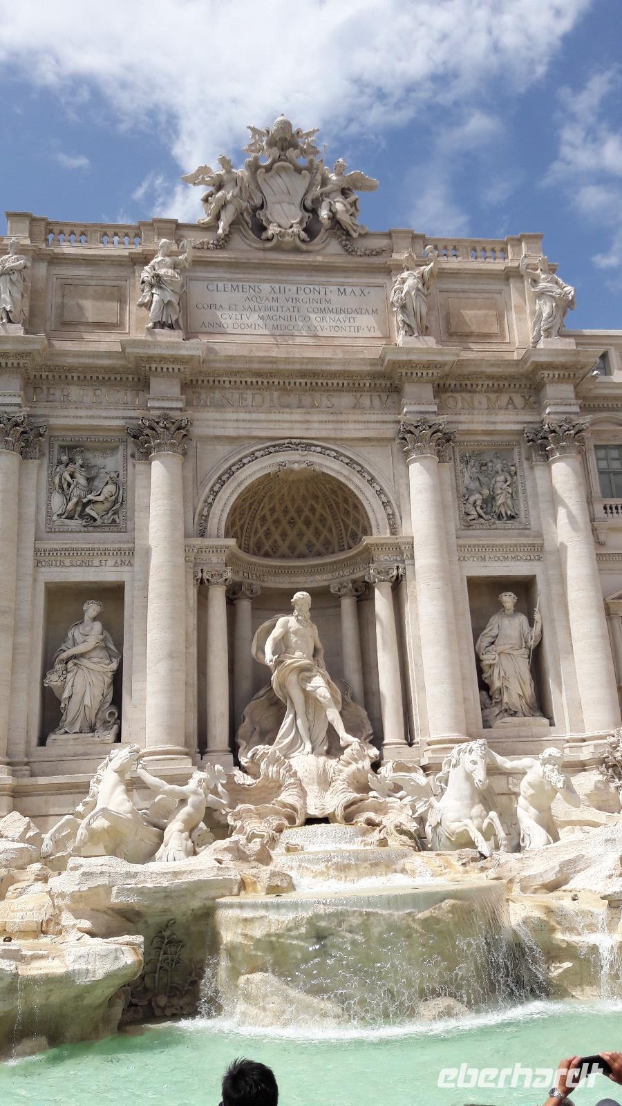 Die imposante Marktanlage (Einkaufcenter/Einkaufspassagen sind also keine Erfindung der Neuzeit) mit Ladenbauten wurde zu Beginn des 2. Jahrhunderts errichtet. Der mehrgeschossige Ziegelbau beherbergte viele kleine Läden und Werkstätten, Lager für die Waren und vermutlich auch Verwaltungsräume. In ca. 50 kleinen Läden wurden Nahrungsmittel preiswerter bzw. ganz billig verkauft und kaiserliche Spenden verteilt. Mit diesem „Billig-Einkaufszentrum" wollte Kaiser Trajan vor allem soziale Spannungen abbauen. Vor den Trajansmärkten entdecken wir noch die ca. 40 m hohe TRAJANSSÄULE, die 113, anlässlich des Sieges des Kaisers über die Draker, errichtet wurde. Die Säule zeigt ein Relief mit 23 Windungen, welches Szenen aus dem Drakerfeldzug mit über 2500 Figuren zeigt. Nach so viel Antike geht unser Blick jetzt in Richtung Moderne, auf und über die Piazza Venezia. Der Platz wird vom neoklassizistischen Nationaldenkmal „MONUMENTO NAZIONALE VITTORIO EMANUELE II. (heute im Volksmund nur „Schreibmaschine" oder „Hochzeitstorte" genannt) ebenso beherrscht wie von dem Verkehrschaos, das von allen Seiten auf ihn zuschießt. Wir schlängeln uns weiter durch die Gassen und Gässchen, dankbar für jede schattenspendende Gelegenheit. Unsere Aufmerksamkeit lässt so langsam nach, die Hitze und ein bestimmtes Gefühl in der Magengegend sind die Ursachen und so lassen wir uns gern von Sylvia in eine Trattoria entführen...und ganz langsam erwachen die Lebensgeister wieder. Wir fühlen uns nunmehr wieder gestärkt und topfit für den zweiten Teil unseres Rundganges durch die „Ewige Stadt". Wir schauen nochmals zurück, tauchen ein in die Antike und bestaunen sowohl von innen als auch von außen das PANTHEON, den einzigen, aus der Antike erhaltenen, Kuppelbau. Sein Leben begann es als heidnische Kultstätte. Marcus Agrippa, der Freund und Schwiegersohn von Kaiser Augustus ließ den Bau 27 v. Chr. zum Tempel weihen, zum „Pan-Theion" (griech.), zum Allgötterhaus. Leider fiel dieser Bau einem Brand zum Opfer. Kaiser Hadrian ließ den heutigen Bau zwischen 118 und 128 neu errichten. Nachdem Ende des 4. Jahrhunderts das Christentum zur Staatsreligion erklärt worden war, wurde das Pantheon 609 zum Gedenken an die christlichen Märtyrer zur Marienkirche geweiht. Der Wechsel von Tempel zur christlichen Kirche rettete das Pantheon vor der Zerstörung, nicht aber vor Plünderungen. Da machte selbst die Kirche keine Ausnahme, denn in ihrem Auftrag entwendete man sowohl vom Kuppeldach als auch vom Vorhallendach die Bronzeplatten, um sie später für den Baldachin im Petersdom zu verwenden. Die Kuppel des Pantheon, eine wahre Meisterleistung, inspirierte Michelangelo zum Entwurf der Petersdomkuppel. Inzwischen ist die Kirche auch die Ruhestätte großer Künstler (z.B. v. Raffael) und italienischer Könige und Königinnen geworden. Als nächstes besuchen wir den TREVI-BRUNNEN (Fontana di Trevi). Er ist der größte und sicher auch der berühmteste Brunnen von Rom. Hier wird - sofern man kann - rund um die Uhr flaniert - pausiert - fotografiert - und es werden am laufenden Band Münzen durch die Luft geworfen. Knausrig darf man allerdings nicht sein, d r e i sollten es schon sein, dann und nur dann hat man ein Wiedersehen mit der Stadt am Tiber und Glück in der Liebe! Auf keinen Fall sollten sich die Hände oder auch nur die Fingerspitzen Richtung Wasser bewegen - dann greift die Polizia municipale sofort zur Trillerpfeife und dies ist weiß Gott kein "Ohrenschmaus". Deshalb verlassen wir nach einem kurzen Innehalten dieses laute Getümmel und spazieren Richtung SPANISCHE TREPPE, wo es allerdings auch nicht viel anders zugeht.