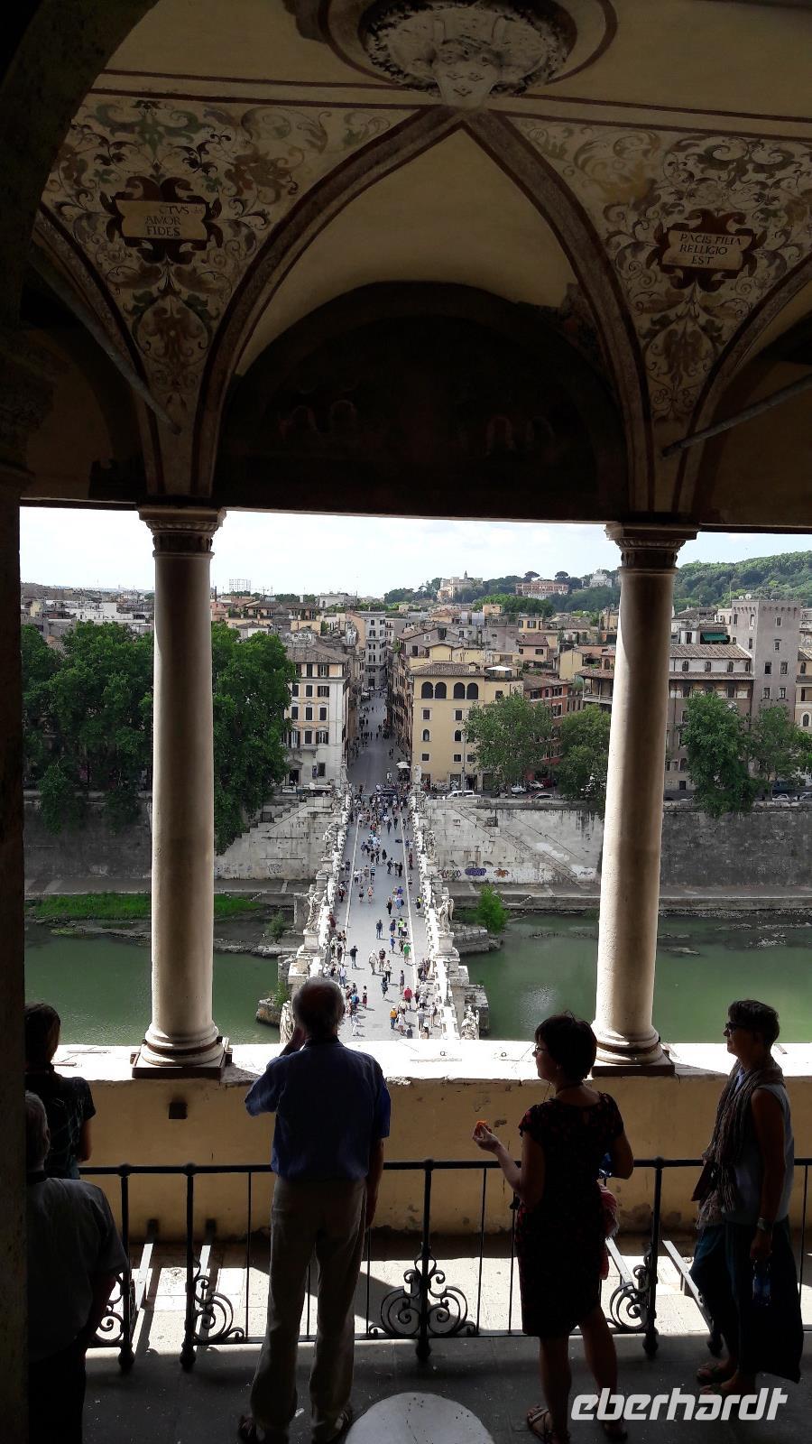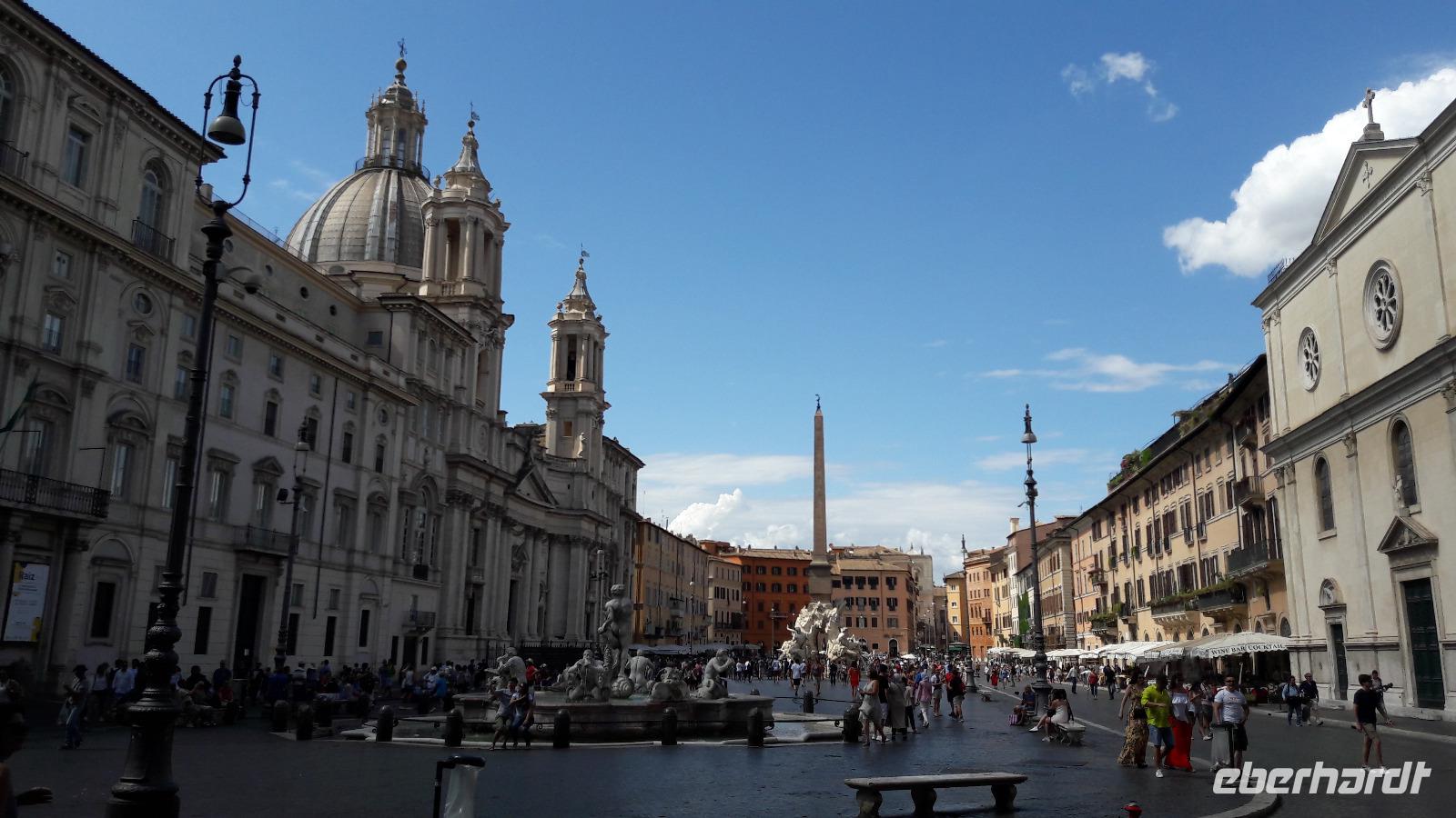 Nach dem Frühstück gut gestärkt, nehmen wir den Bus und fahren bis zur Piazza Cavour. Gemütlich spazieren wir in Richtung Engelsburg. Es ist Feiertag in Rom, die Straßen und Plätze sind noch leergefegt, es herrscht eine geradezu himmlische Ruhe. Vor dem CASTEL SANT 'ANGELO, dem ehemaligen Mausoleum des Kaisers Hadrian, treffen wir uns wieder mit Sylvia. Gemeinsam werden wir das Castel, das im Laufe der Zeit Grabmal der Kaiser, Festung, Fluchtburg (es ist durch den Passetto di Borgo mit dem Vatikan verbunden), Gefängnis, aber auch prachtvolle Papstresidenz war und heute ein interessantes Museum ist, besuchen. Das Hadrianeum erhielt den heutigen Namen nach dem Engel, der Papst Gregor 590 über dem Mausoleum erschien. Dieser Engel soll, indem er das Schwert in die Scheide steckte, das Ende der gerade wütenden Pest angekündigt haben. Die Bronzenachbildung des Engels ist auf der Spitze des Mausoleums weithin sichtbar. Von der Plattform wiederum hat man einen wunderschönen Blick auf Mamma Roma und den Petersdom. Wir nutzen ihn für die eine oder andere Fotoaufnahme, vor allem auch für ein Gruppenfoto. Inzwischen ist die Hitze schon wieder nahezu unerträglich geworden. Während die einen ihr Gemüt in der Cafeteria kühlen, genießen die anderen die rundum traumhaft schöne Aussicht. Kurze Zeit später verlassen wir das Castel und begeben uns über die schönste Tiberbrücke Roms, die ENGELSBRÜCKE (Ponte S.Angelo), in Richtung PIAZZA NAVONA. In der kleinen lebhaften Via dei Coronari werfen vor allem die Damen die Köpfe immer wieder von rechts nach links und umgekehrt. Hübsche kleine Geschäfte locken mit ihren Auslagen und laden geradezu zu einer Shoppingtour ein. Damit müssen wir uns noch ein wenig gedulden, denn zuerst lädt die elegante und sehr harmonisch wirkende Piazza Navona mit ihren Kirchen, Palästen und Brunnen zu einem Besuch ein. Es ist der Platz, wo „alle Brünnlein fließen...". Na ja, eigentlich sind es nur drei, aber was für welche! Im Stile des Barock erbaut, dominieren sie den Platz - in der Mitte der Vier-Ströme-Brunnen (Fontana dei Quattro Fiumi), ein Meisterwerk von Bernini, d e m Barockarchitekten seiner Zeit. Der Brunnen stellt die vier größten Flüsse - der damals bekannten Erdteile - dar (Nil für Afrika, Donau für Europa, Rion de la Plata für Amerika, Ganges für Asien). Ein wunderbares Ensemble bildet der Vier-Ströme-Brunnen mit der Kirche S. Agnese in Agone, erbaut vom Gegenspieler Berninis, dem Architekten Borromini. Für heute verabschieden wir uns von Sylvia und wir verabschieden uns auch von diesem prachtvollen „Salon im Freien", dem „Wohnzimmer der Römer", das sie so lieben. Wir machen uns auf die Suche nach einem schattigen Plätzchen in einer der umliegenden Trattorien. Nahezu die ganze Gruppe wird fündig und lässt sich neben den römischen Spezialitäten auch ein Bierchen oder ein Gläschen Vino munden. Danach schwirren wir aus, gehen erneut individuell auf Entdeckungsreise und tauschen am Abend während des Essens wieder unsere Erlebnisse aus. Ich denke, recht zufrieden, fallen wir dann alle in die Federn...