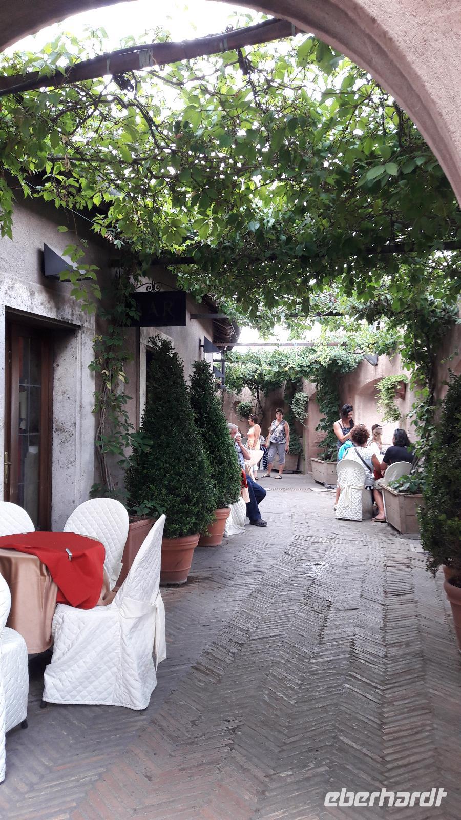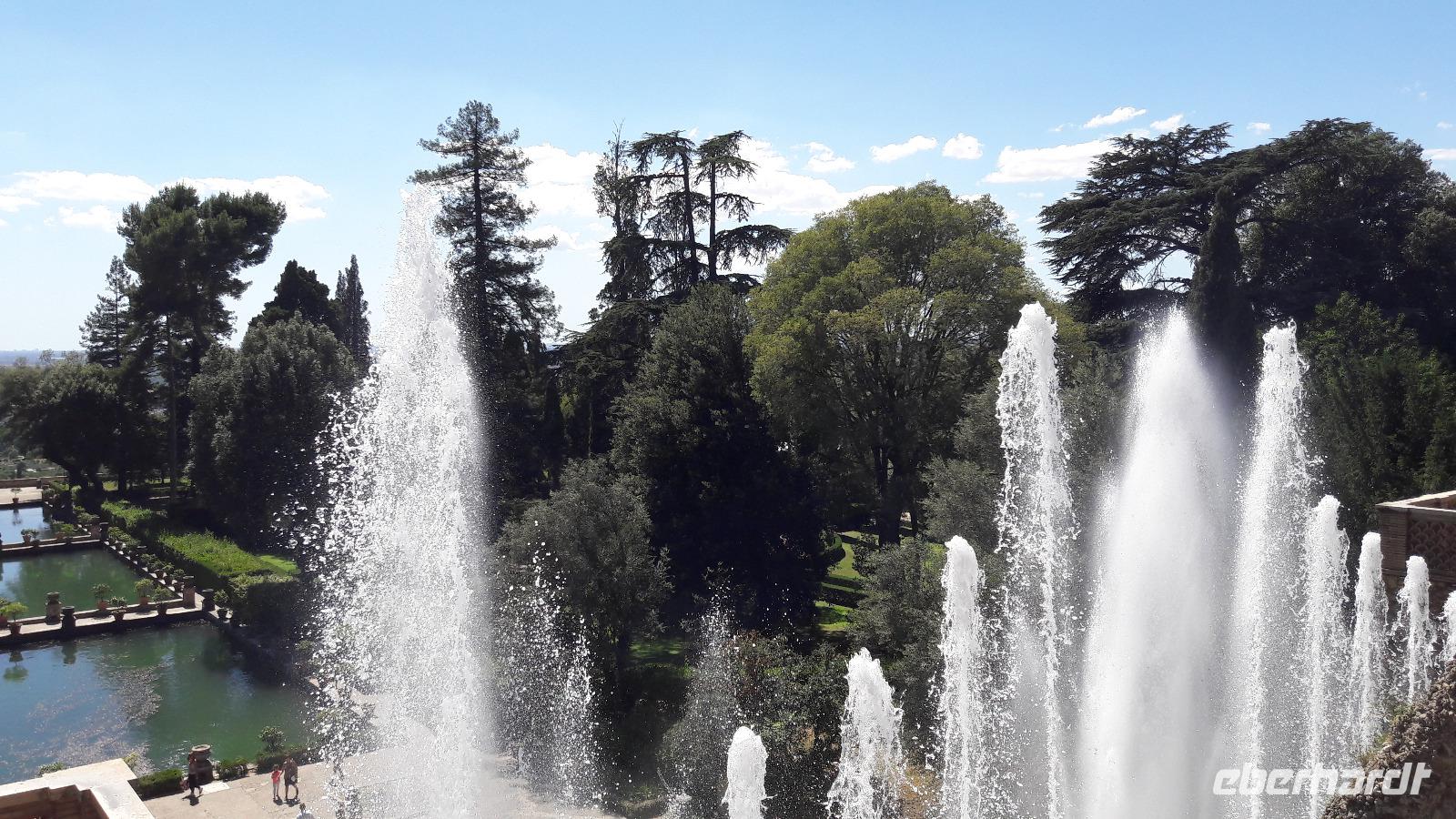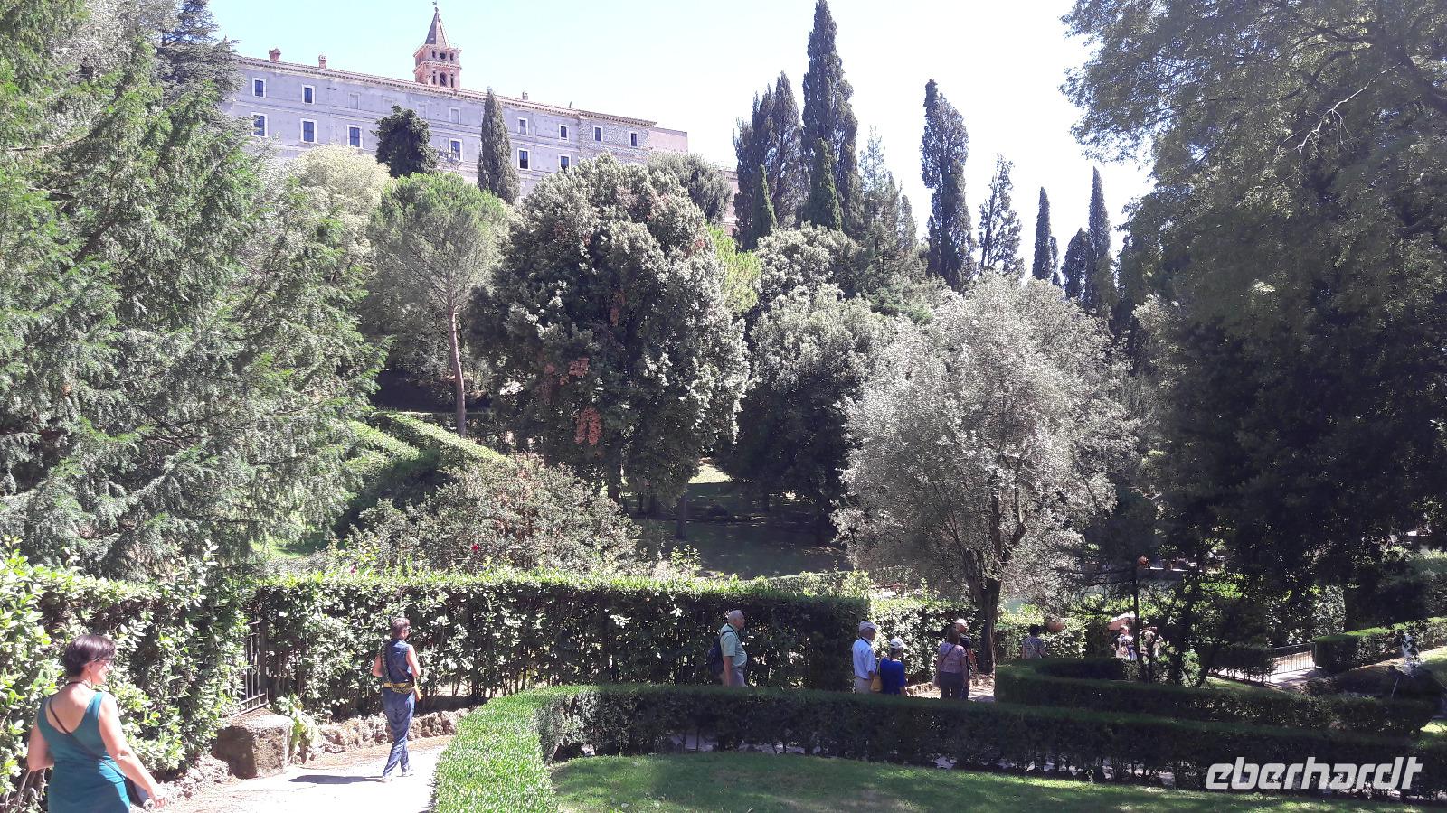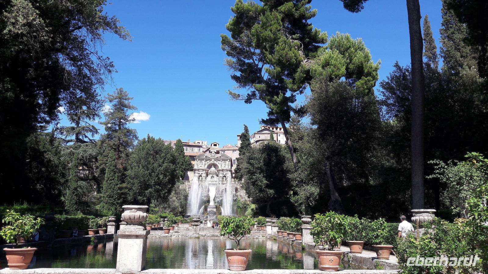 Wir freuen uns heute auf den Ausflug in die ALBANER BERGE und machen uns mit einem Kleinbus - und natürlich mit Sylvia - auf den Weg. Wir sind froh der sengenden Hitze, der Schwüle der Stadt entfliehen zu können und genießen die Fahrt am Samstagvormittag durch das noch scheinbar schlafende Rom. Unsere Fahrt führt uns auch ein Stück des Weges über die Via Appia. Zuerst steuern wir CASTEL GANDOLFO, die Sommerresidenz des Papstes, an. Die Geschichte der Päpste am Albaner See beginnt um 1600. Damals beschlagnahmte die päpstliche Finanzverwaltung das Schloss, denn der ehemalige Besitzer hatte seine Schulden nicht begleichen können. Auf Veranlassung von Papst Urban VIII. wird es zur Sommerresidenz umgebaut und bis heute kommen seine Nachfolger in den Sommermonaten hierher, um sich von der Hitze Roms zu erholen. Nur Franziskus kommt selten, sehr zum Leidwesen der Einheimischen. Da auch wir den Papst nicht antreffen, nutzen wir die Zeit für die Einnahme einer kleinen Erfrischung und für einen Bummel durch den Ort. Dabei genießen wir auch den traumhaft schönen Blick auf den Albaner See. Anschließend fahren wir zum KLOSTER GROTTAFERRATA und werden dort Zeuge einer Taufzeremonie. Nach diesem kleinen Abstecher entführt uns Sylvia nach FRASCATI. Dort wollen wir in der cantina "Il Pergolato" nicht nur den bekannten süffigen Frascati probieren, sondern auch die anderen Gaumenfreuden. Wir genießen die angebotenen Leckereien und machen uns anschließend auf den Weg nach TIVOLI. Der Ort - auf einem Hügel gelegen - war einst auf Grund seines Wassers und der Schwefelquellen ein beliebter Erholungsort der Römer. Mit gleich 2 Sehenswürdigkeiten kann Tivoli aufwarten. Zum einen mit der Villa Adriana (einst von Kaiser Hadrian angelegt) und zum anderen mit der VILLA D'ESTE, einem Park mit herrlichen Ausblicken, der an jeder Ecke eine Überraschung bereithält.
