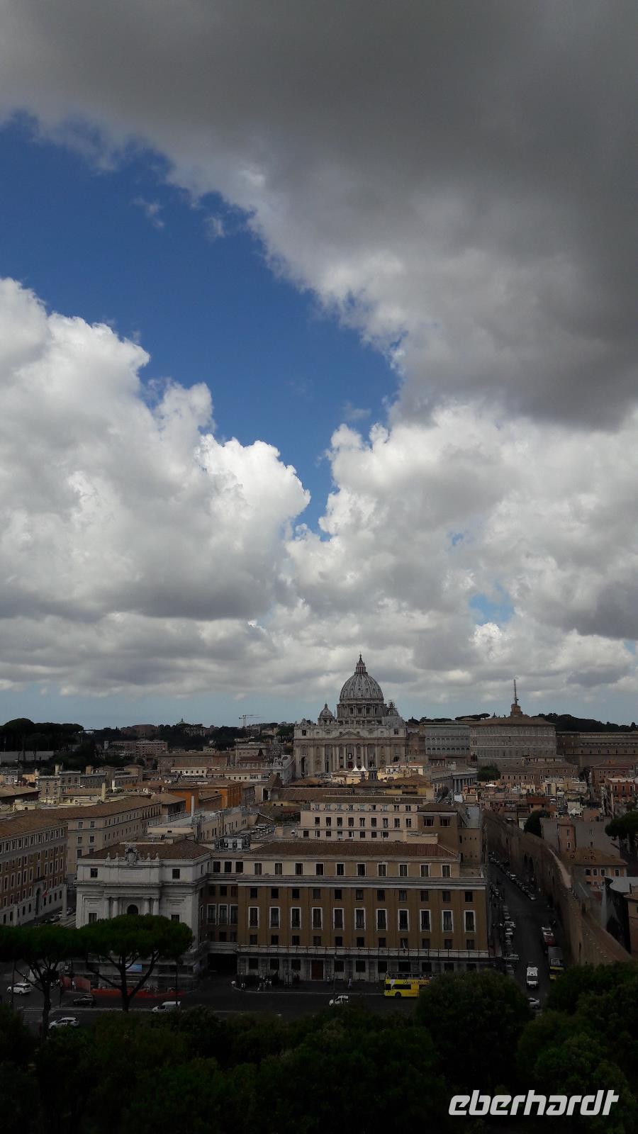 Beim Verlassen der Kirche geht unser Blick noch einmal zurück. Wir sind stark beeindruckt vom Anblick des Petersdoms, vor allem aber von der mächtigen - von Michelangelo entworfenen - Kuppel, die sich genau über dem Grab des Apostels Petrus erhebt. Danach verlassen wir den Platz aller Plätze und ohne es groß zu bemerken, verlassen wir beim Überschreiten einer weißen Linie auch den mit 0,44qkm kleinsten Staat der Welt, den Vatikanstaat. Wir verabschieden uns von Sylvia und völlig geschafft lassen wir uns in der Nähe „des Himmelreiches auf Erden" auf die Stühle fallen. Die „kleinen grauen Gehirnzellen" und die Füße haben eine Verschnaufpause verdient!
