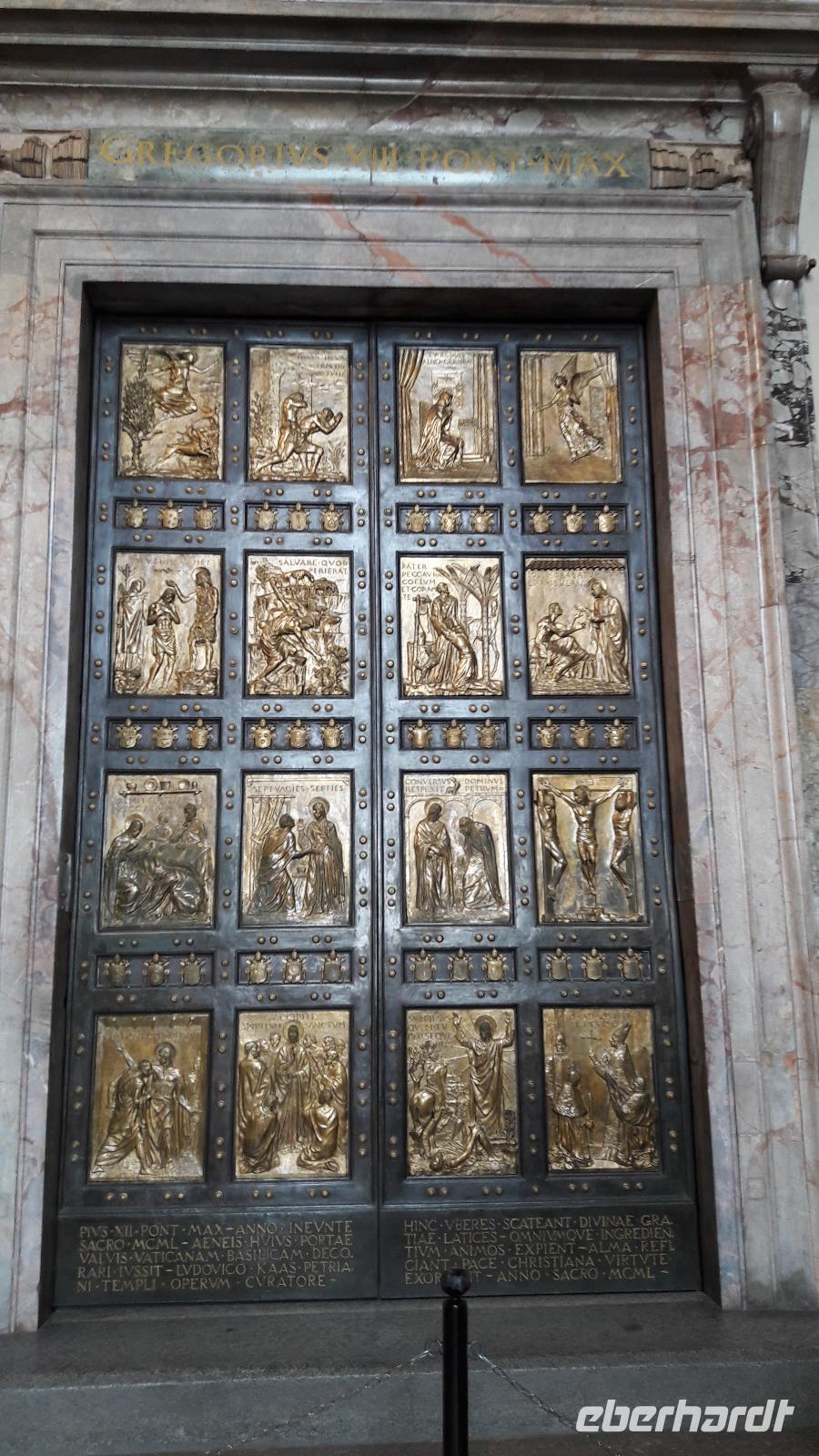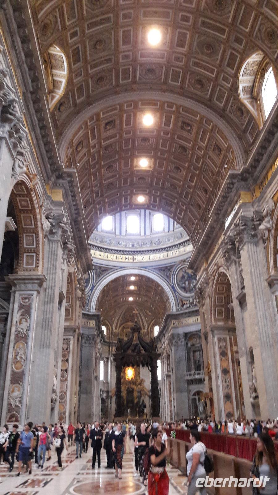 Nach diesem krönenden Abschluss der Vatikanischen Museen gehen wir noch mit Sylvia - vorbei an der „Porta Santa" (sie ist nur zu Beginn eines Heiligen Jahres geöffnet), in den PETERSDOM. Der Innenraum, nahezu 190m lang, ist reich an unzähligen Meisterwerken - er hat 45 Altäre und 11 Kapellen und besteht aus drei Schiffen, einem Querschiff von 137,5m Breite und einer 136,5m hohen Kuppel. Überall findet man Papststatuen und Grabmäler. Am meisten fasziniert mich immer wieder, die „Pieta" von Michelangelo, sie ist so schön, so ergreifend!