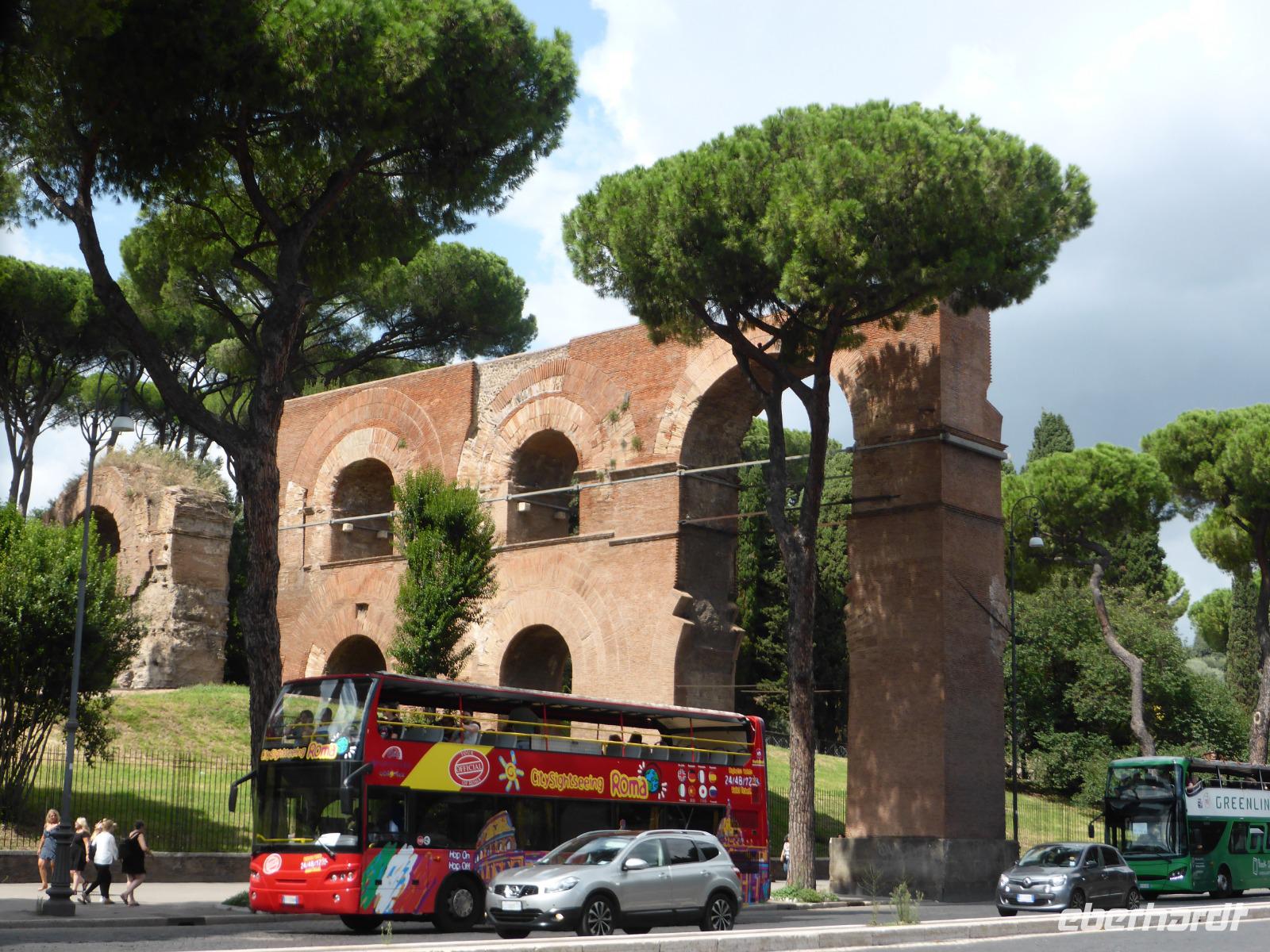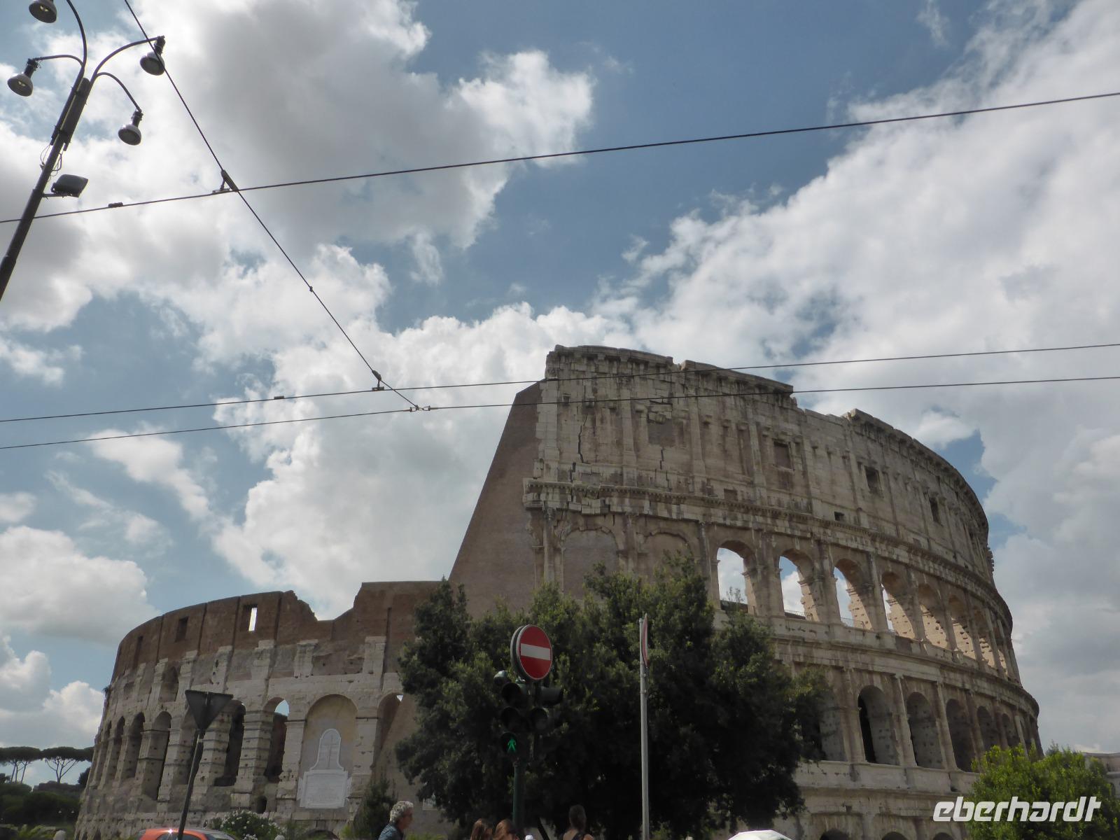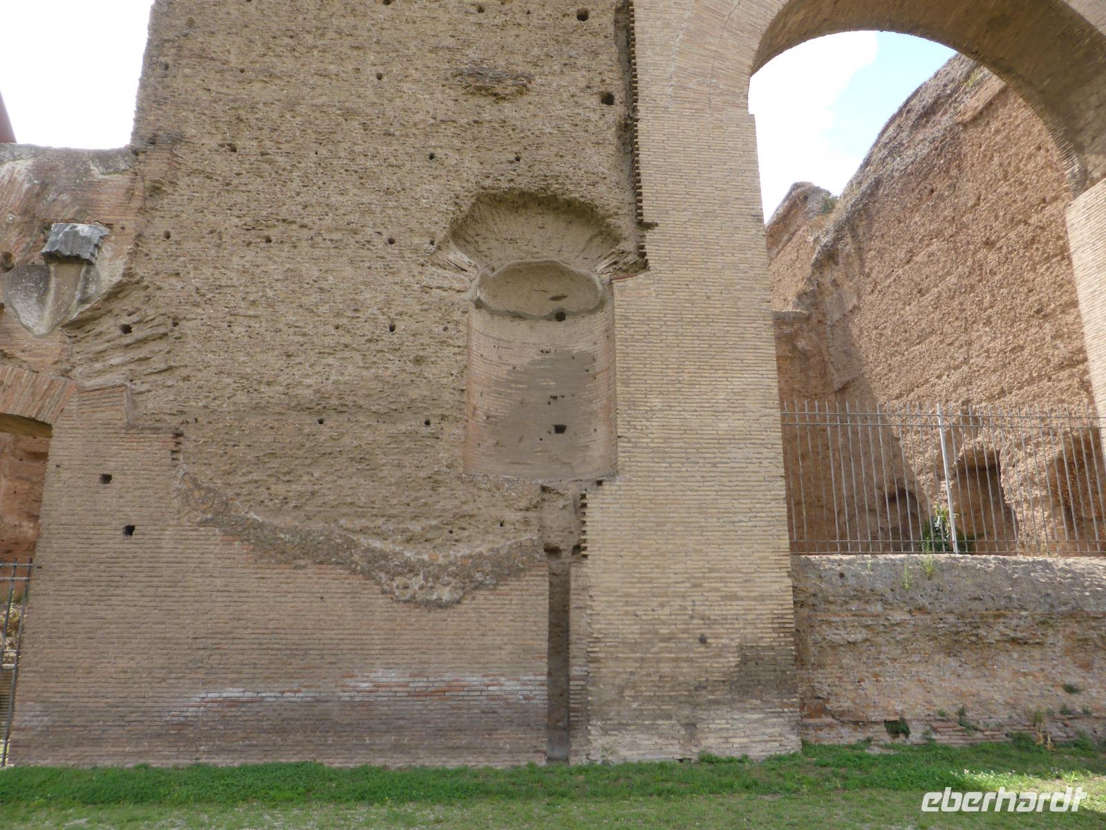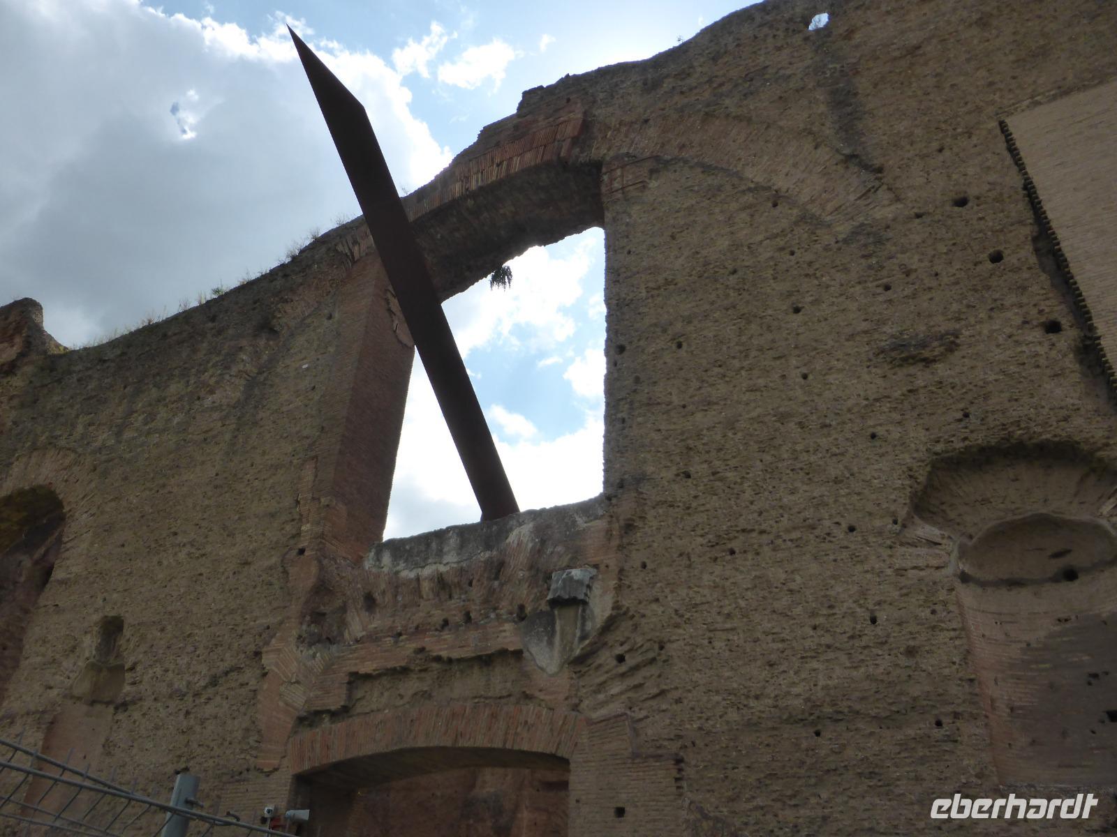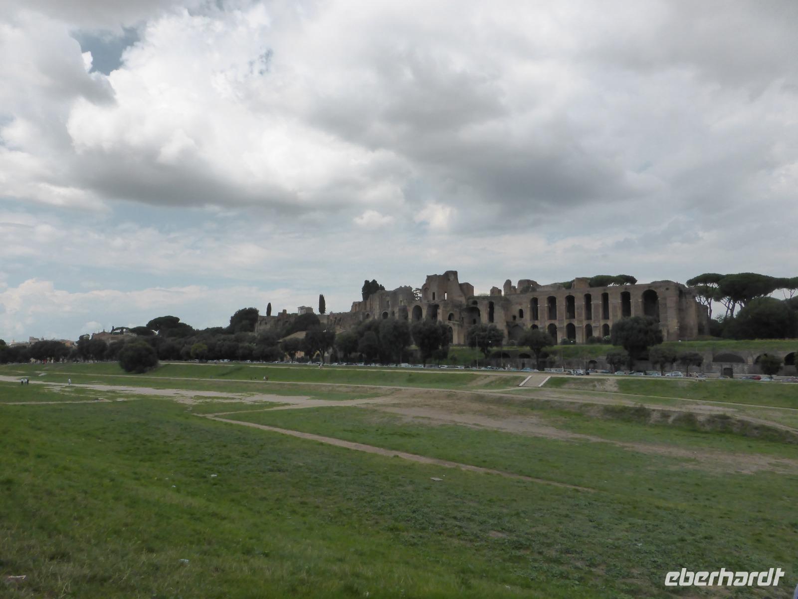 Gestärkt und etwas erholt geht es anschließend noch einmal außen herum um das Kolloseum. Aus jeder Perspektive sieht es anders aus. Bei genaueren Hinsehen bleiben uns die vielen bereits erfolgten Erhaltungsmaßnahmen nicht verborgen. Wir sind auf dem Weg zu den Caracalla-Termen. Unter Pinien und Zypressen geht es entlang, erste Kastanien sind von den Kastanienbäumen heruntergefallen. Von Cararacalla erbaut, war die Therme ehemals sehr modern und reichhaltig ausgestattet, der Fußboden war beheizt. Nur noch die Mauern stehen heute, die Reichtümer wie Mosaikfußböden und anderes sind längst in anderen Museen zu bewundern. Außen gehen wir entlang und bekommen einen Einblick in die Dimensionen. Anlässlich der Eröffnung der Fußball-WM in Rom 1990 haben hier die Vier Tenöre ihr erstes Konzert gegeben. Der Circus Maximus war der größte Circus in Rom. Heute sieht man noch Reste der Sitztribünen. Die Obelisken sind schon lange verschwunden. In den Siebzigern wurde hier „Ben Hus" gedreht.