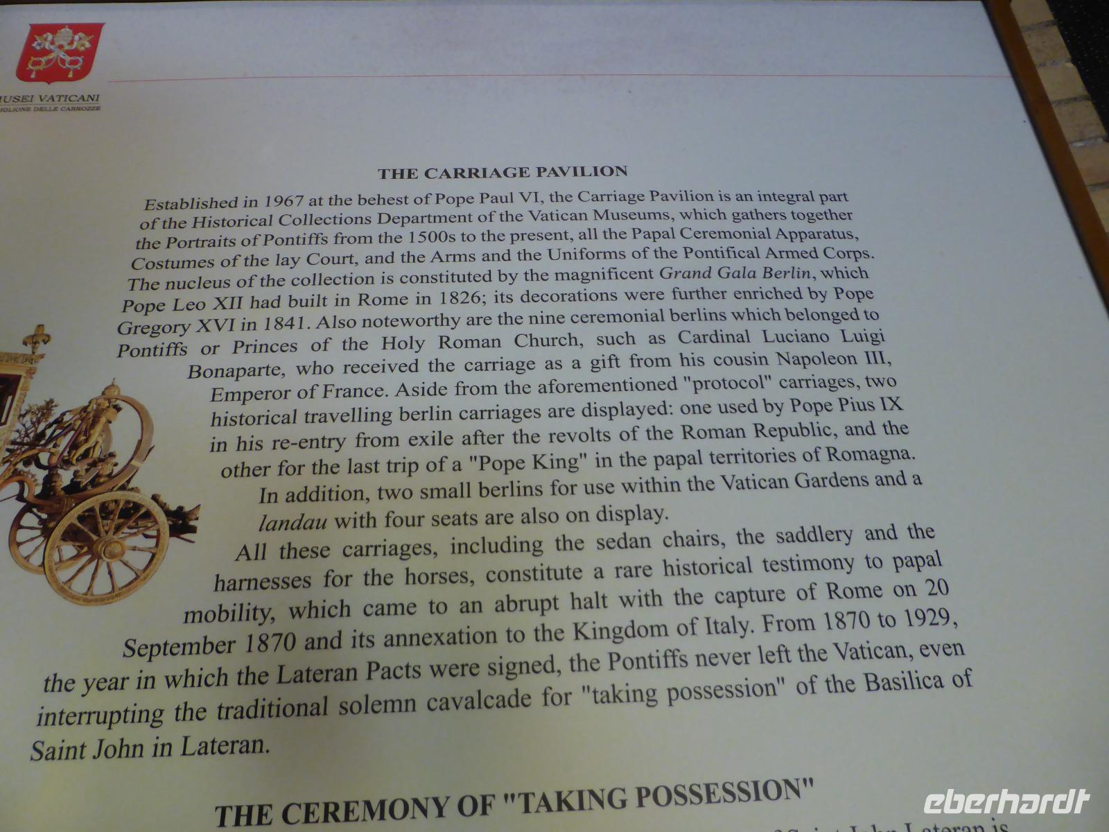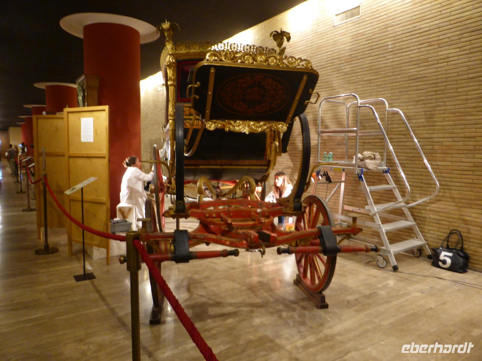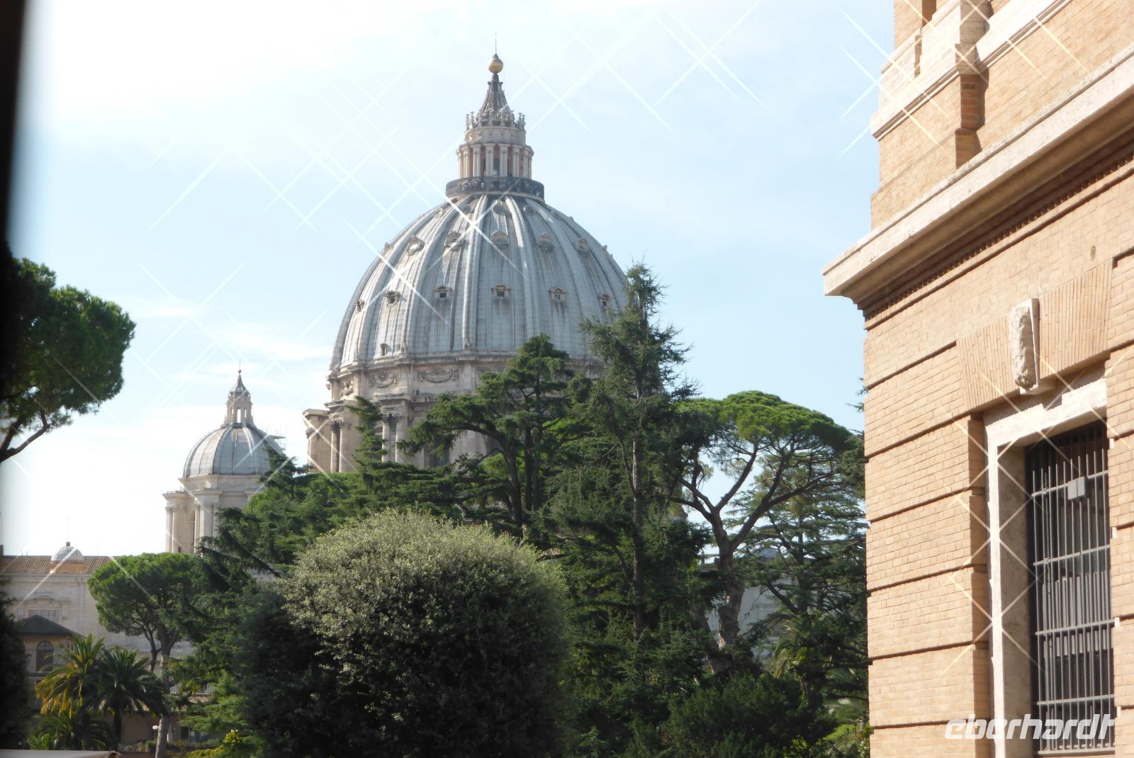 Vatikan und Petersdom sind nicht weit entfernt von unserem Hotel. Leicht zu erreichen mit dem Hotel-Shuttle oder per Pedes.Zu Beginn die doppelläufige Spiraltreppe bewundernd gehen wir durch den Garten, die Kuppel des Petersdomes zum Greifen nah, in die Ausstellungshalle mit den Fahrzeugen der Päpste aller Jahrhunderte. Sänften, Kutschen und Auto- bzw. Papamobile allesamt prächtig geputzt und aufbereitet für die Besucher.In die Pinakothek des Vatikans schreiten wir auf knarrenden Fußbodendielen durch alte Holztüren . Altehrwürdig und original. Eine besondere Ausstrahlung hat das hier.