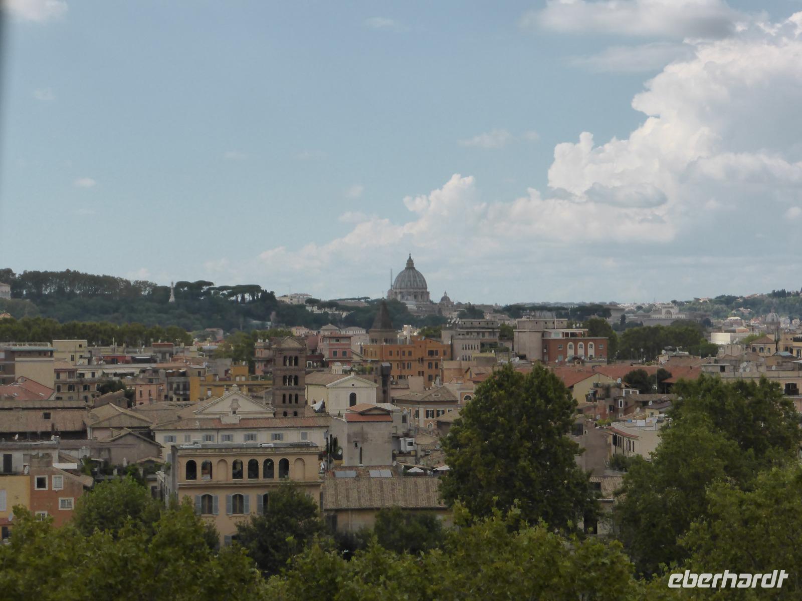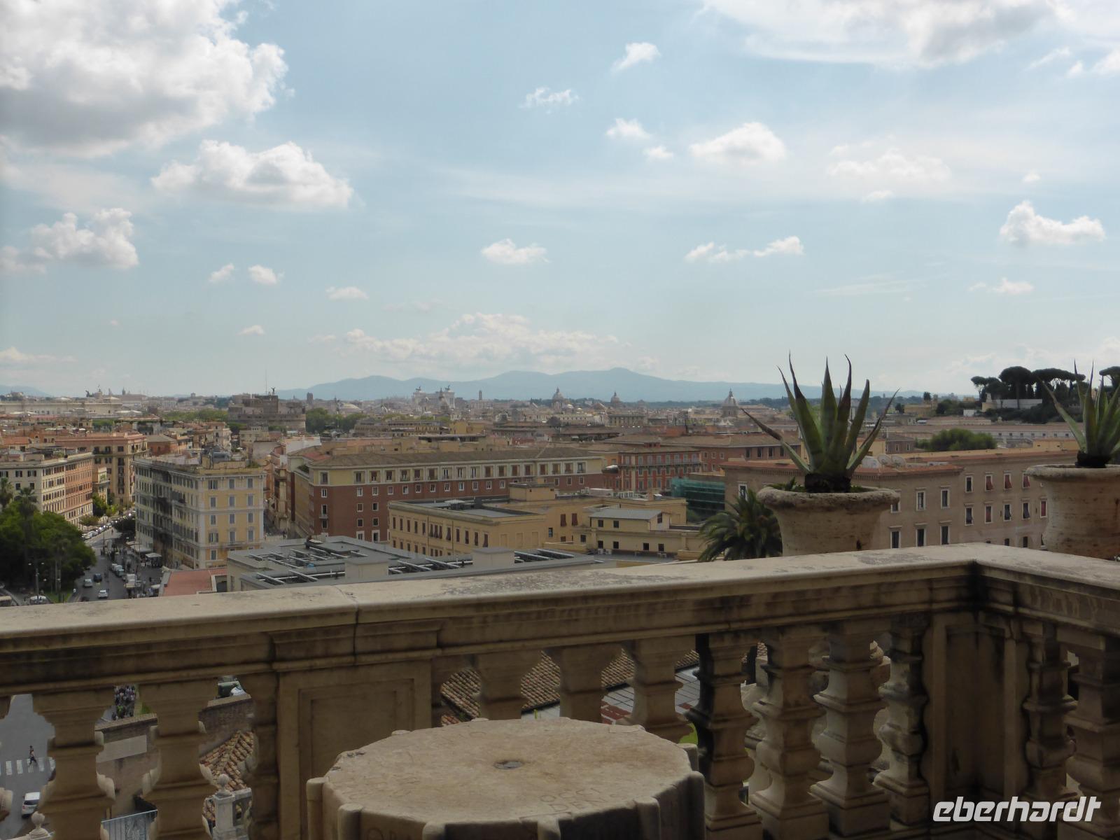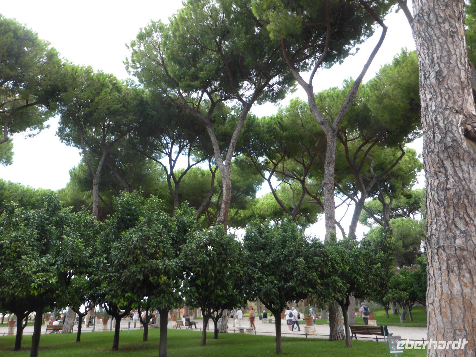 Kolosseum, Forum Romanum, Caracalla-Therme, Circus Maximus - meine Güte. Die Kraft lässt nach. Sylvia hat noch zweidrei Leckerbissen der ruhigeren, der romantischen Art auf Lager. Bergan auf den Aventinhügel und vorbei am Rosengarten gelangen wir zur Kirche Santa Sabina, einer Kirche mit schönem Marmorfußboden und einer großen Zedernholztür mit biblischen Motiven; entledigt sonst aber aller weiteren Schmuckelemente, sieht sie aus wie nach ihrer Erbauung. Wie eine Belohnung kommt er uns vor: der romatische Orangengarten. Eine Oase der Ruhe. Die Mühen des Tages werden beloht mit einem fantastischen Blick auf die Silhouette Roms. Die Steinbänke sind warm von der Sonne.