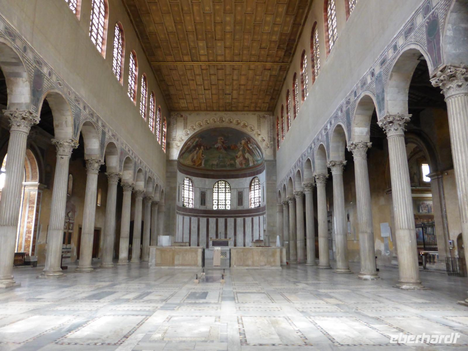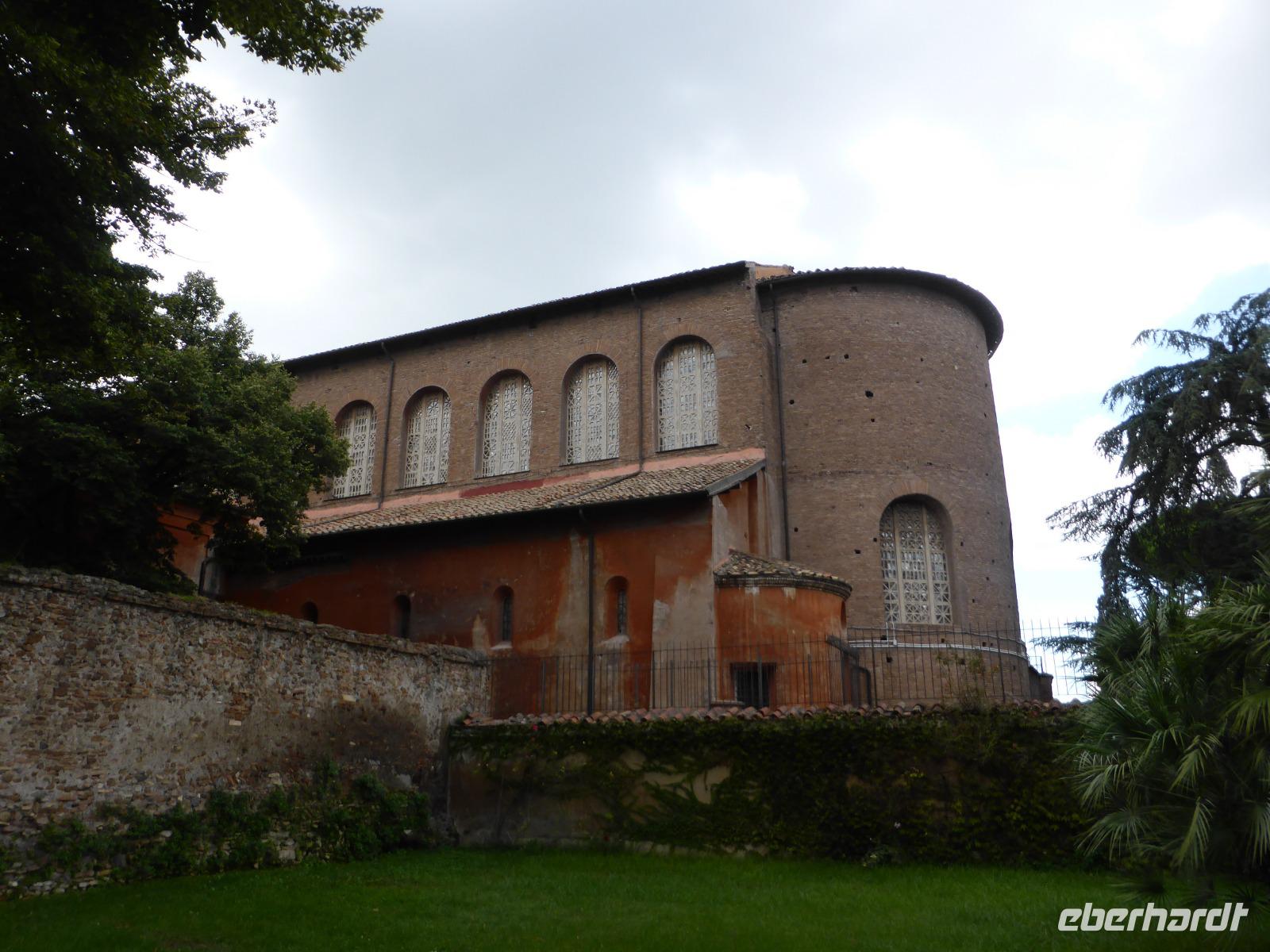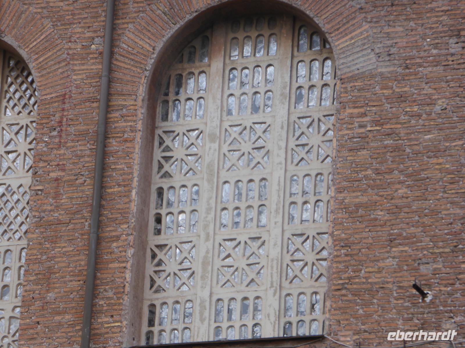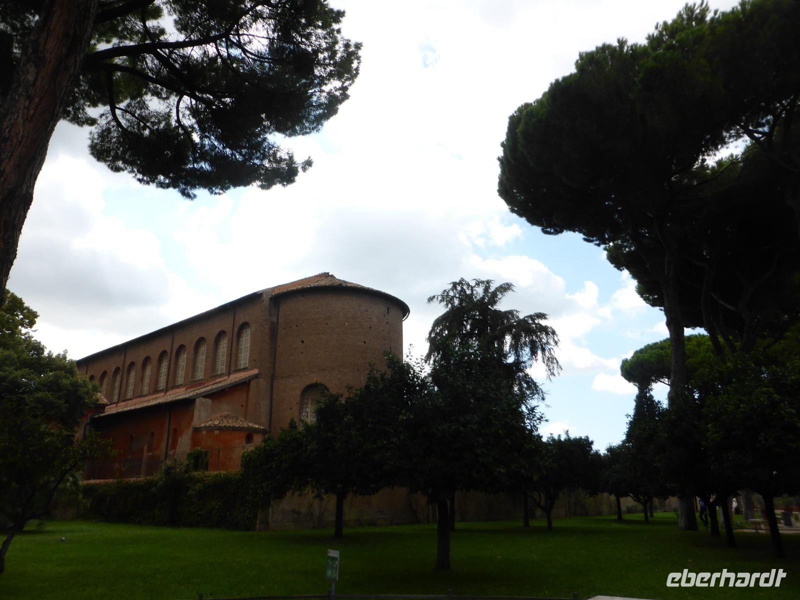 Kolosseum, Forum Romanum, Caracalla-Therme, Circus Maximus - meine Güte. Die Kraft lässt nach. Sylvia hat noch zweidrei Leckerbissen der ruhigeren, der romantischen Art auf Lager. Bergan auf den Aventinhügel und vorbei am Rosengarten gelangen wir zur Kirche Santa Sabina, einer Kirche mit schönem Marmorfußboden und einer großen Zedernholztür mit biblischen Motiven; entledigt sonst aber aller weiteren Schmuckelemente, sieht sie aus wie nach ihrer Erbauung. Wie eine Belohnung kommt er uns vor: der romatische Orangengarten. Eine Oase der Ruhe. Die Mühen des Tages werden beloht mit einem fantastischen Blick auf die Silhouette Roms. Die Steinbänke sind warm von der Sonne.