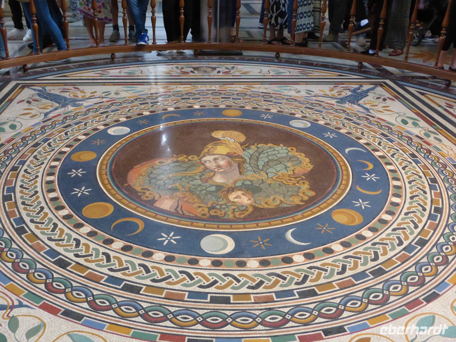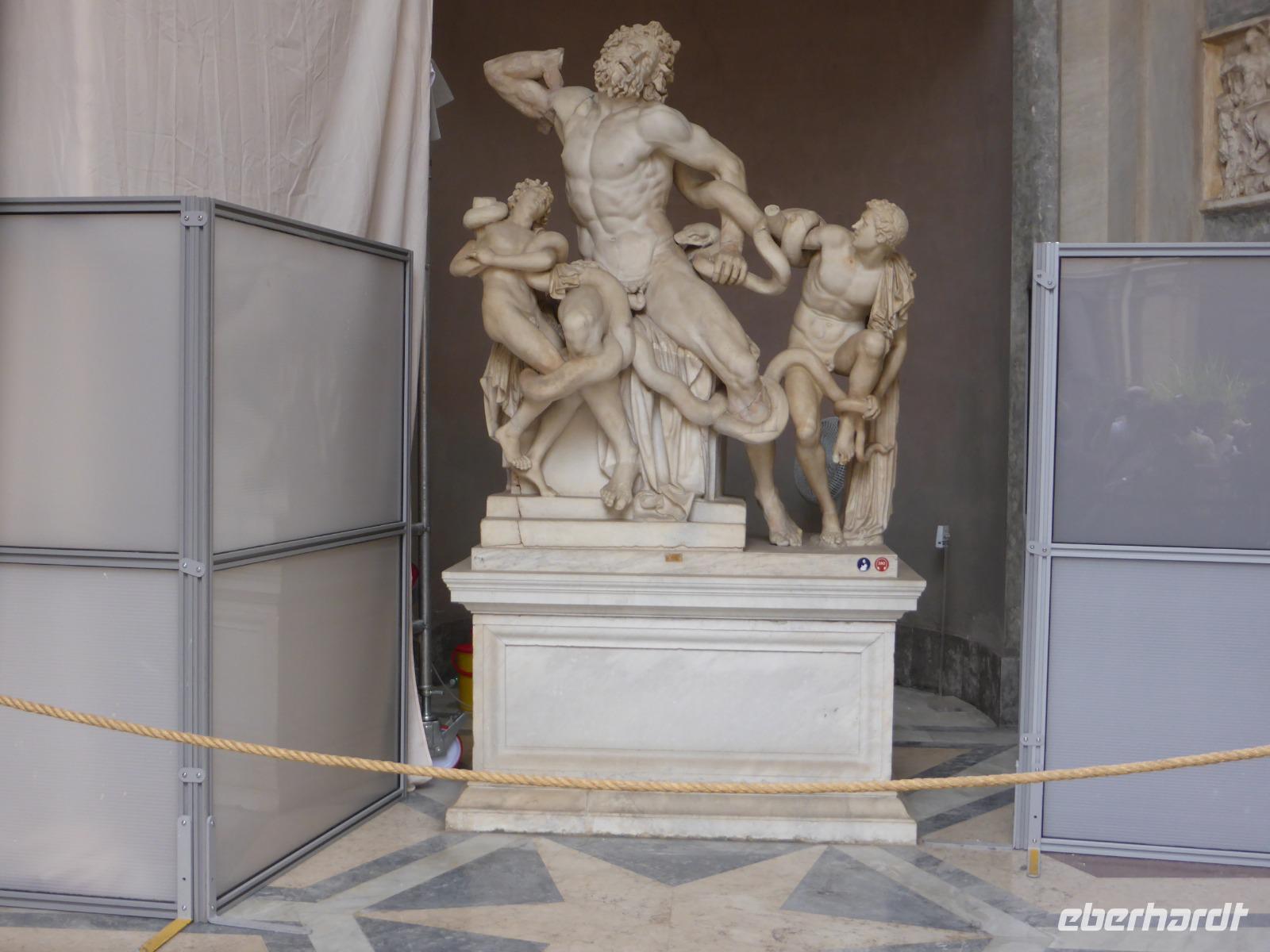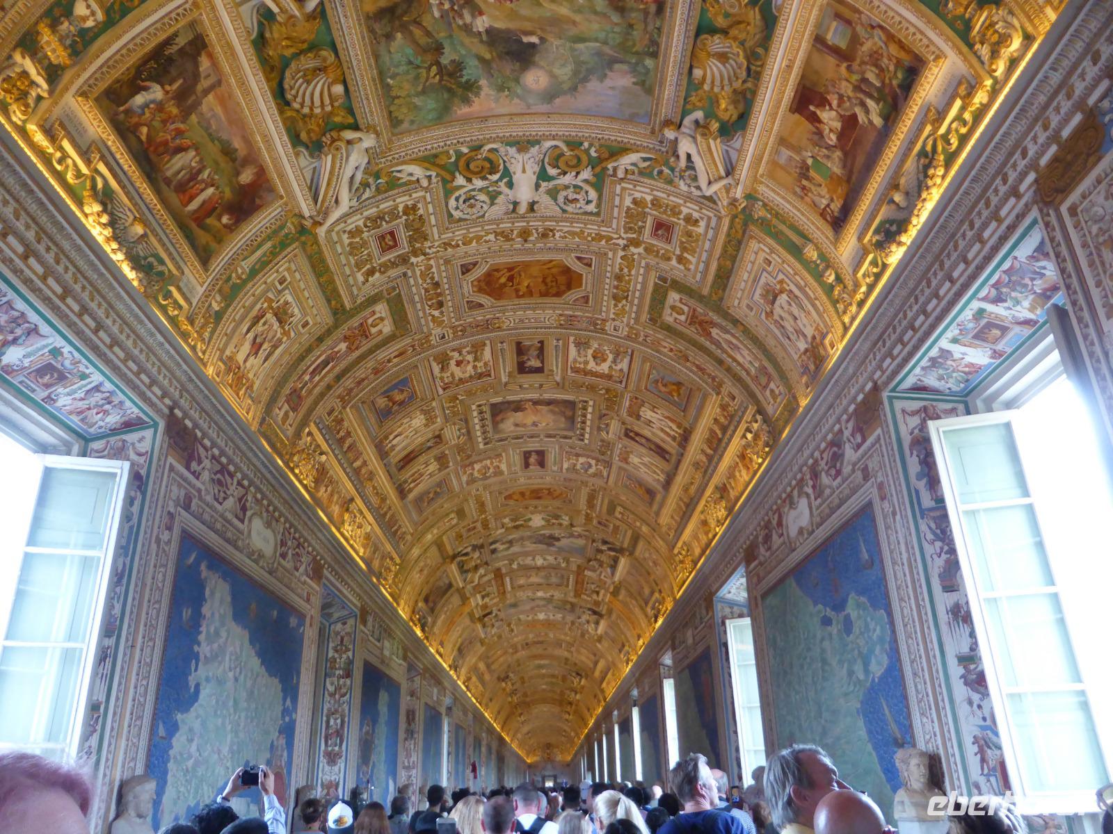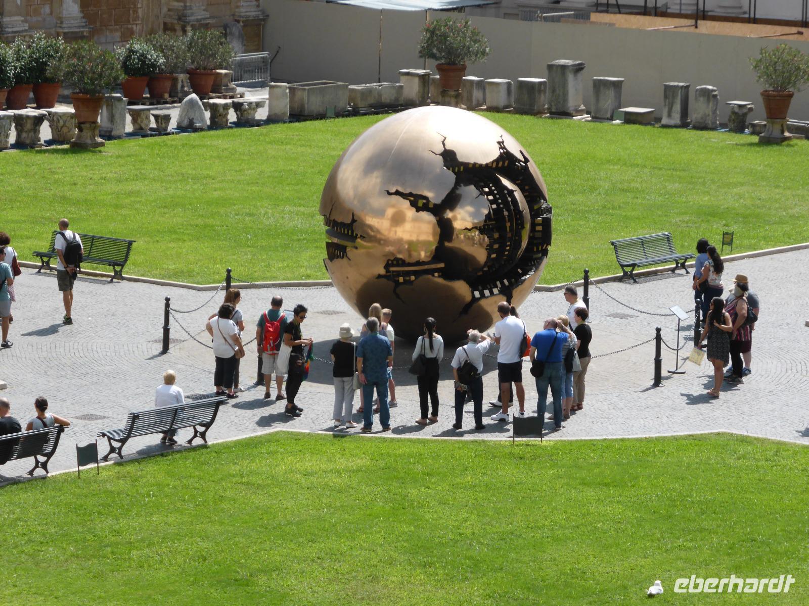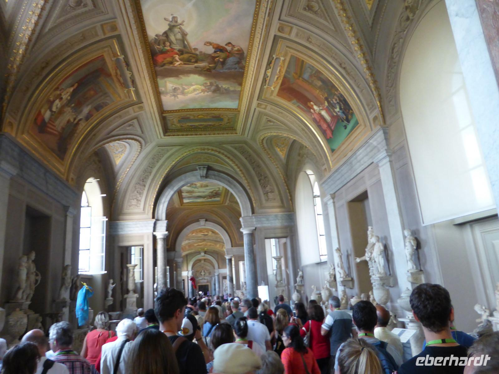 Im wichtigsten Saal der Pinakothek, dem Raffael-Saal stehen wir vor dem letzte Bild Rafaels, dem Meister des Lichts.Draußen gehen wir in Richtung Vatikanische Museen. Vorbei am großen Pinienzapfen als Smbol für die Fruchtbarkeit und den Pfauen als Smbol für die Unsterblichkeit. Unter uns befindet sich das das Geheimarchiv des Vatikans. Das gibt es wirklich, Sylvia war schon da.Um in die Sixtinische Kapelle zu gelangen, müssen wir erst den langen Gang mit den giechischen und römische Antiquitäten entlang. Wir schauen in den Saal der Tiere. Sind im Raum der Statuen der Musen. Im Sala Rotonda mit dem großen Brunnen auf einem wunderschönen Mosaik. Die Decke erinnert an das Pantheon. Dann der Raum mit den Sarkophagen und einem Mosaik mit dem Haupt der Medusa. Gehen durch die Galerie der Kandelaber. Entlang von Wandteppichen aus Brüssel, für die die Schüler Raffaels die Entwürfe gemacht haben. Zwischendurch aus dem Fenster schauend, sehen wir den Turm von Radio Vatikan und die Fenster des Gästehauses, in welchem der jetzige Pabst wohnt.Endlich nähern wir uns dem Höhepunkt: der Sixtinischen Kapelle.