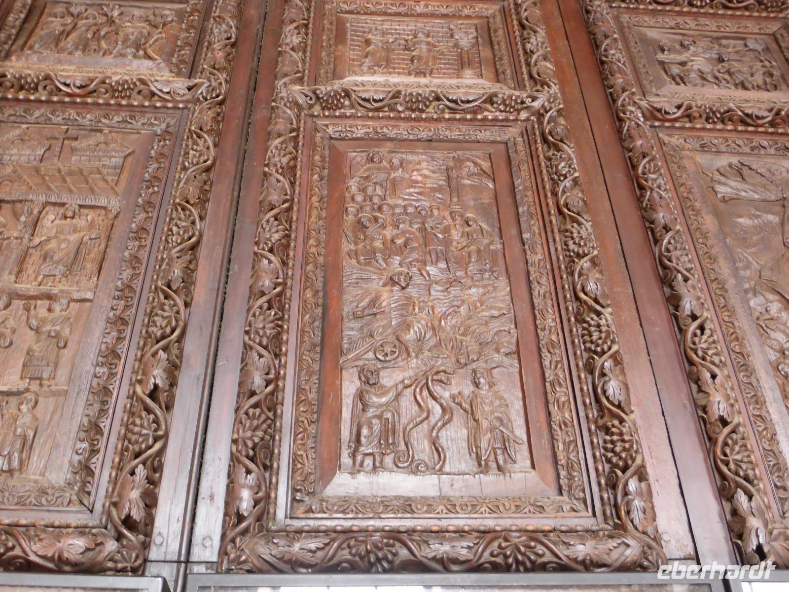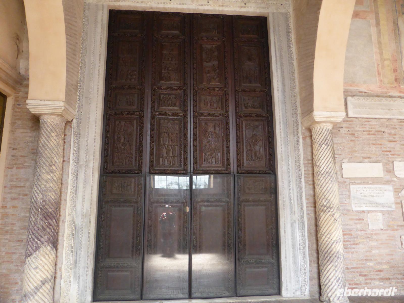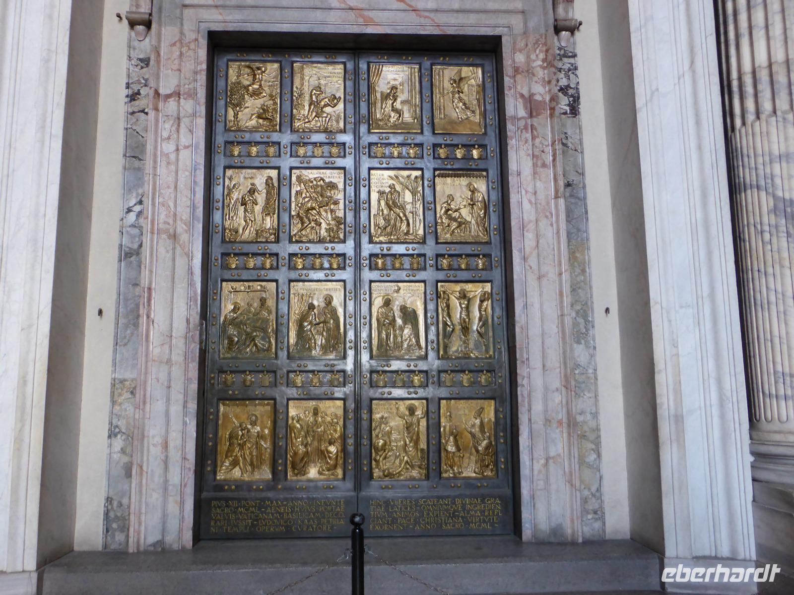 Schon vorher hat Sylvia die Malereien Michelangelos in vielen Details erklärt, denn in er Kapelle darf sie nicht sprechen. Wir möglichst auch nicht. Die Malereien sind gereinigt worden in den achtiger Jahren und erstrahlen wieder in ihren ursprünglichen Farben. Ganze zehn bis fünfzehn Minuten bleiben uns zu verweilen und die Größe der Kunstwerke zu erfassen.Der Tag Christliches Rom ist noch nicht beendet: die Besichtigung des Petersdomes, der größte Kirche der Welt, steht noch an. Vorbei an der Heiligen Tür treten wir ein.