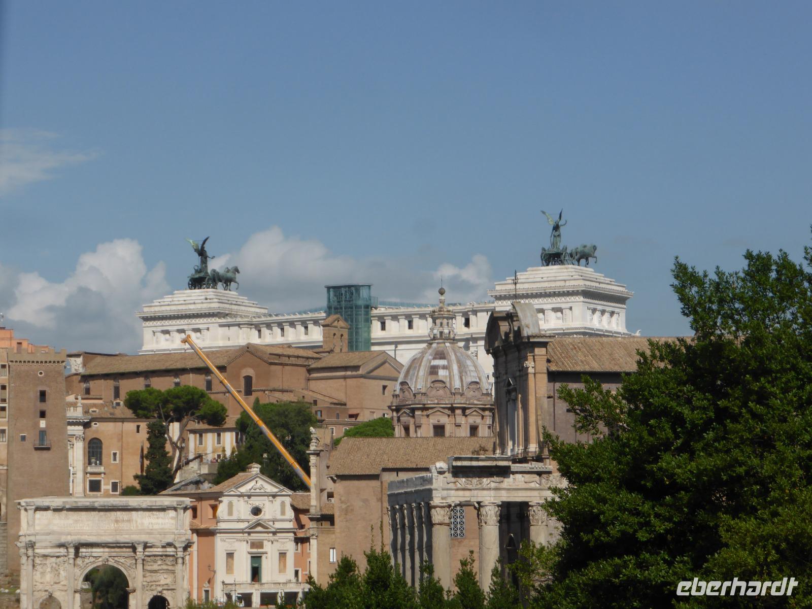 Eine fast dreitausendjährige ununterbrochene Stadtgeschichte kann Rom vorweisen, die wir in Teilen entdecken wollen. Schönes Wetter ist vorausgesagt. Anfangs, in den ersten Tagen noch etwas gewittrig, dann Steigerung bis 30 Grad. Supersommer eben. Und so kommt es: die Lufthansa-Maschine landet bei leichtem Gewitterregen. Macht aber nichts. Das Gepäckholen vom Gepäckband dauert eh ewig (apropos „ewig") an Roms und Italiens größtem Flughafen und dann ist es alles auch schon wieder gut. Eine halbe Stunde mit dem Bus und wir checken ein im 4*-Hotel „Tiberio". Ein Ruhepäuschen ist jetzt willkommen. Es ging früh ging los heute mit den Flügen aus Dresden, Leipzig und Berlin nach Frankfurt zum gemeinsamen Flug nach Rom. Alle Wege führ'n nach Rom, heißt es.