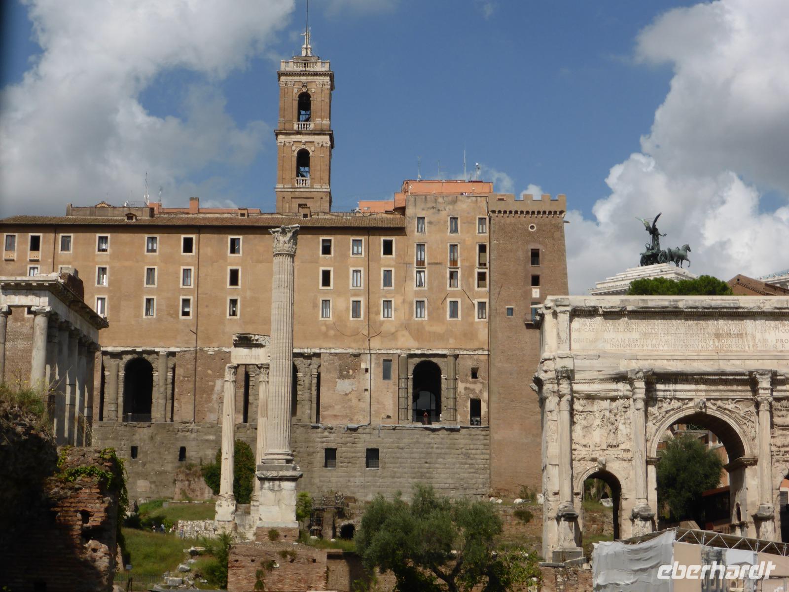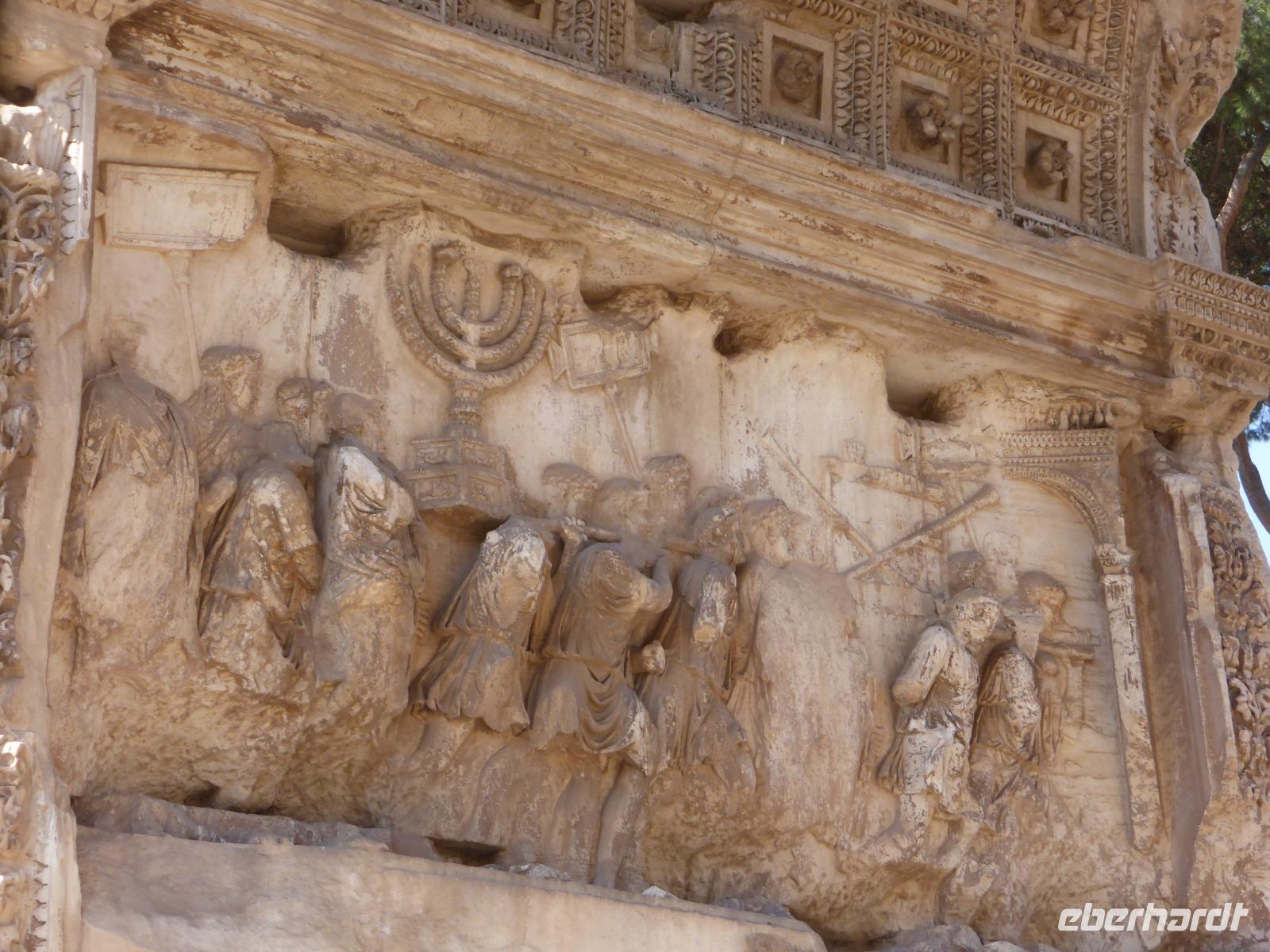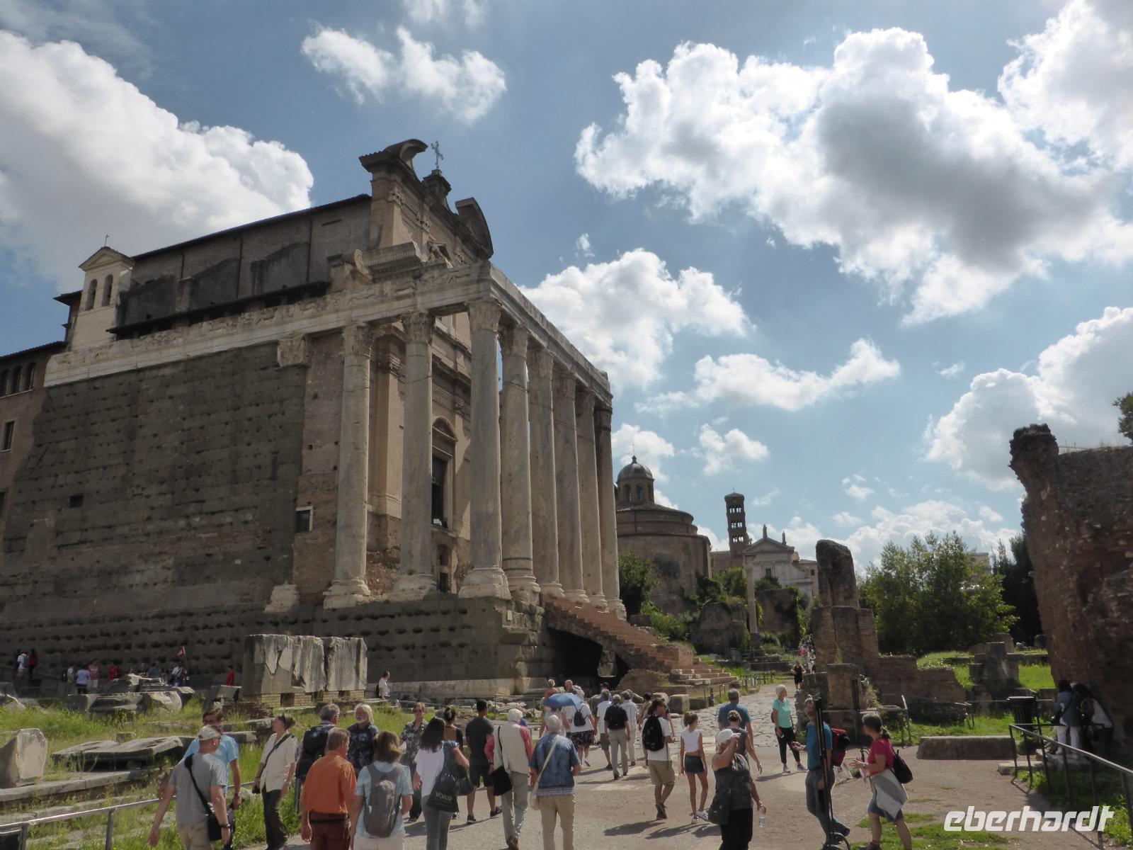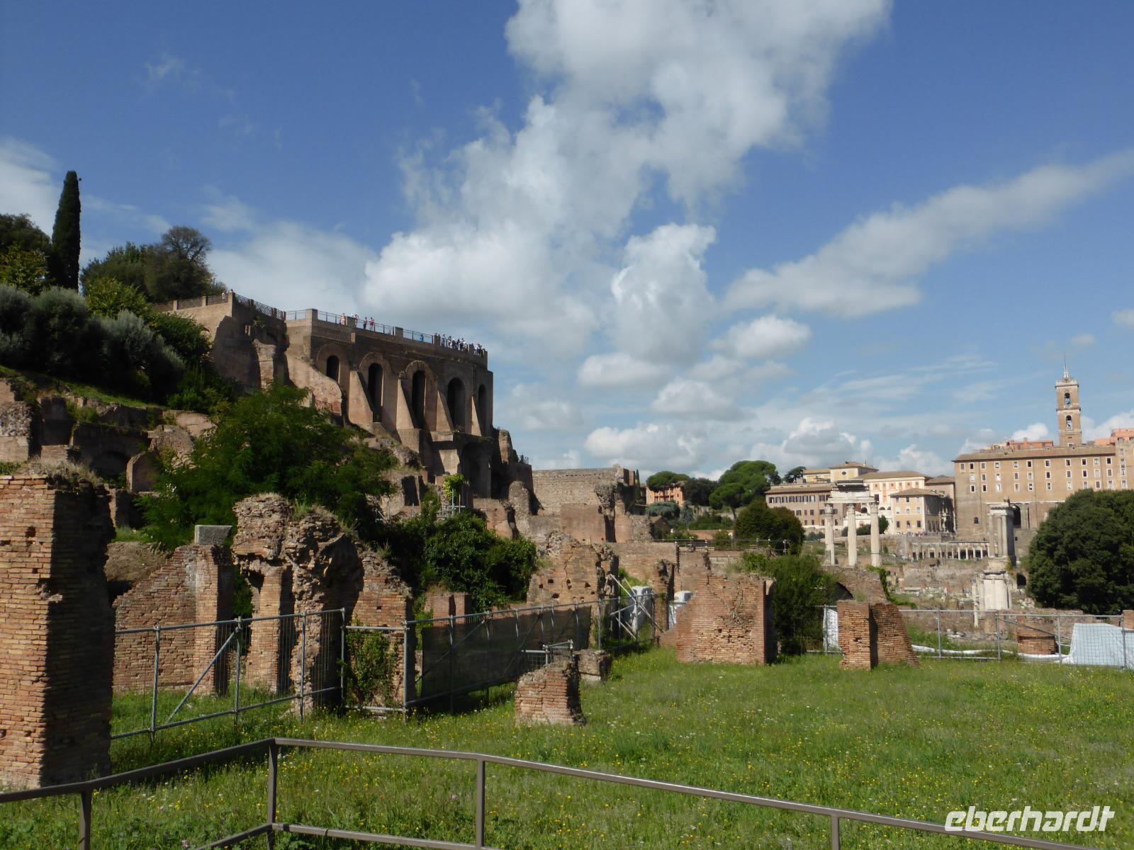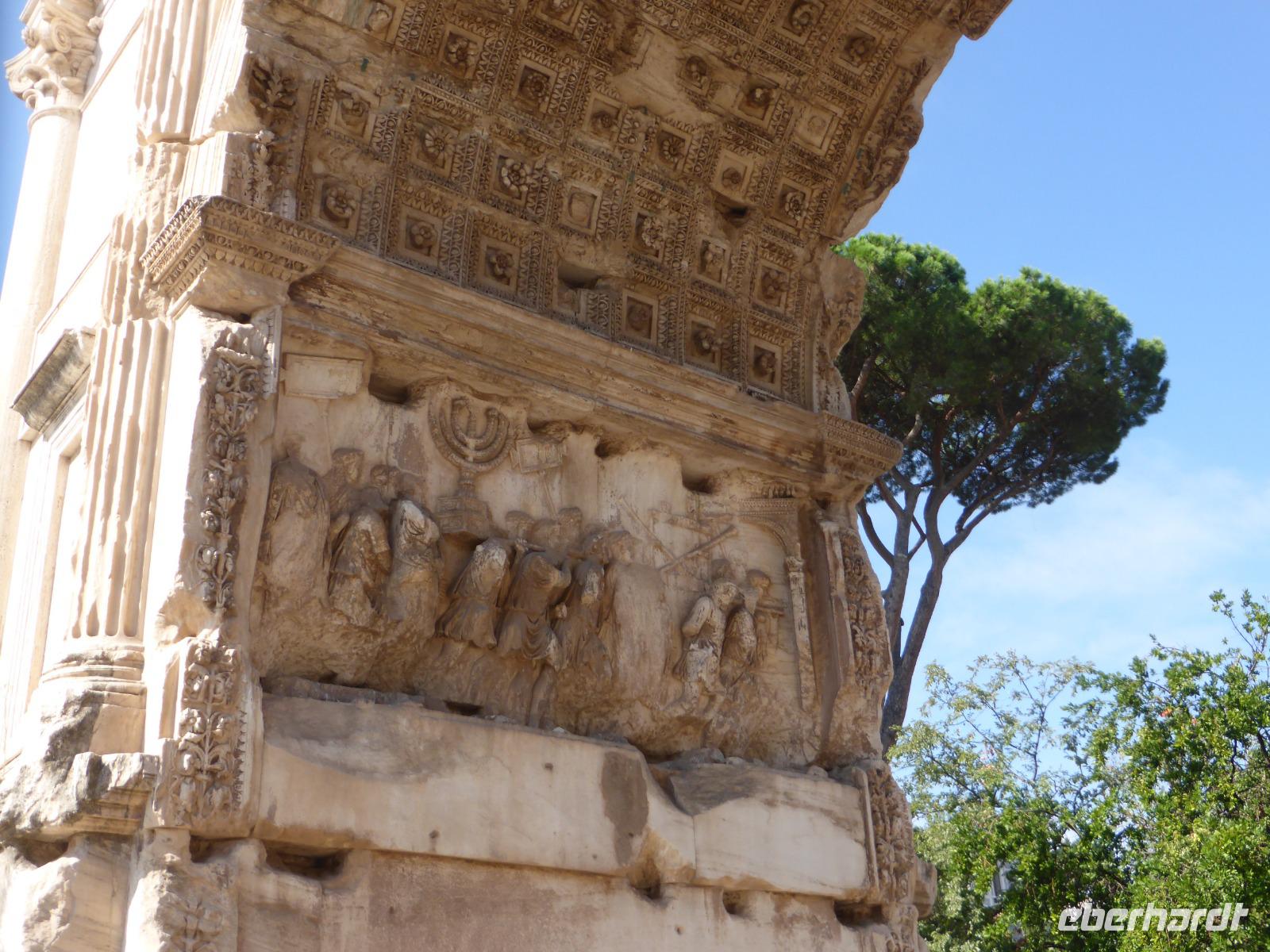 Unter den roten Blutpflaumenbäumen, die im Februar blühen und später kleine Pflaumen tragen, gehen wir entlang zur Metro. Mit Umstieg am Hauptbahnhof Termini stehen wir bald direkt an der markanten Ruine des Kolosseum, einem der sieben Weltwunder, etwa in der Mitte der sieben Hügel auf denen Rom erbaut ist. Bis zu fünfundzwanzigtausend Besucher besichtigen das Bauwerk täglich, so auch wir. Die Einführung, die uns Sylvia vorher gegeben hat, hilft bei der Vorstellung des Ganzen. Vorbei am Triumphbogen Konstantins wartet der nächste Höhepunkt auf uns: das Forum Romanum, das wichtigste archäologische Ausgrabungszentrum Roms. Es war Mittelpunkt des damaligen politischen, wirtschaftlichen, kulturellen und religiösen Lebens und Ort vieler öffentlicher Gebäude und Denkmäler.
