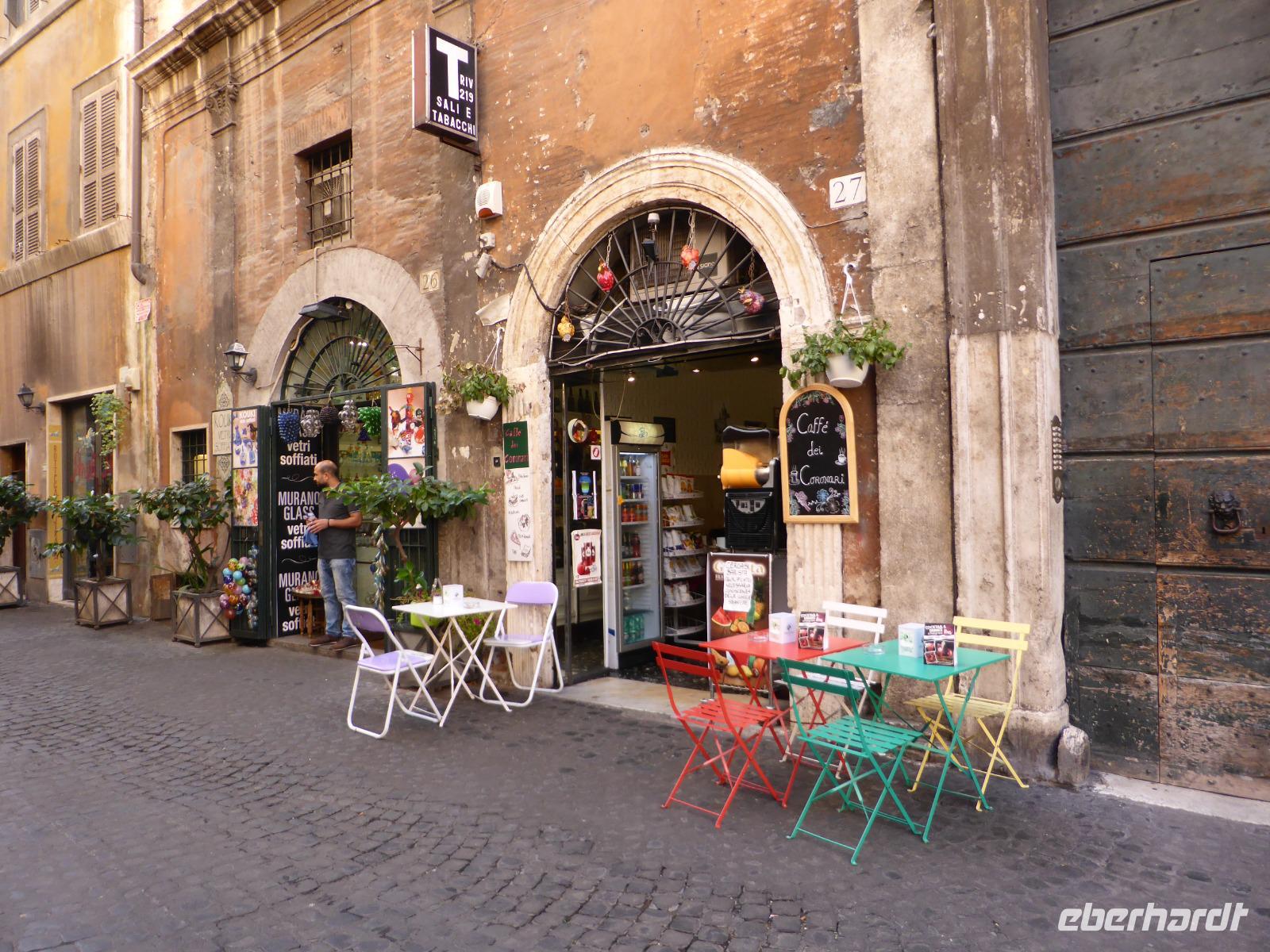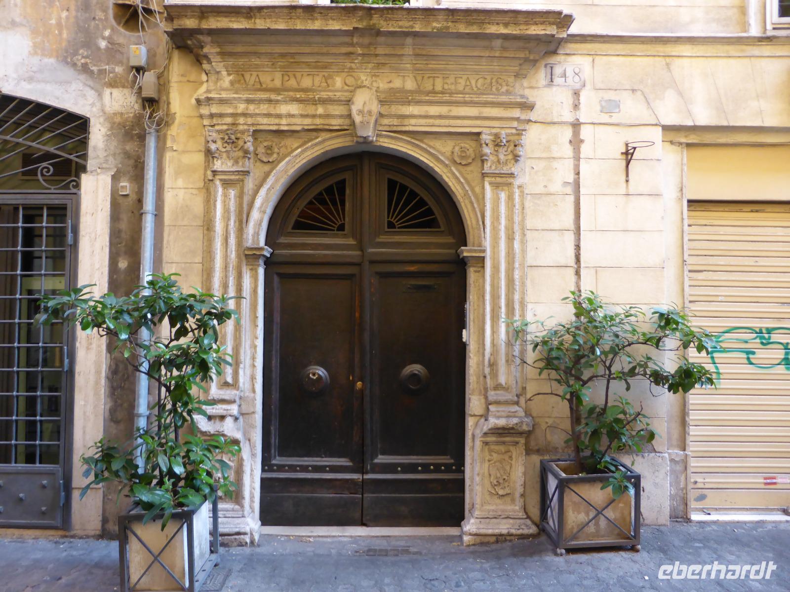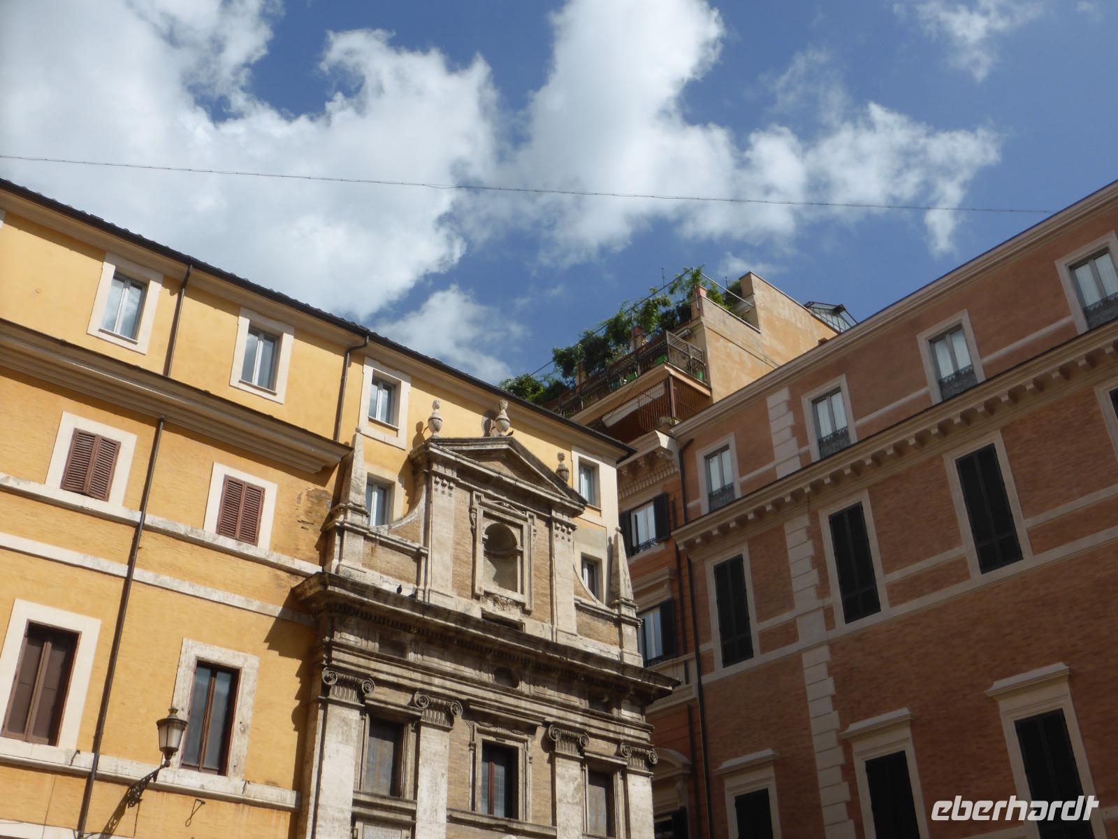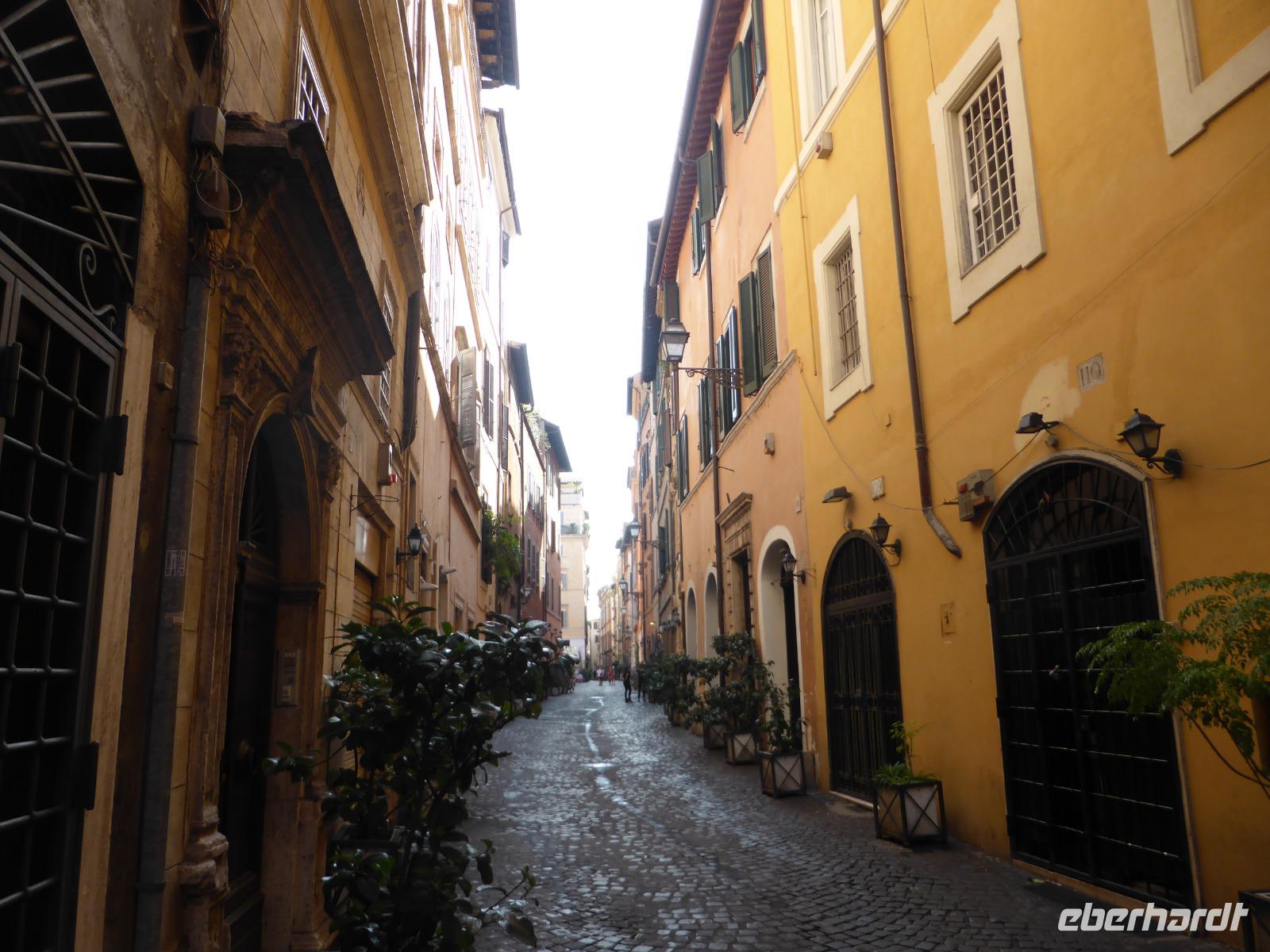 Die Via dei Coronari, ist eine schmale Straße mit ganz altem Kopfsteinpflaster, eine area pedonale, eine Fußgängerzone mit Häuserzeilen mit alten Portalen und Restaurants, Cafes und Antiquitätenläden. Idyllisch und für den Dreh von Filmszenen geeignet. Am Ende der Straße wird der Blick zum Justizpalast frei. Ein kolossales Gebäude aus römischem Travertin.