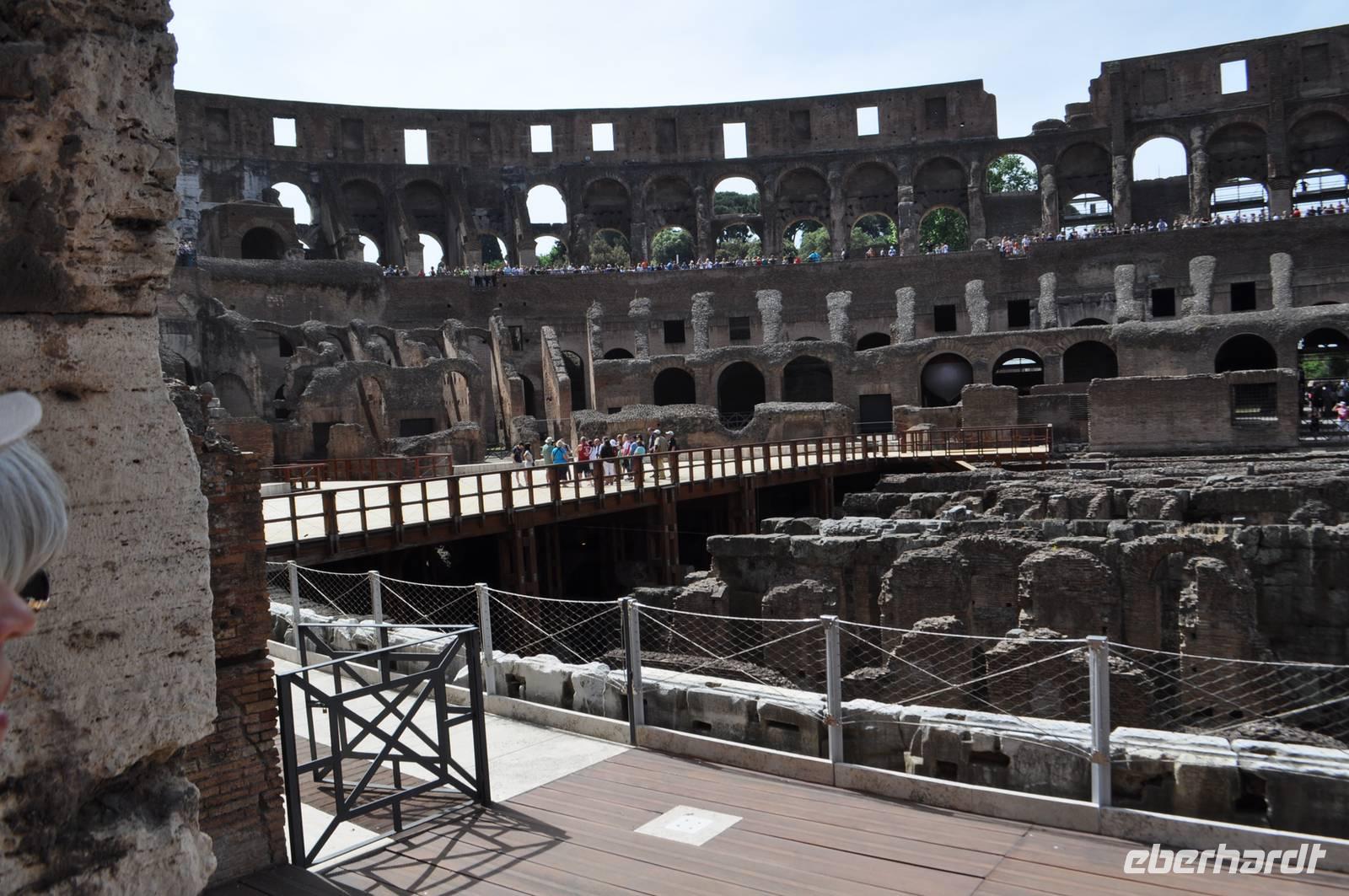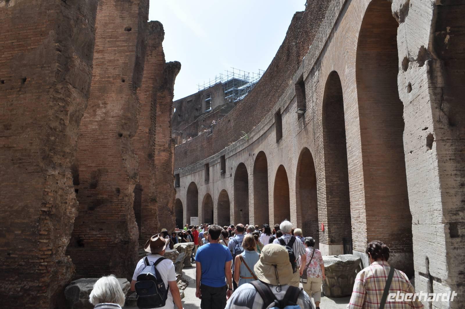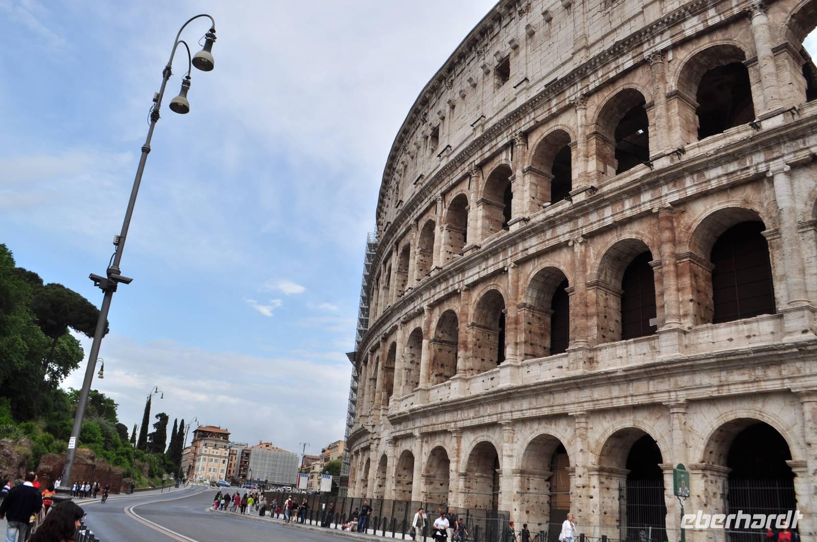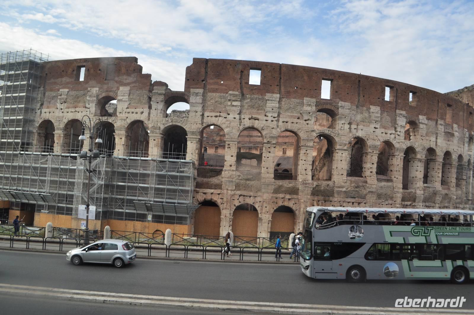 Am Morgen treffen wir uns mit unserer Stadtführerin Sylvia am Kolosseum. Auf dem Weg dorthin über die Station Termini wird in der Metro das erste Portmonee dieser Reise gestohlen. Zum Glück keine Papiere. Bei herrlichem Sommerwetter starten wir unseren Rundgang im antiken Rom mit dem Besuch im Kolosseum. Die größte römische Arena konnte in 15 Minuten besetzt und auch wieder geräumt werden und ist noch heute Vorbild für den ein oder anderen Stadienneubau.