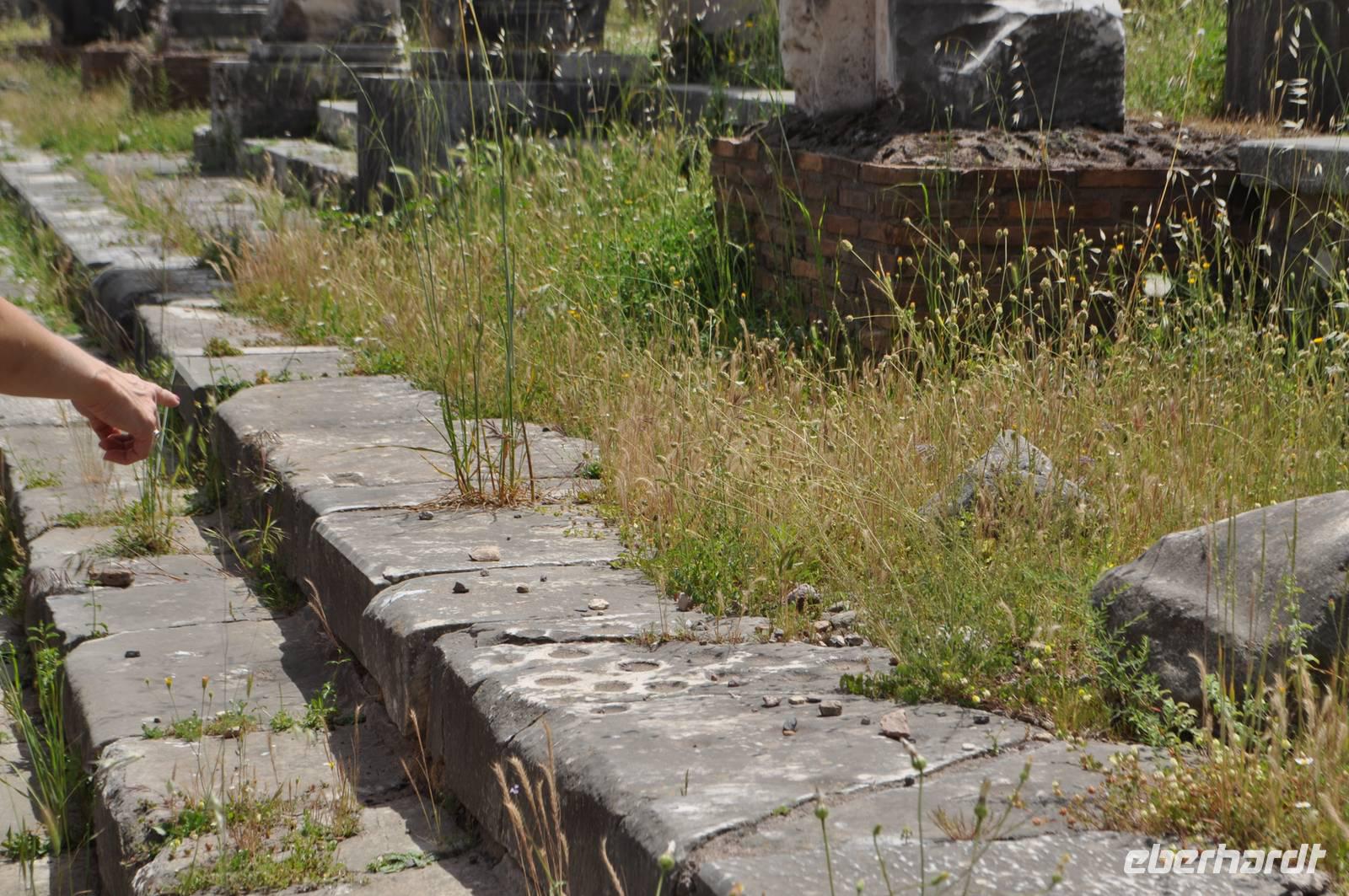 Auf den Stufen des Senats sind sogar noch antike Spielbretter erhalten, falls die Reden doch wieder einmal länger dauerten.